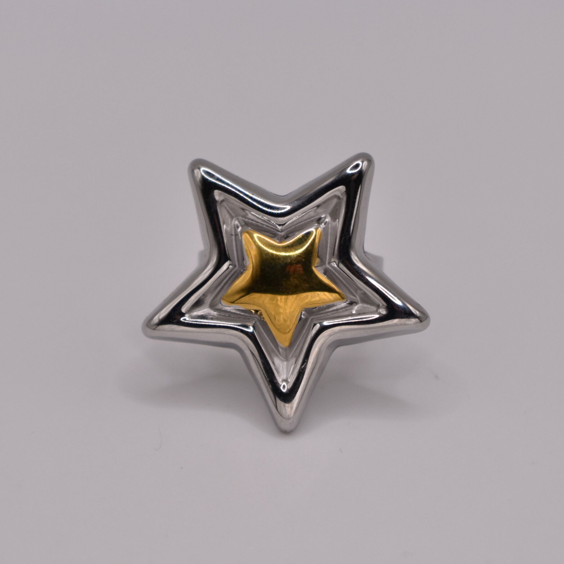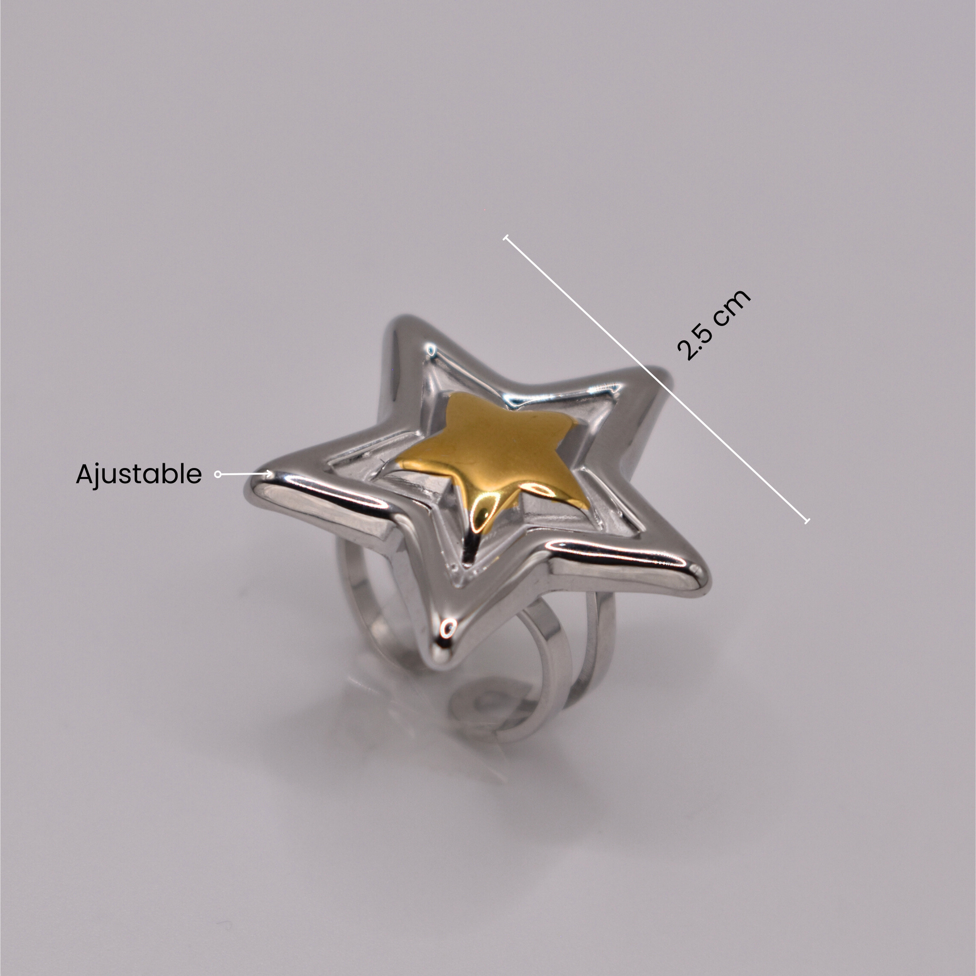 Alysa es un icónico anillo chunky con una estrella enorme plateada y centro dorado, que combina fuerza y brillo para destacar en cualquier ocasión.