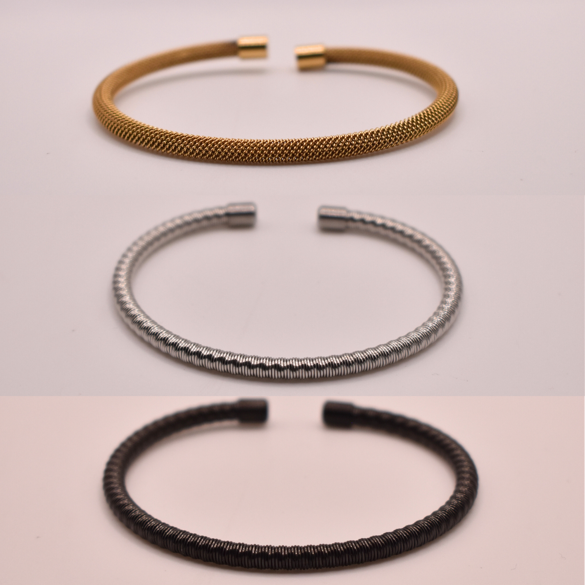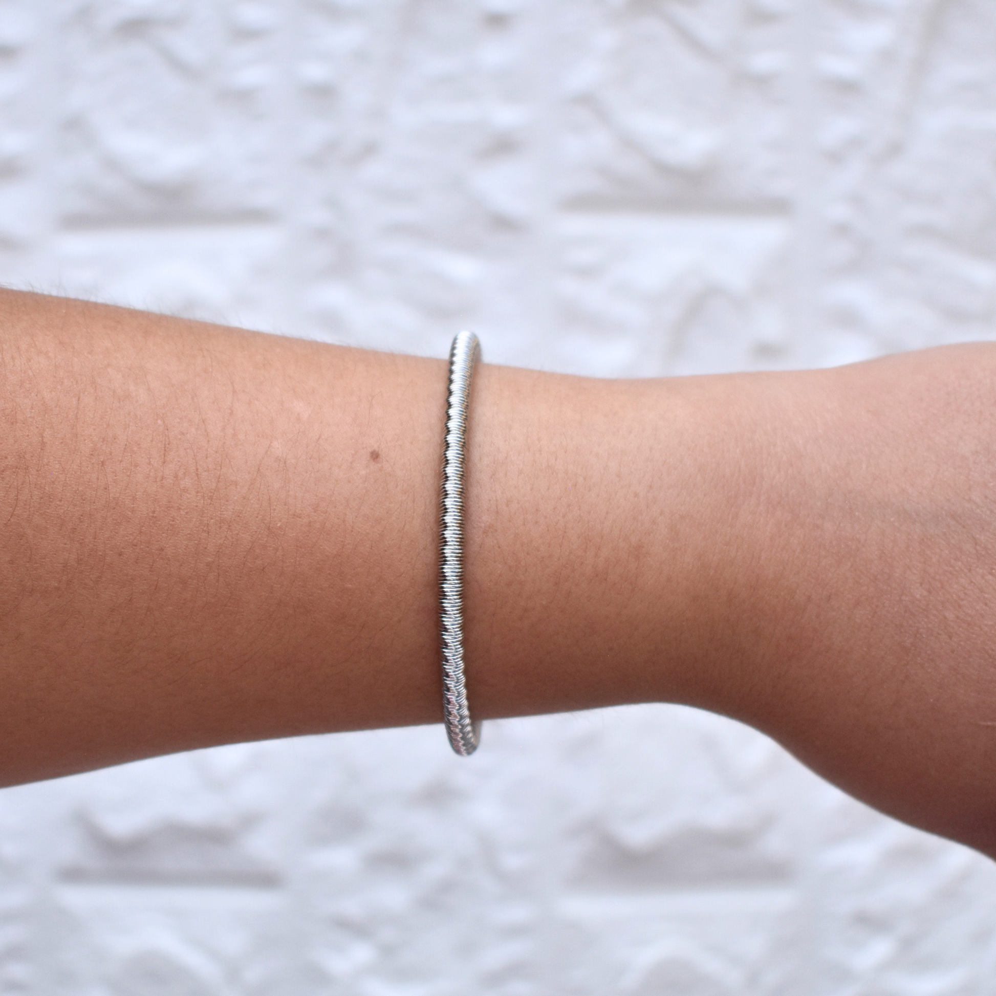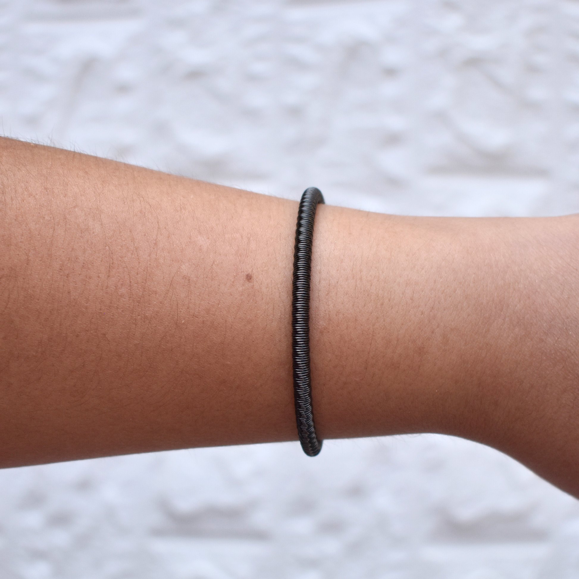 La pulsera ajustable Antíope es un básico unisex disponible en negro, dorado y plateado. Su diseño delgado y elegante se adapta perfectamente a la muñeca.