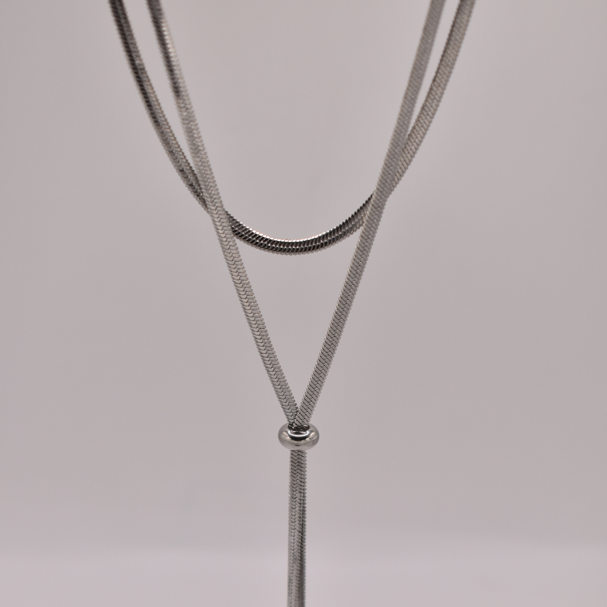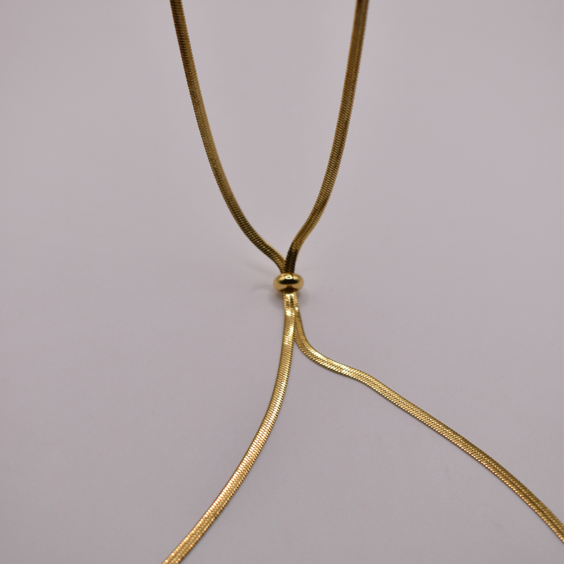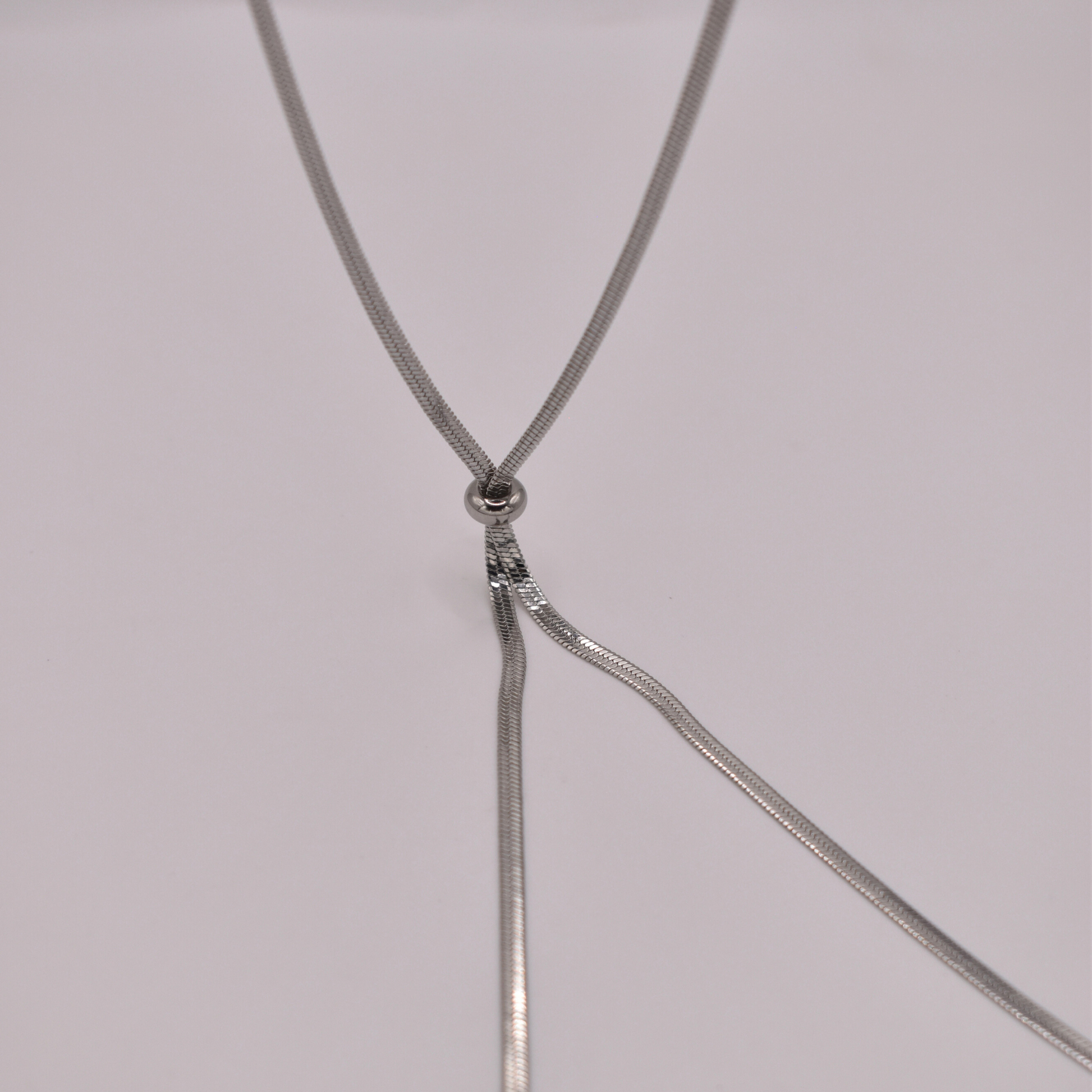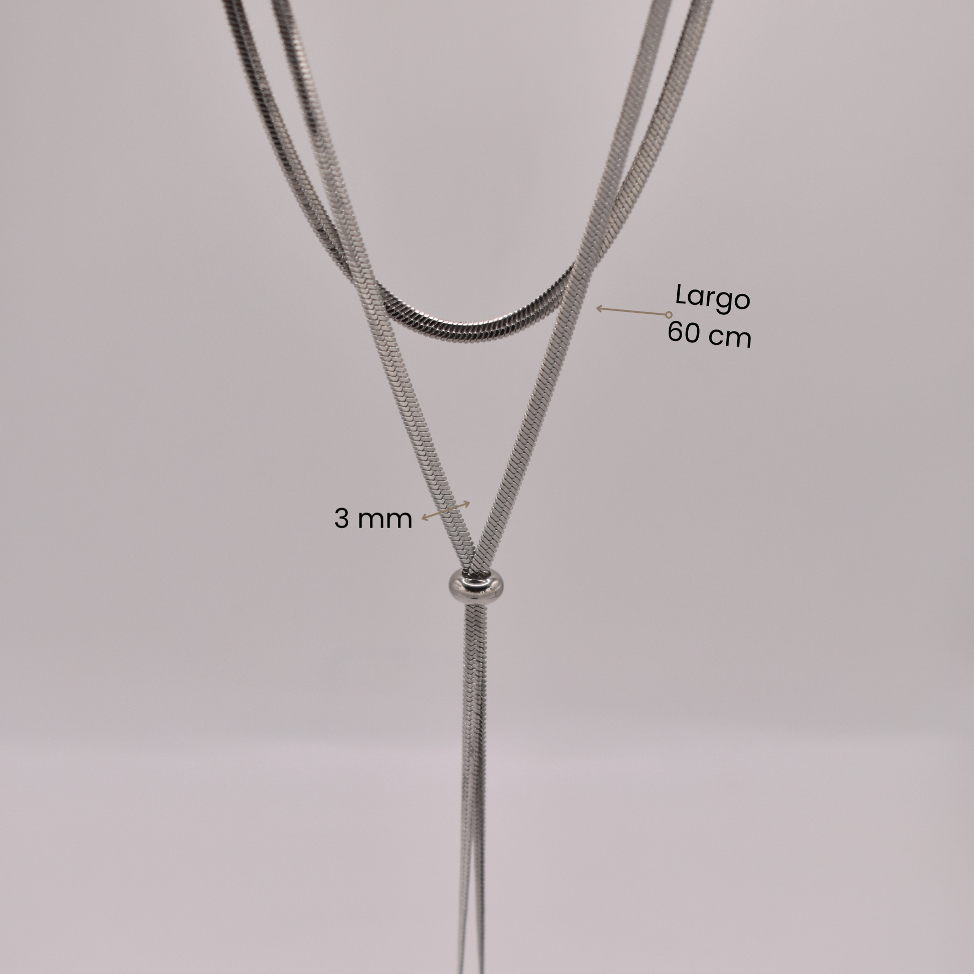 Corbatín Asclepio mide 60 cm disponible en dorado y plateado, con ajustador para formar nudos o loops creativos que imagines. Versátil para cualquier ocasión; combínalo con unos aretes minimalistas para un toque trendy y personalizado.