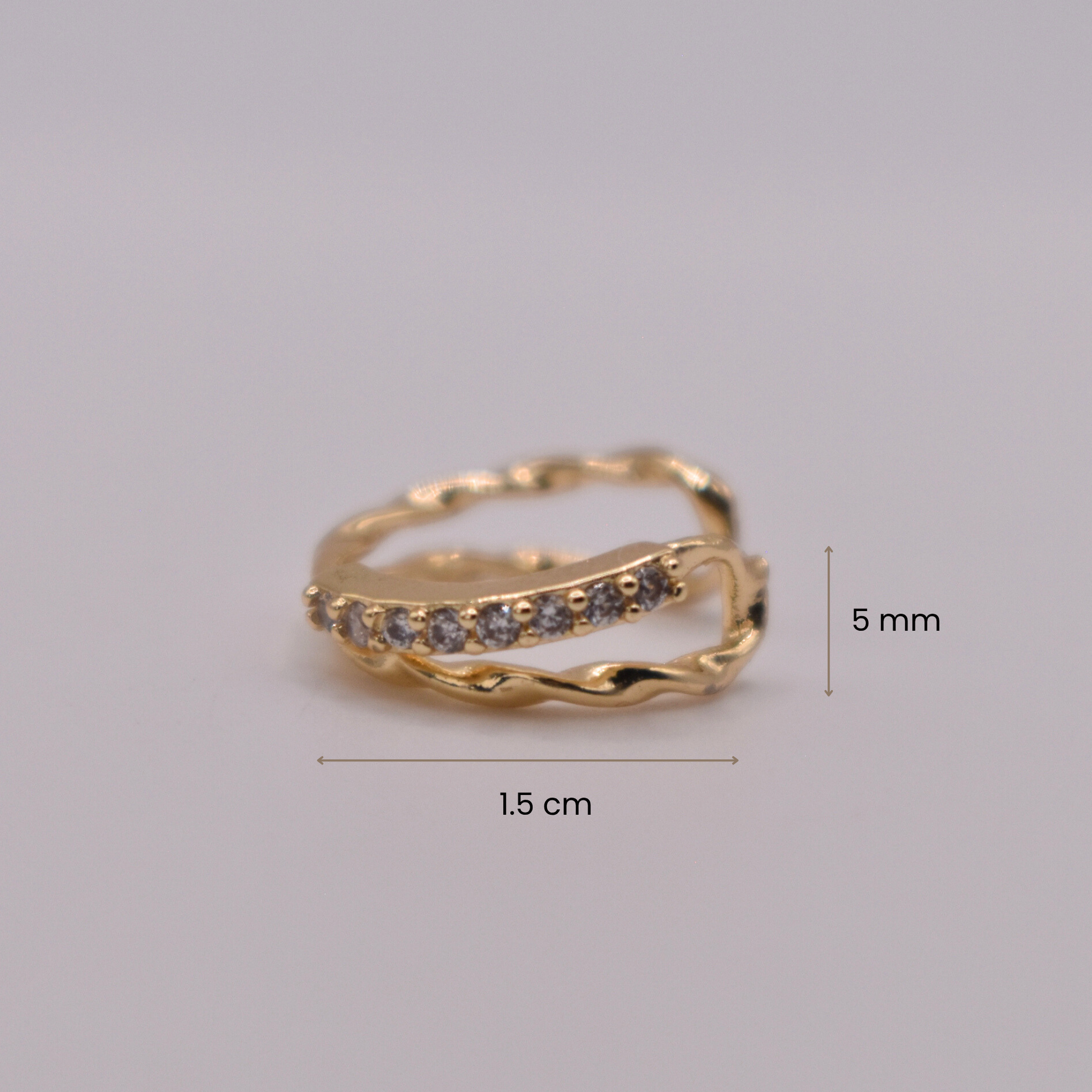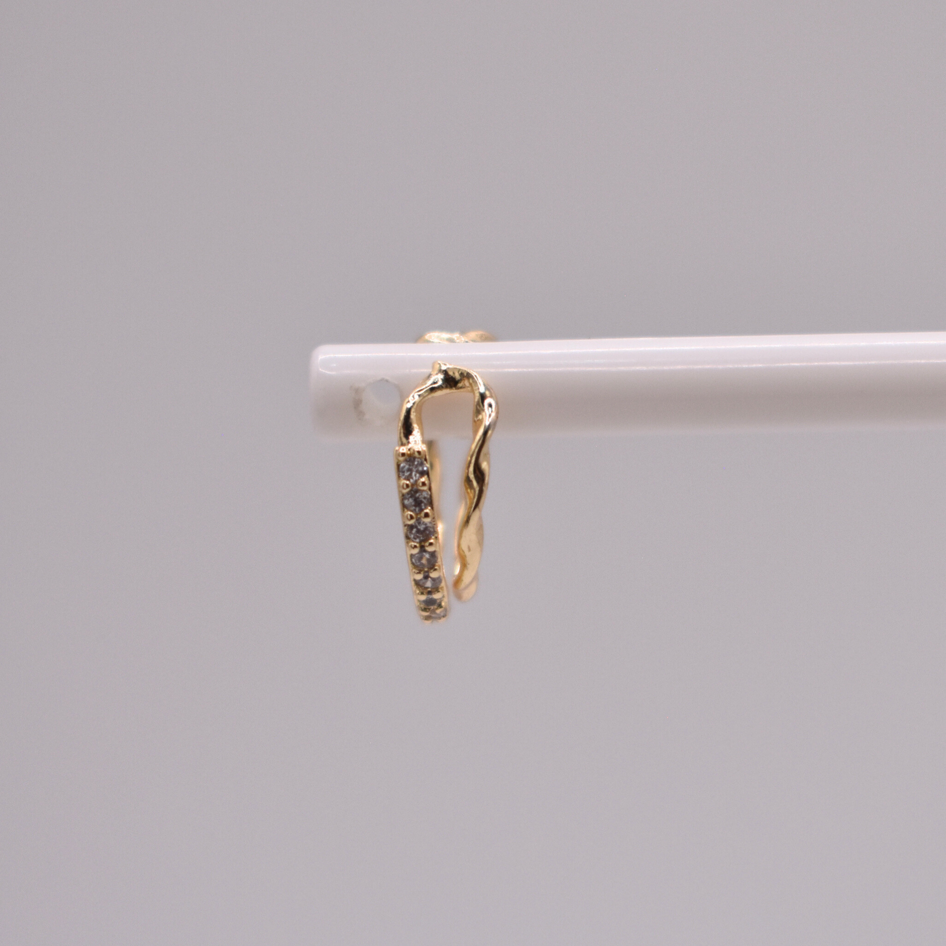 El earcuff Atenas presenta una línea de diamantes y otra con forma desigual, creando un contraste moderno en dorado.