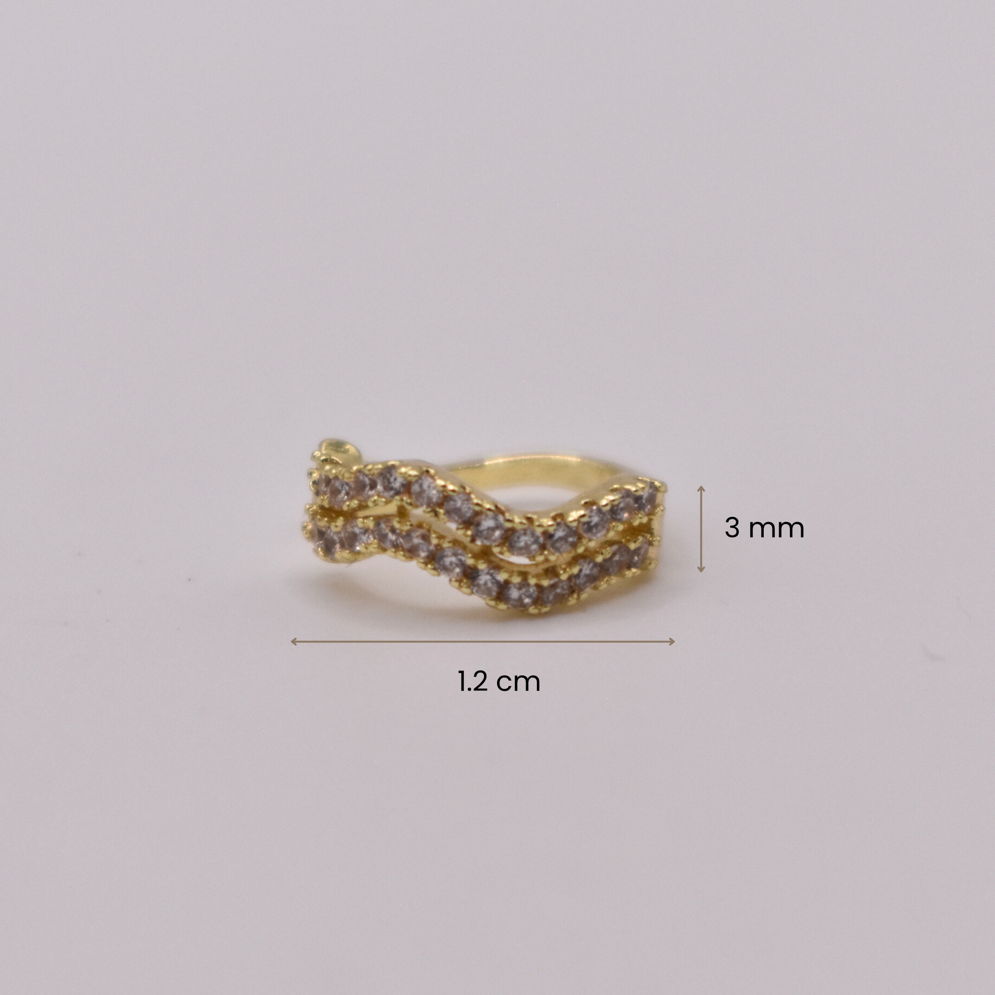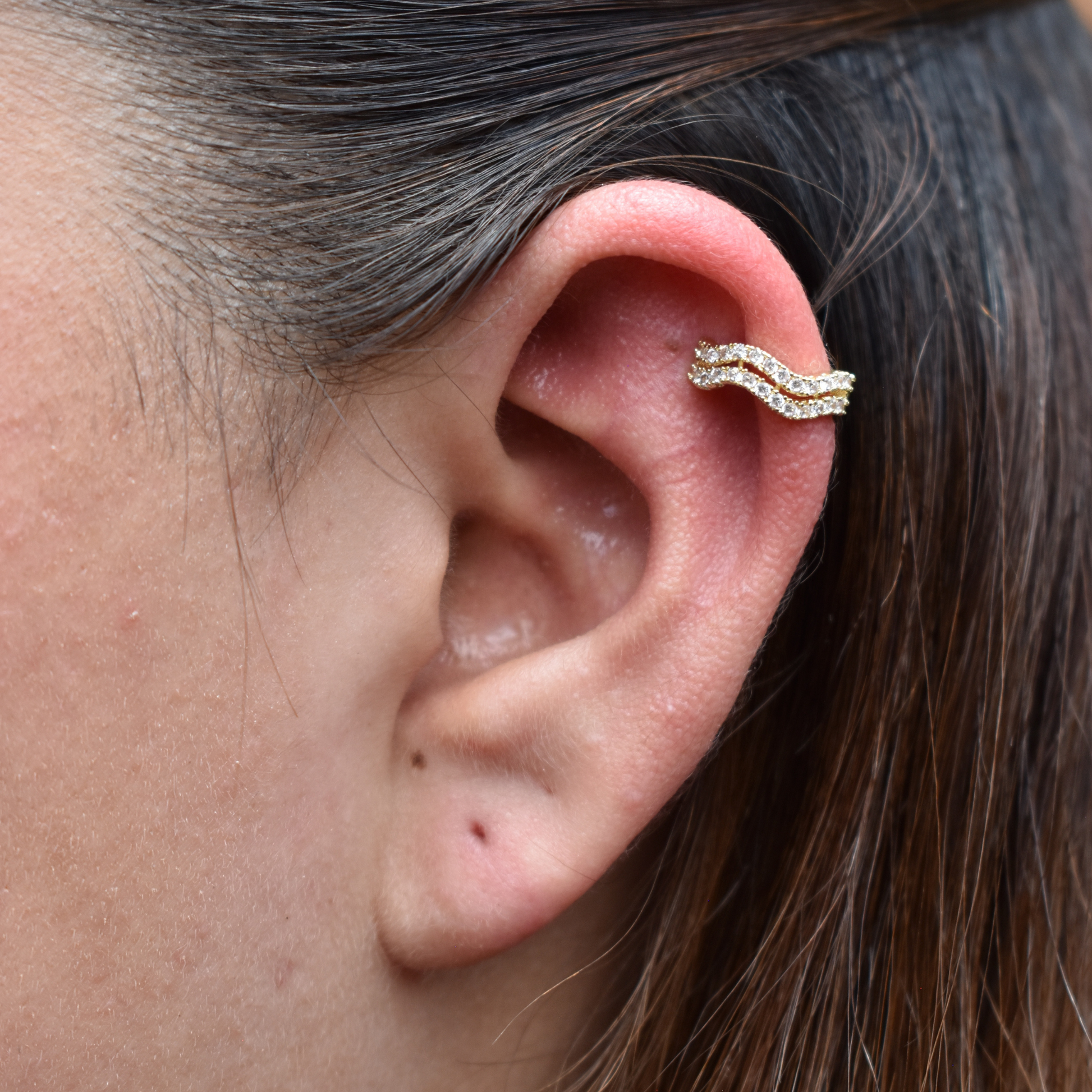 Sutil y elegante, el earcuff Calíope destaca por sus líneas de diamantes en dorado, ideal para un brillo delicado.