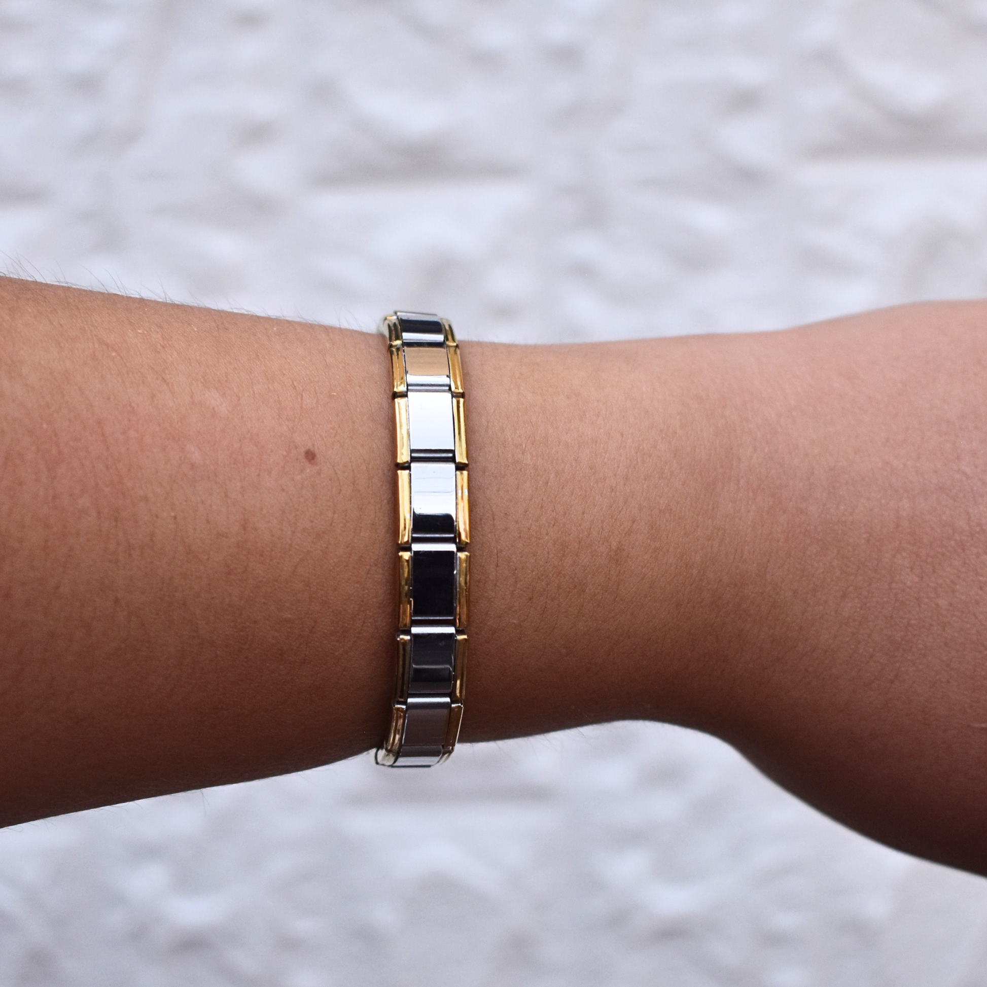 El brazalete italiano Ceres destaca por su diseño plateado con borde dorado. Un accesorio sofisticado con 19 eslabones que puedes ajustar a tu medida.