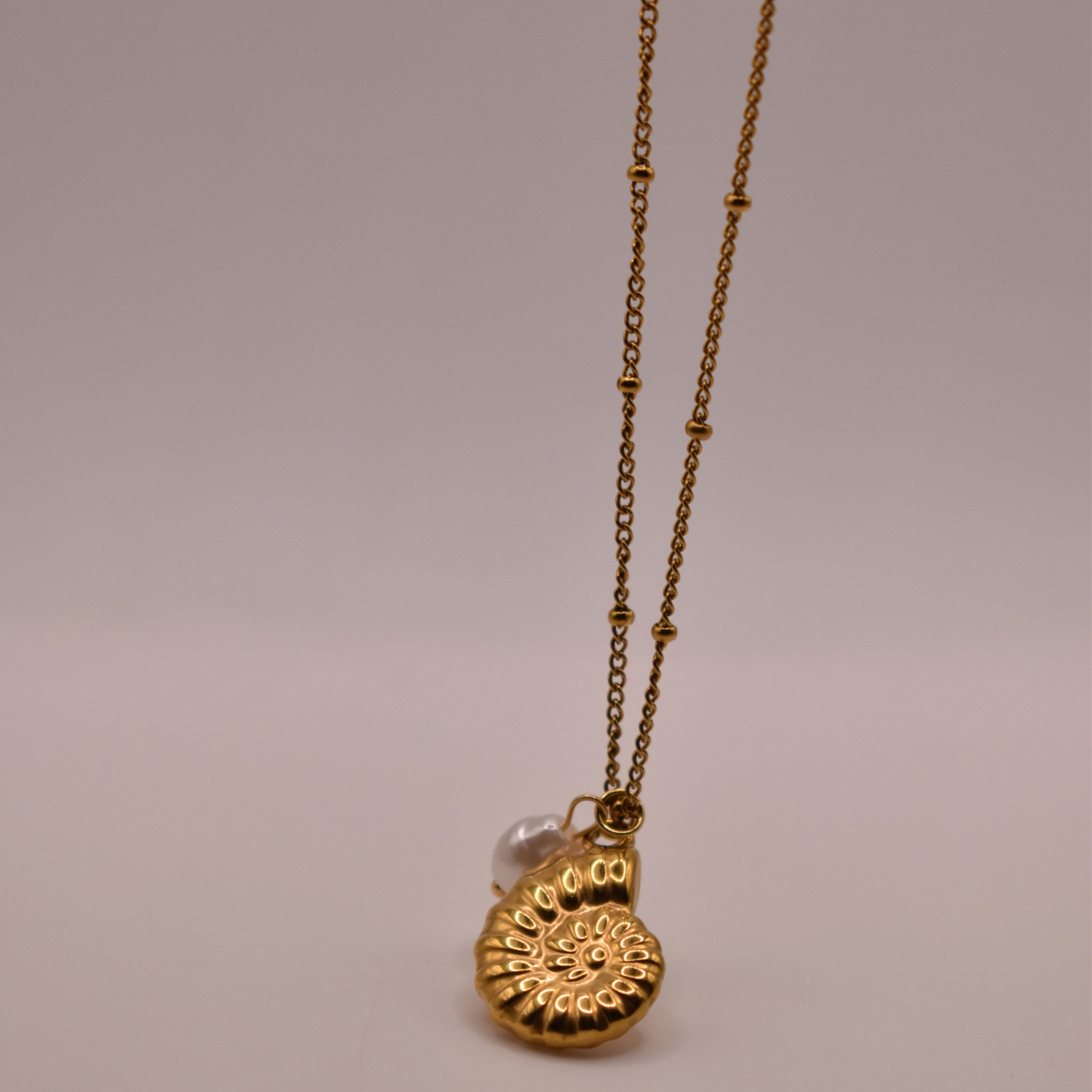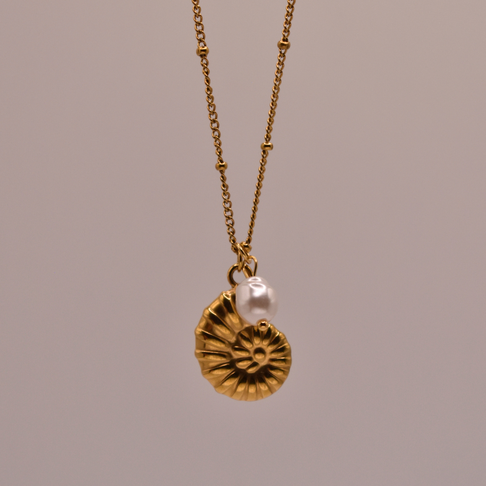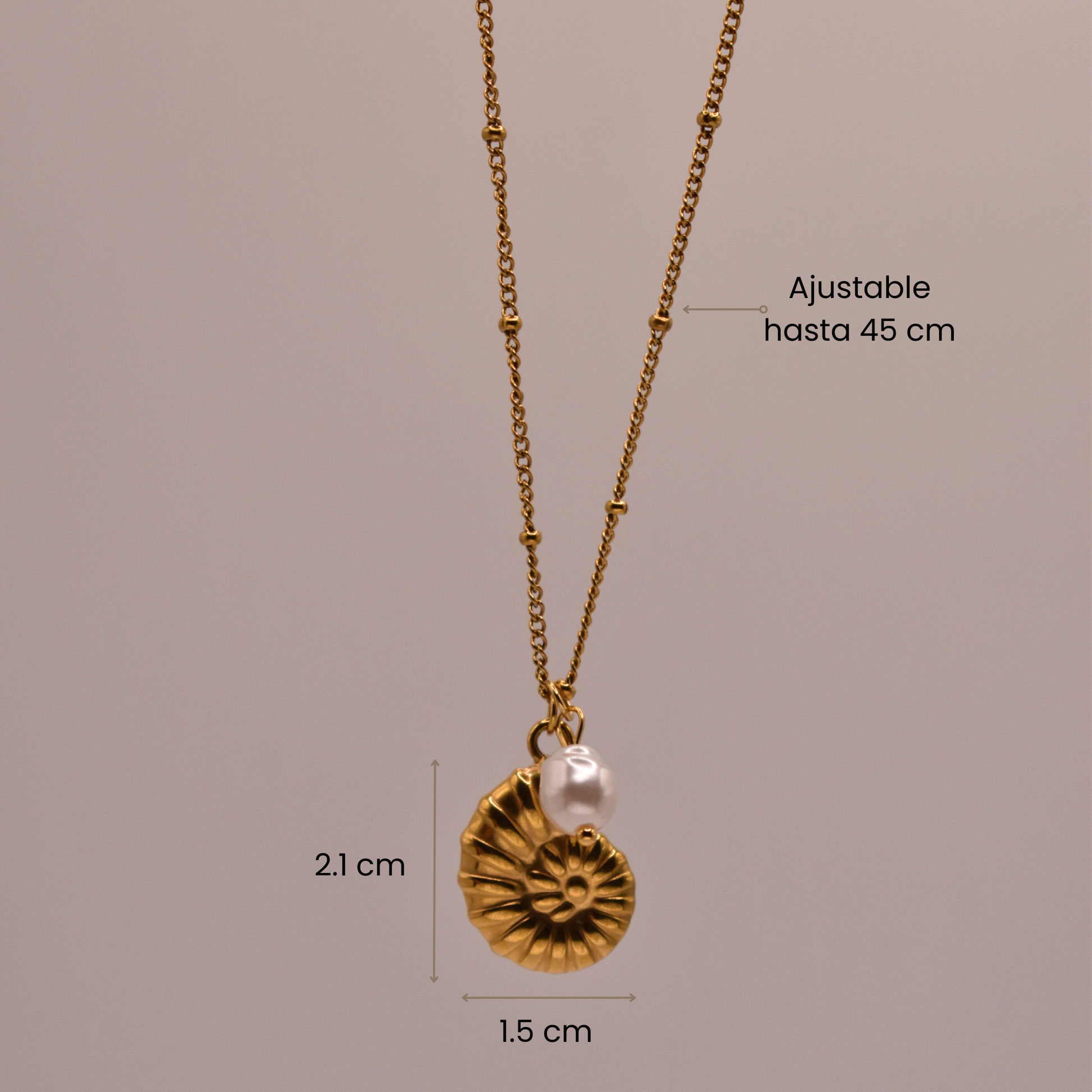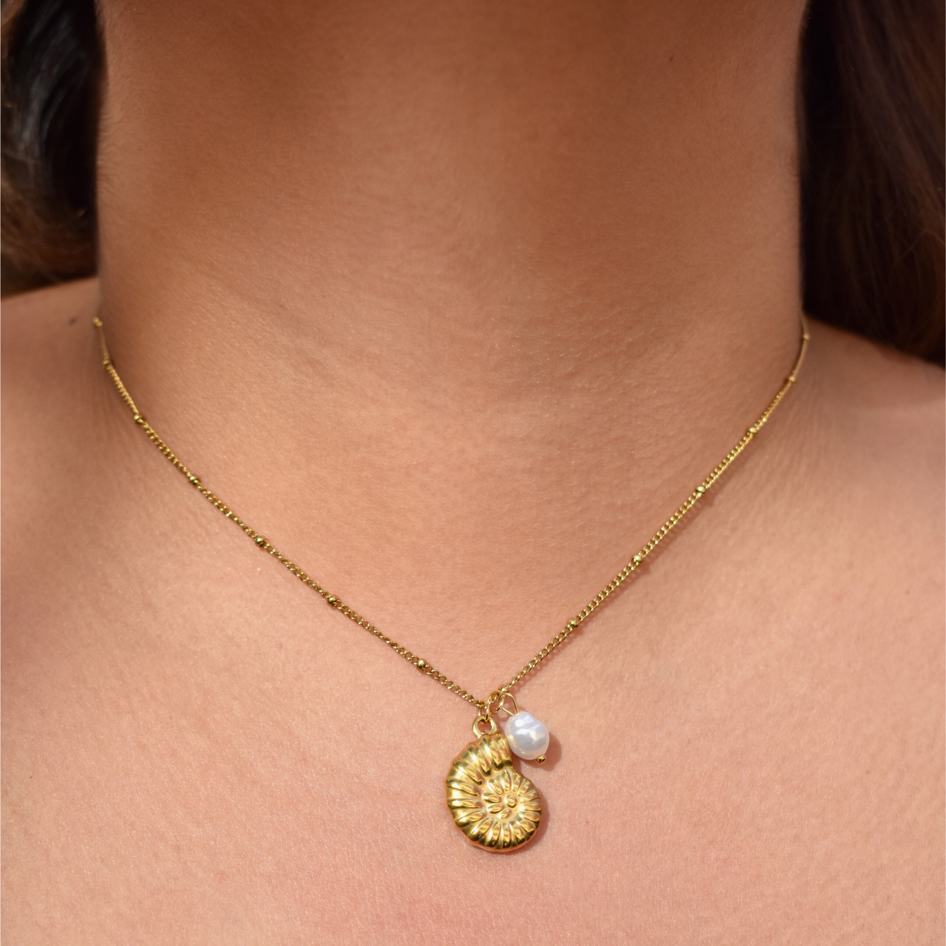 Collar con dije de caracol con figura de perla, Chloe es una mezcla de estilo marino con lujo, excelente en capas con más collares.