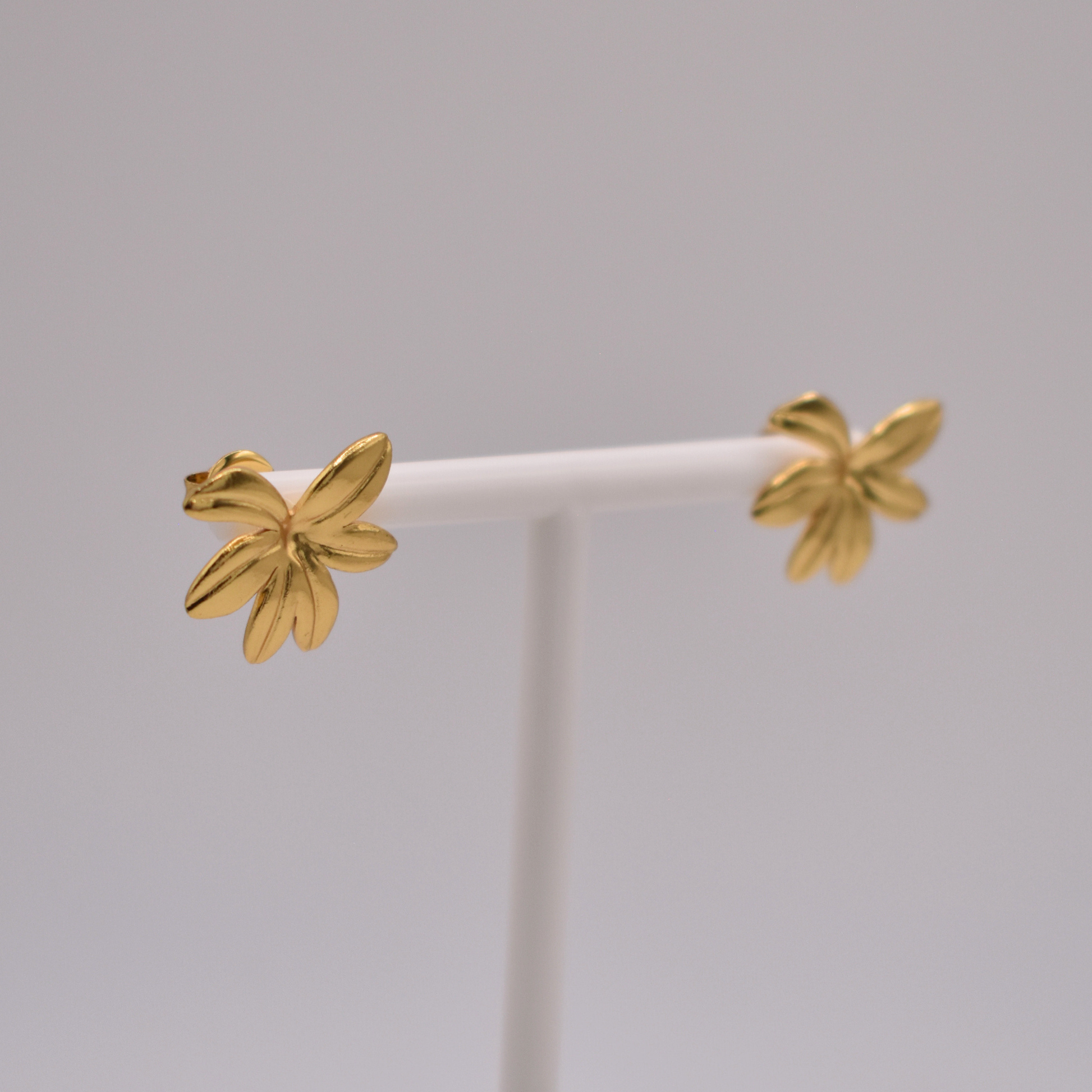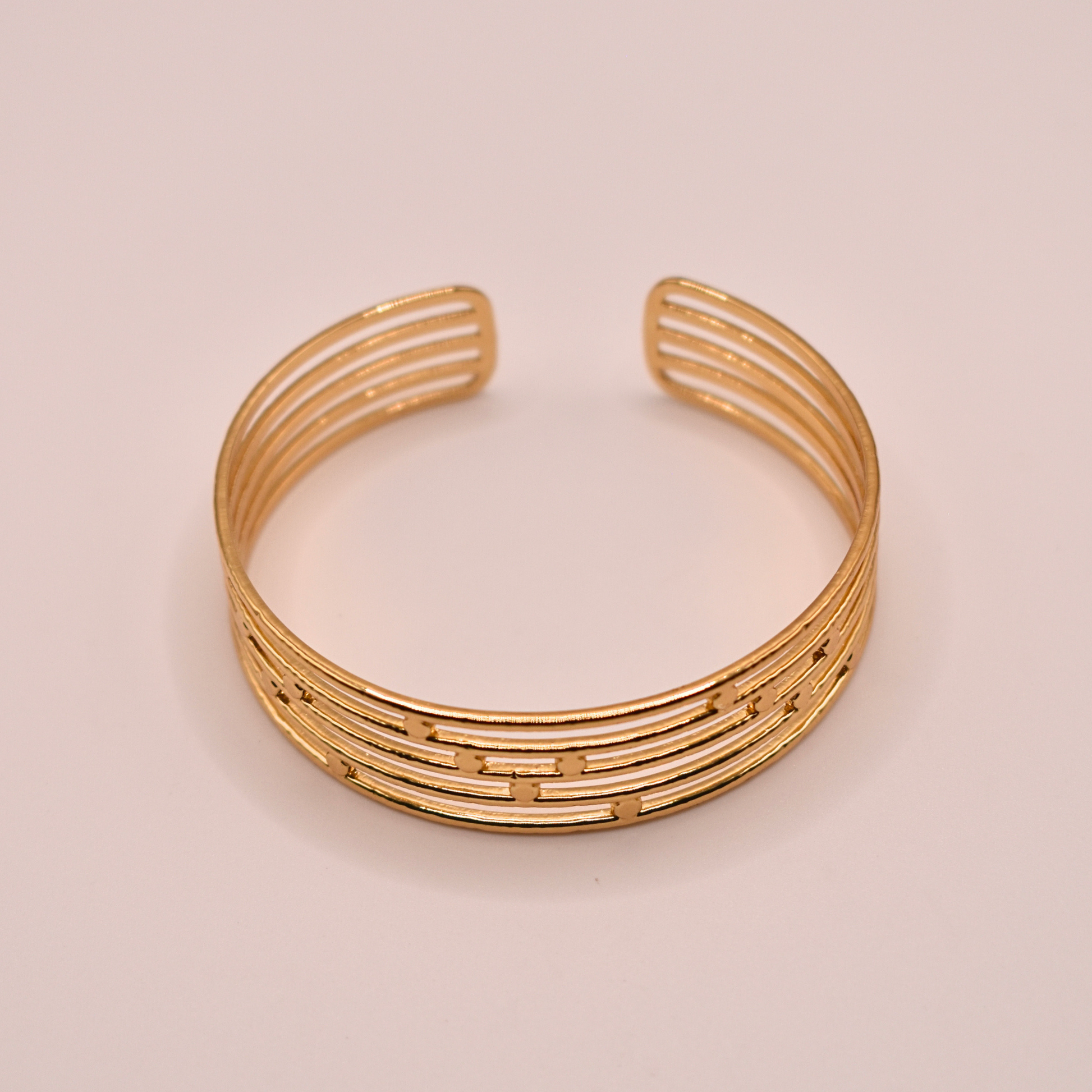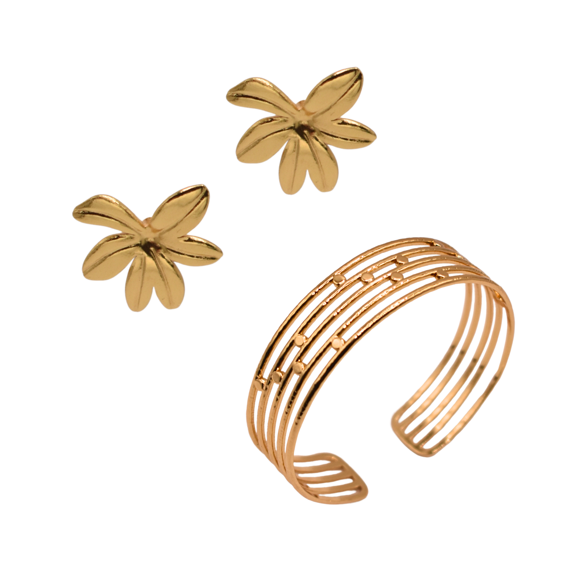 Tropical minimalista con el combo aretes Haty palmeras doradas y la pulsera Otis de bandas geométricas, fresco y contemporáneo al final.