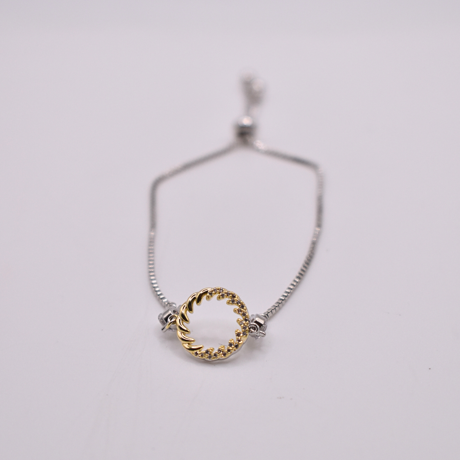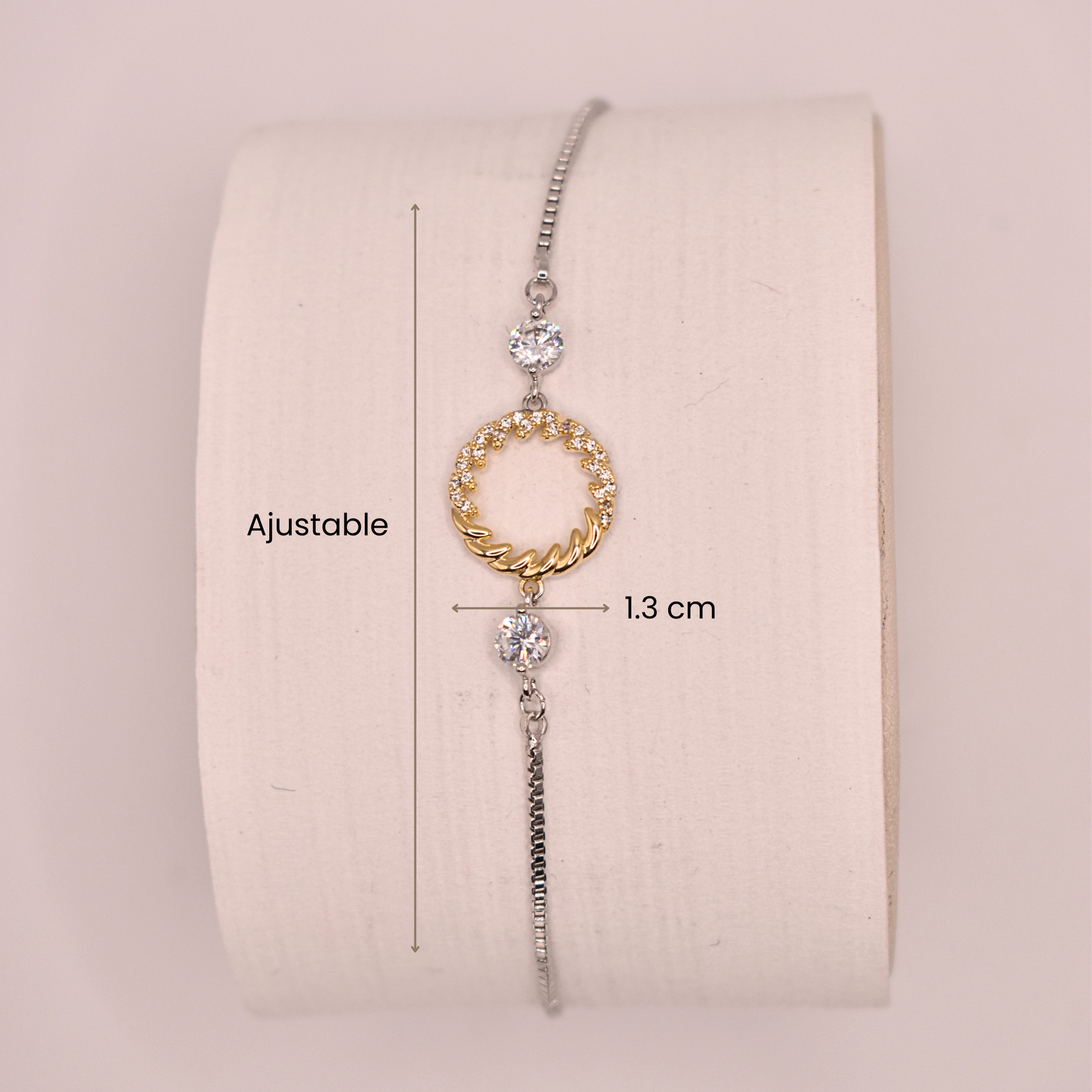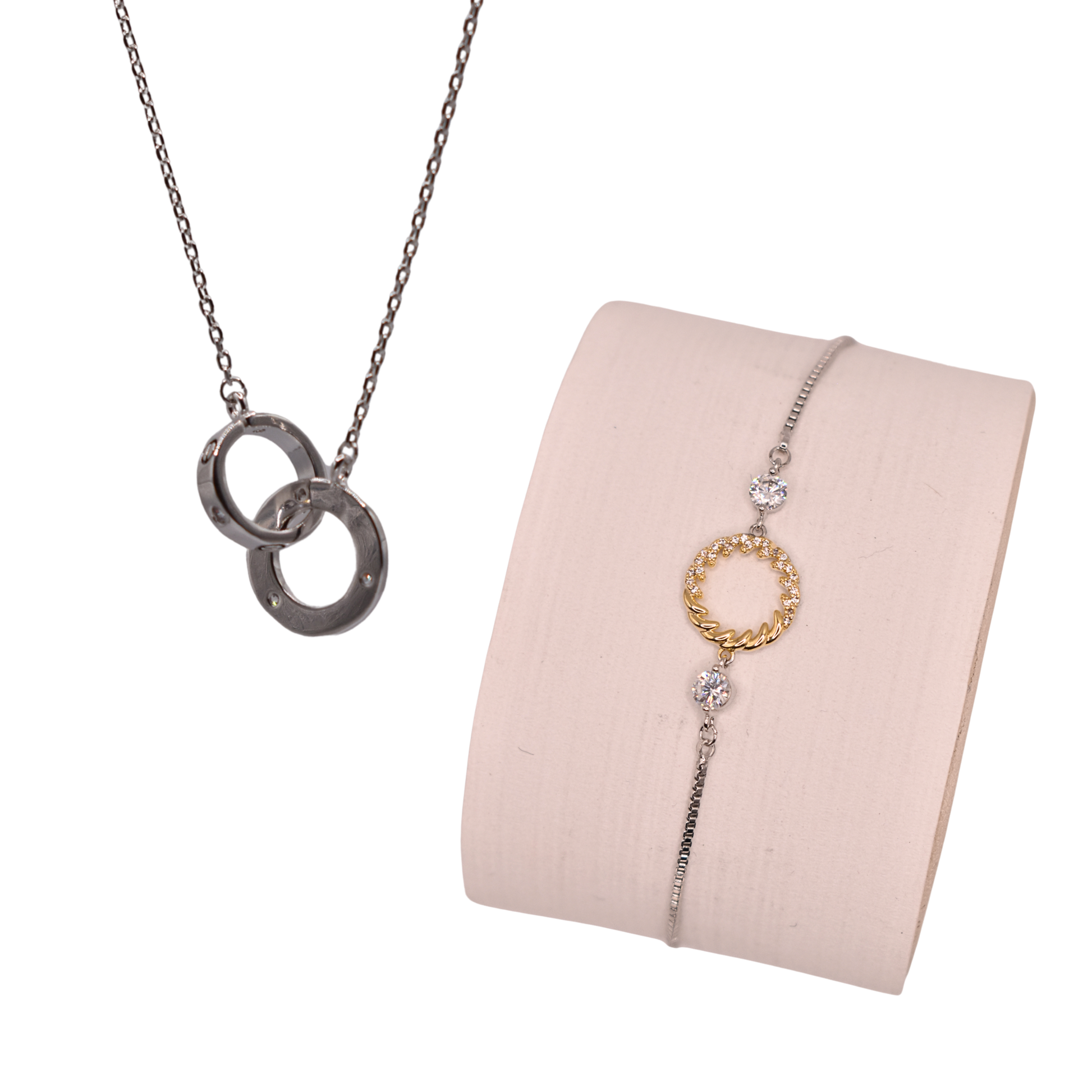 Delicado y moderno, este combo Tábata y Agam con pulsera dije cristales dorado/plateado y collar aros brillantes, perfecto para layering.