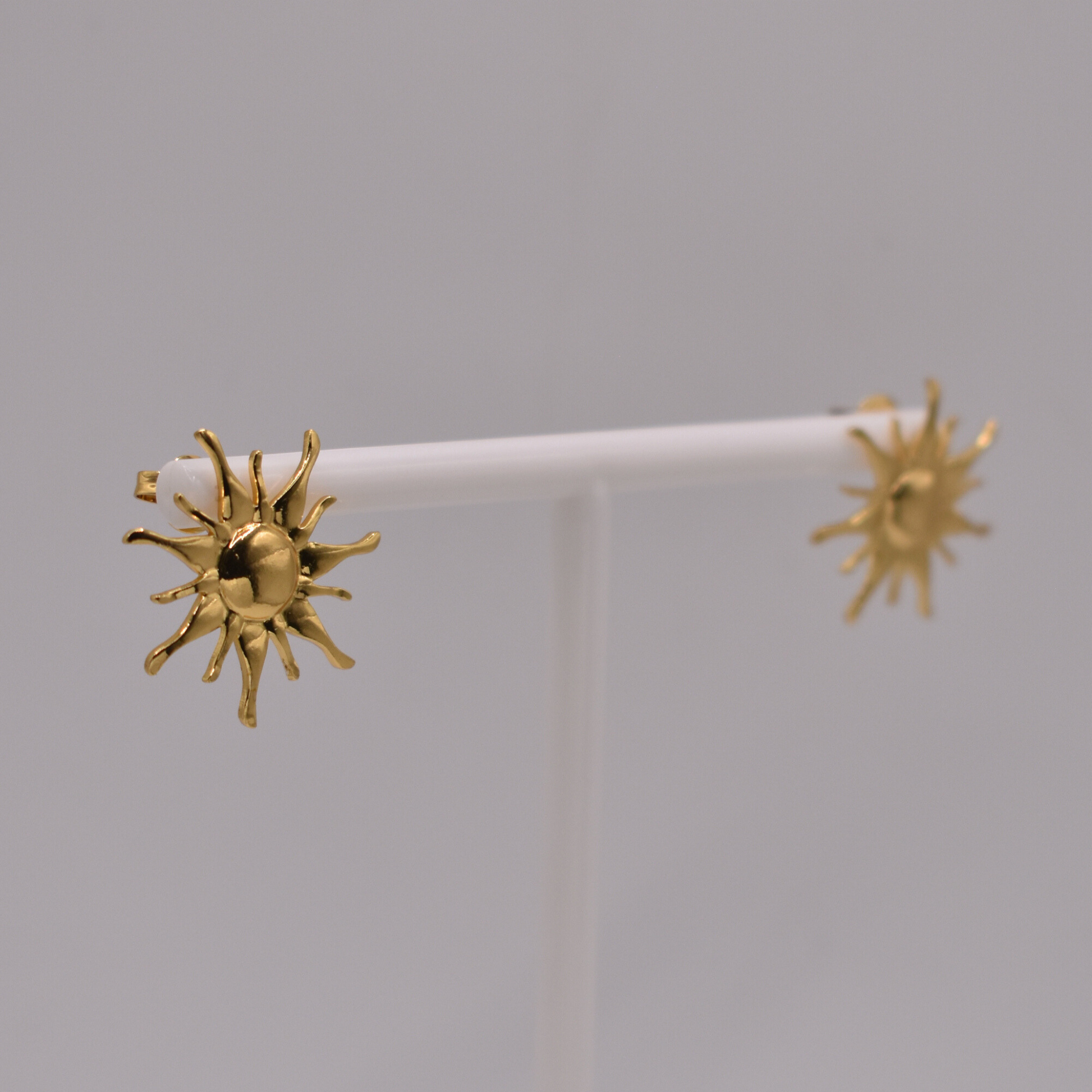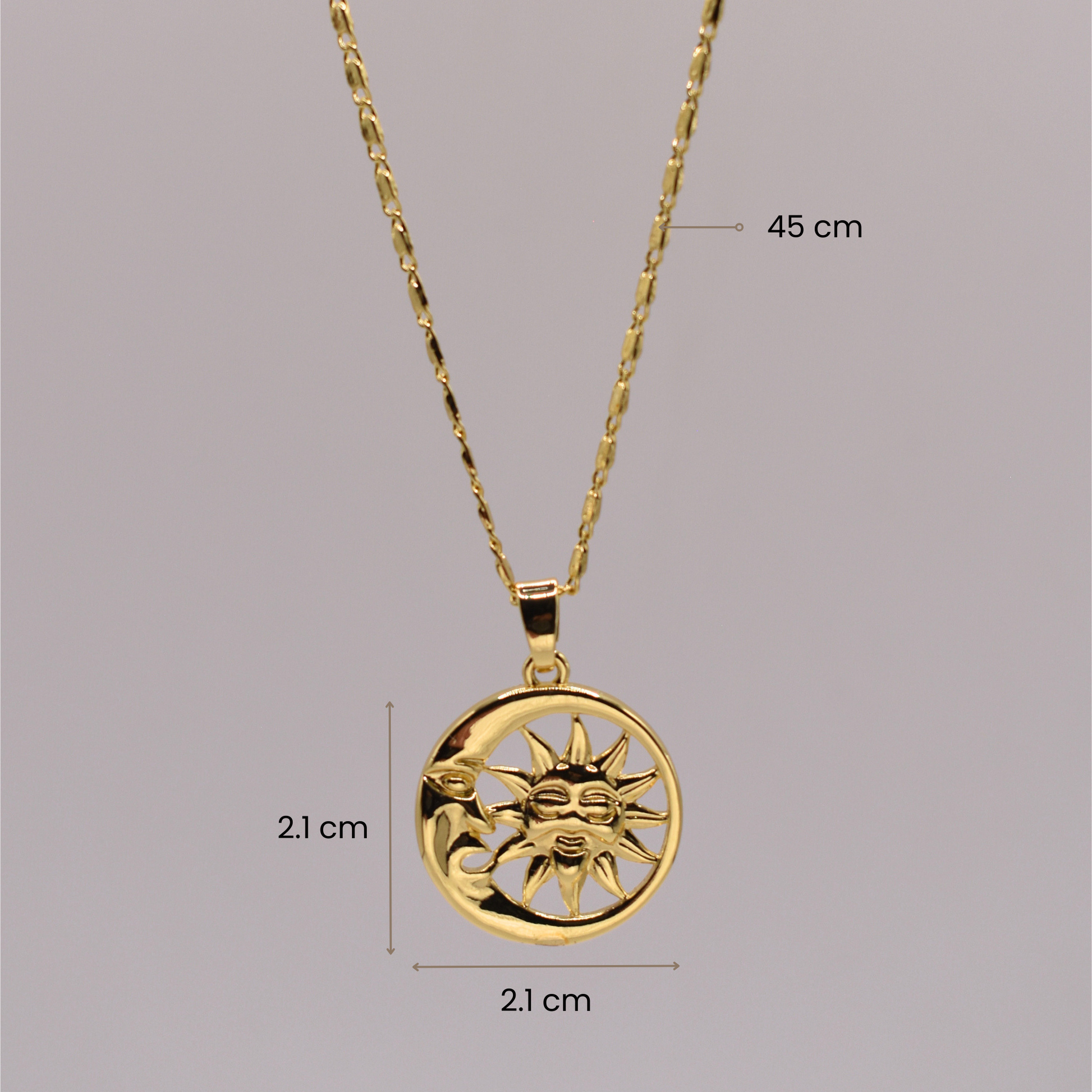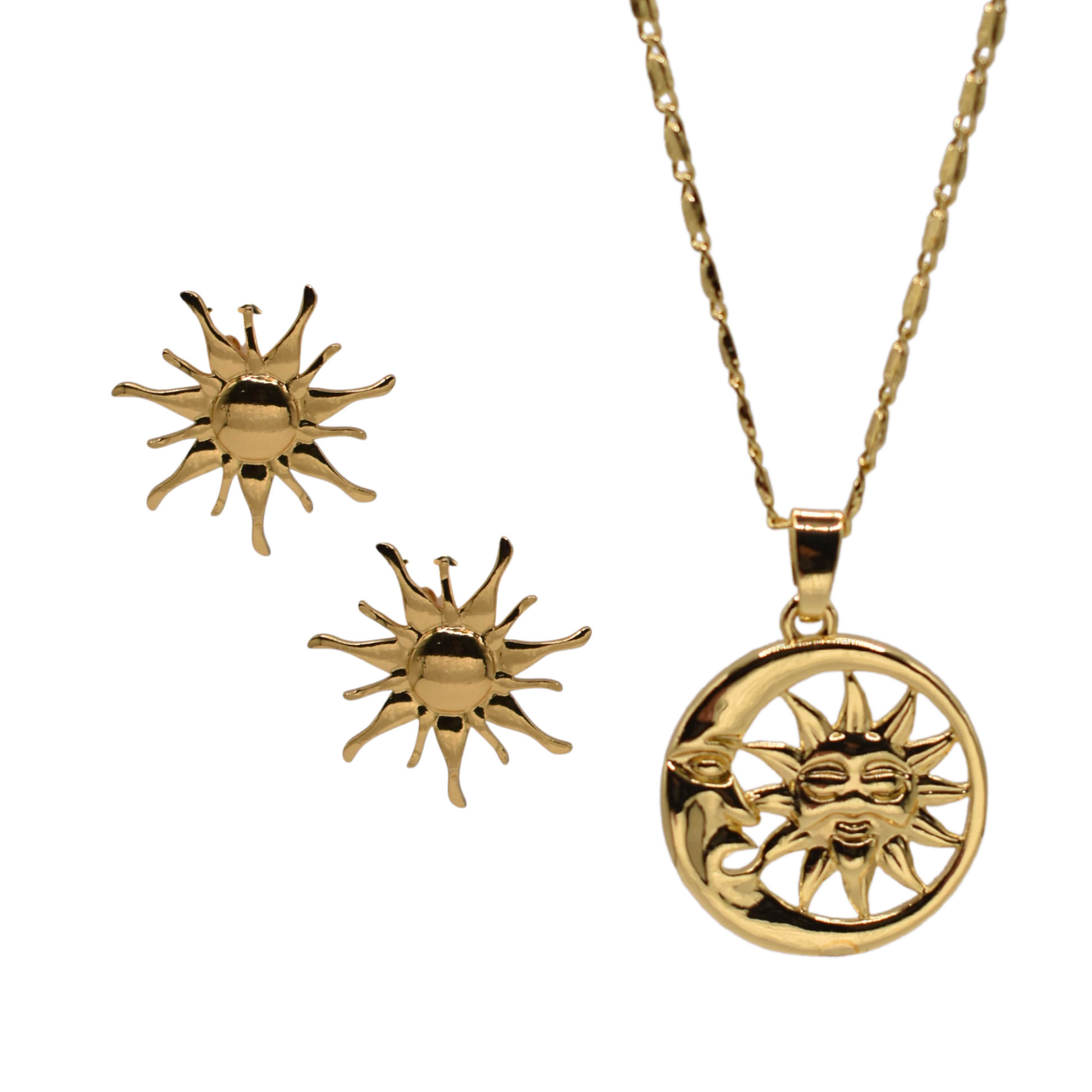 Bohemio y radiante, el combo Zeth y Calix fusiona aretes rayos solares dorados con collar sol y luna para looks simbólicos inolvidables.