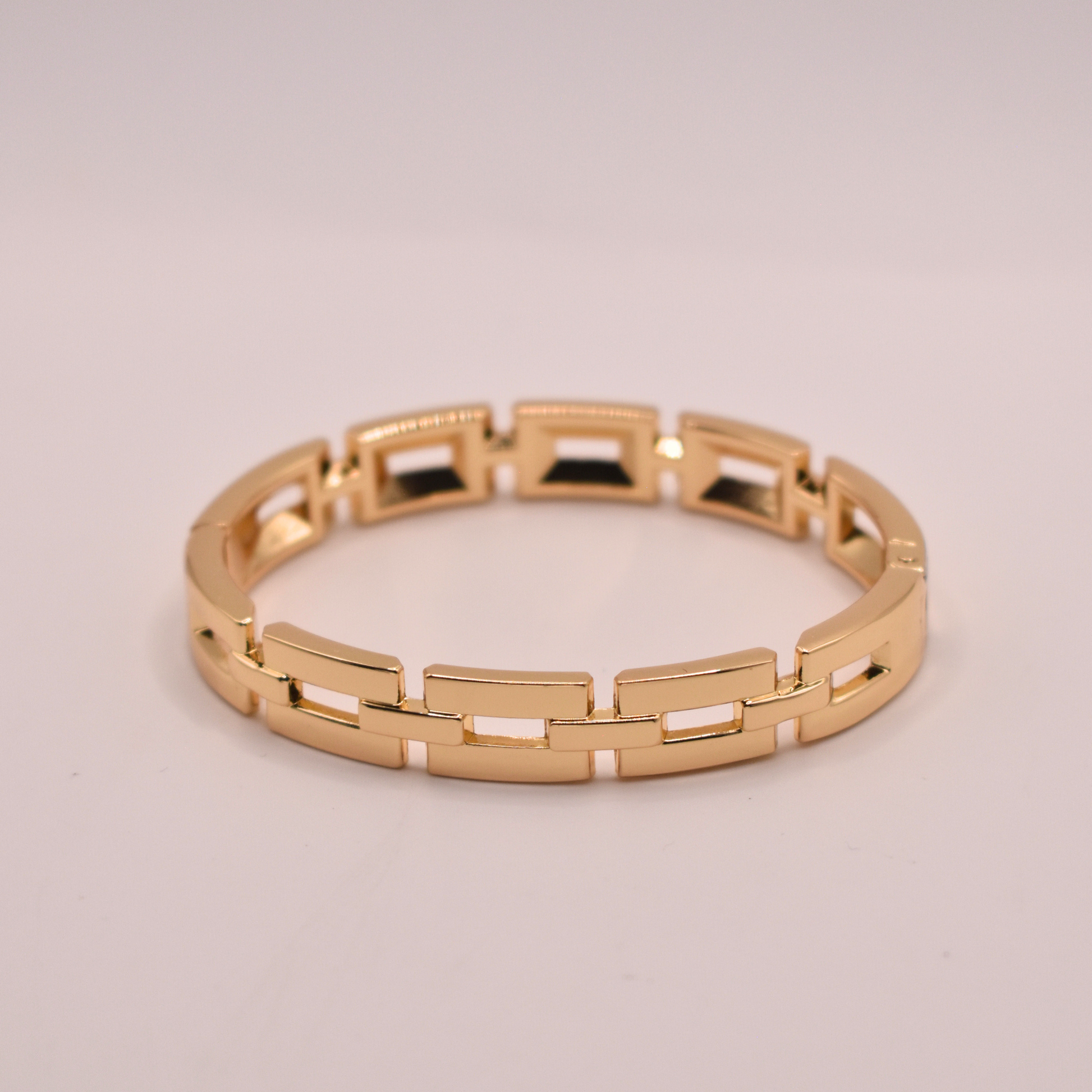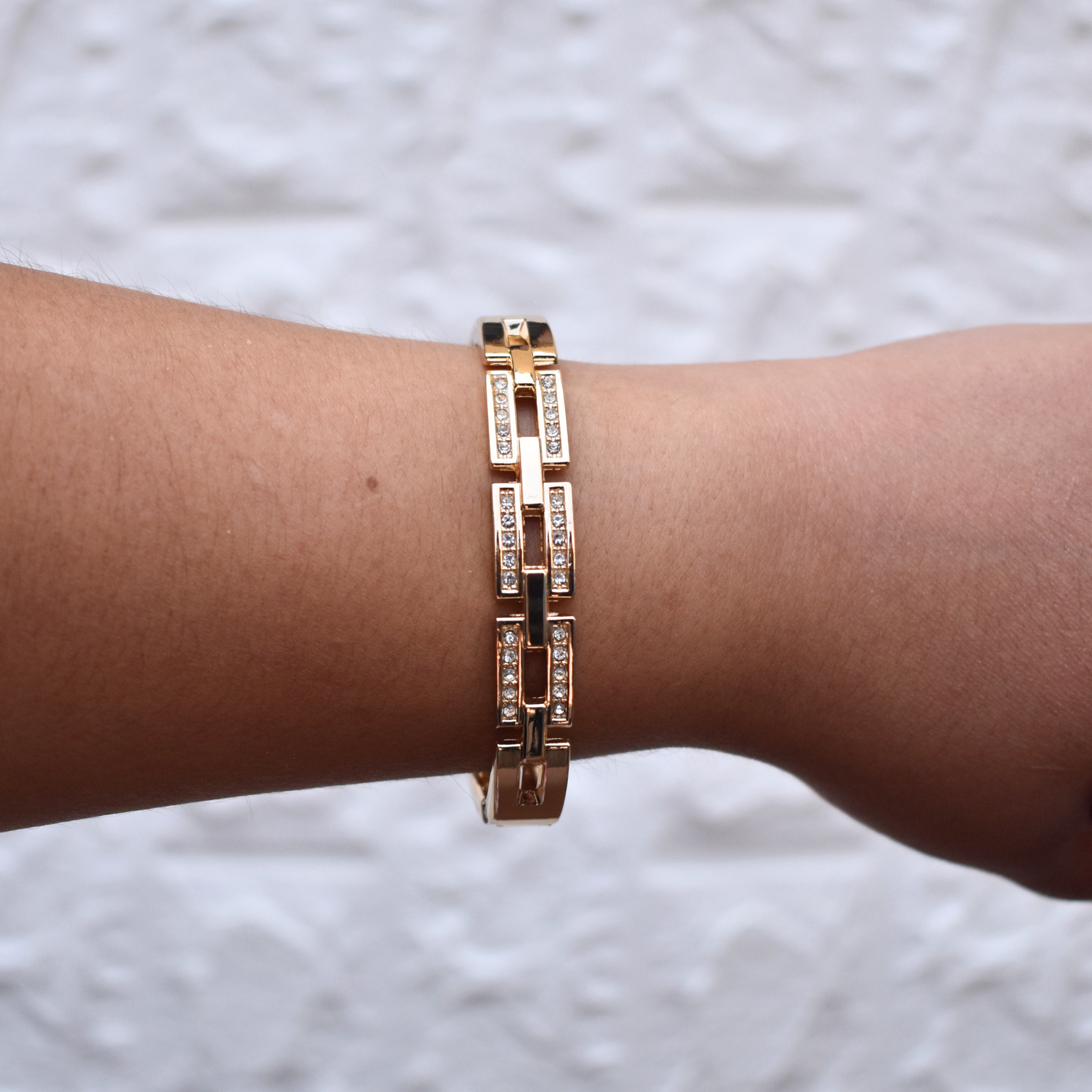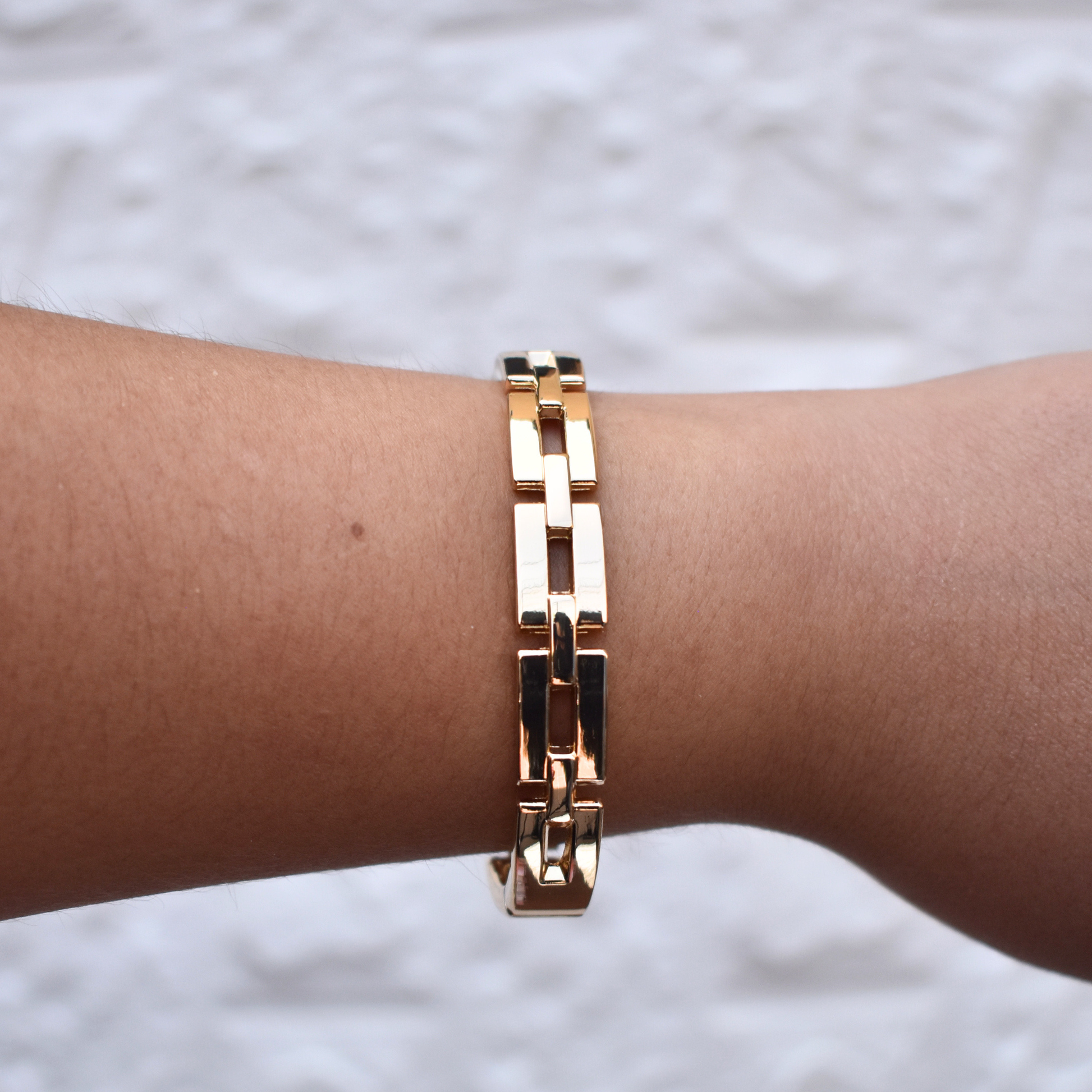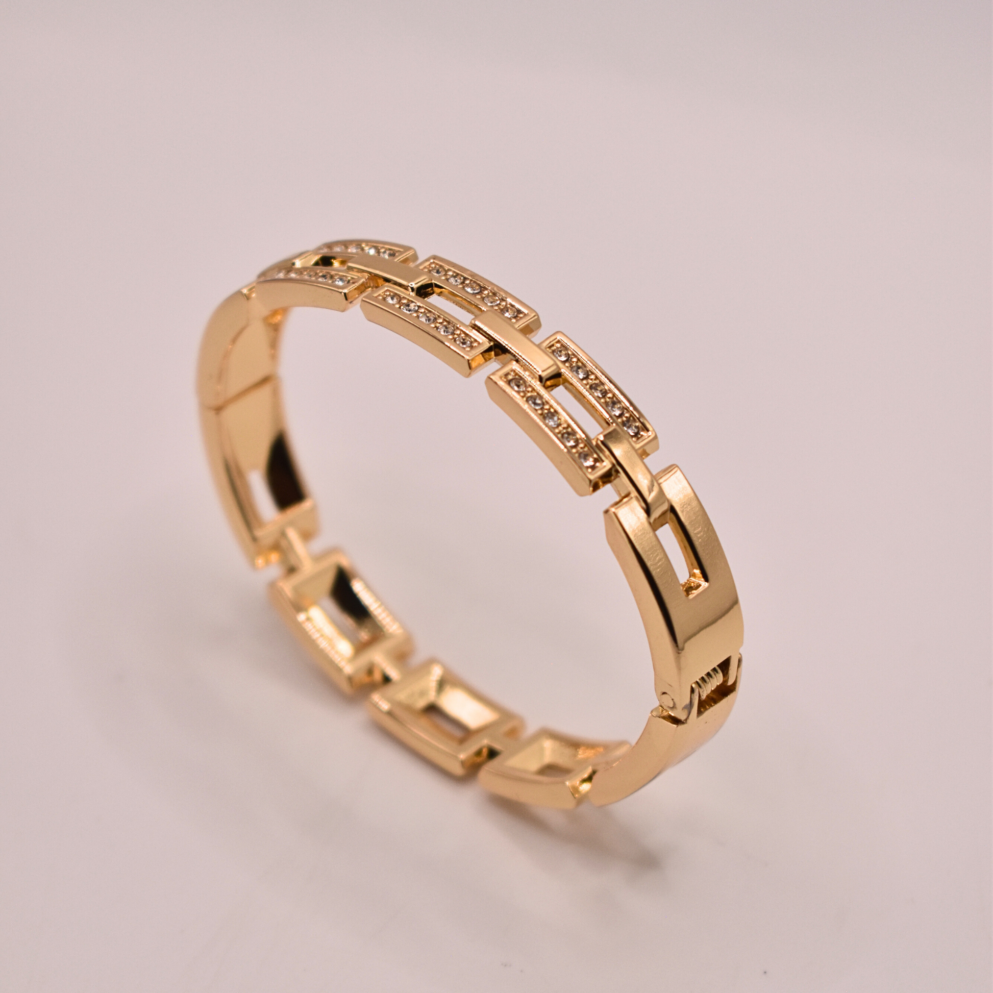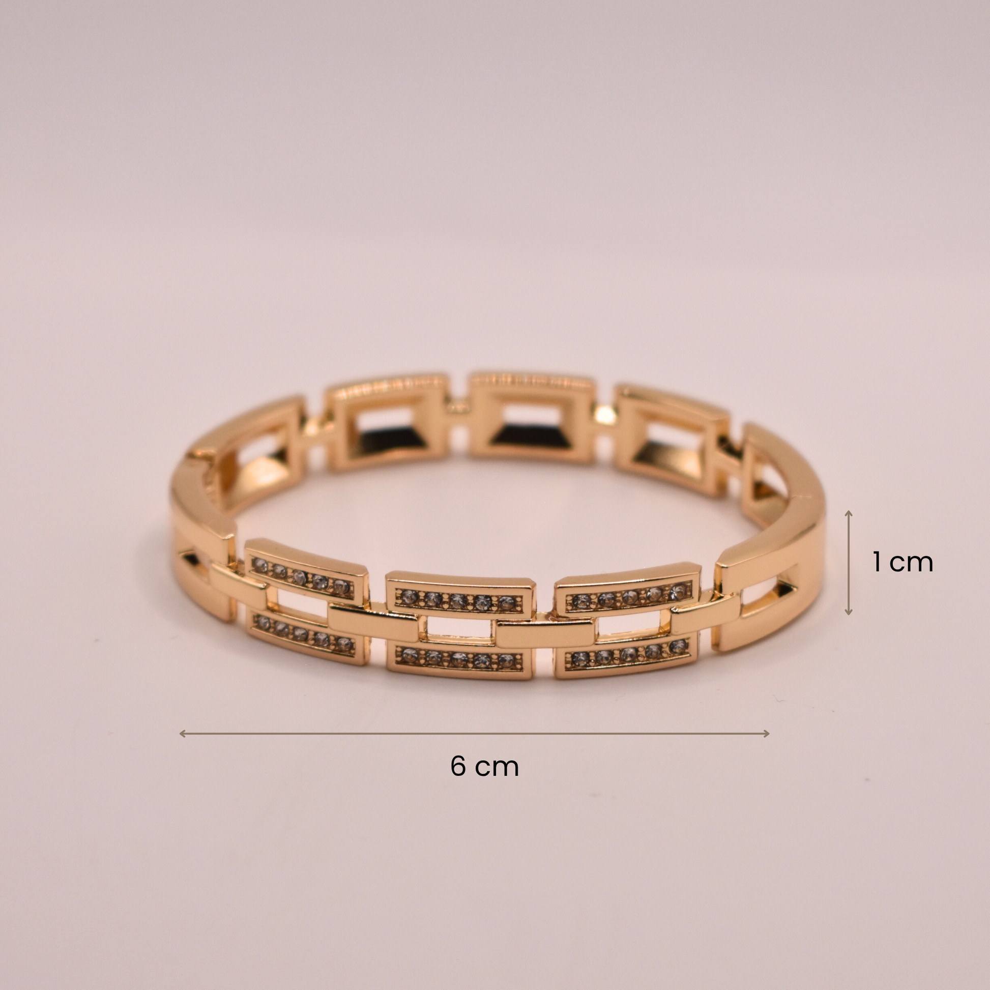 La pulsera Cyrene combina eslabones lisos y otros con toque de diamantes, creando un contraste elegante en acabado dorado.