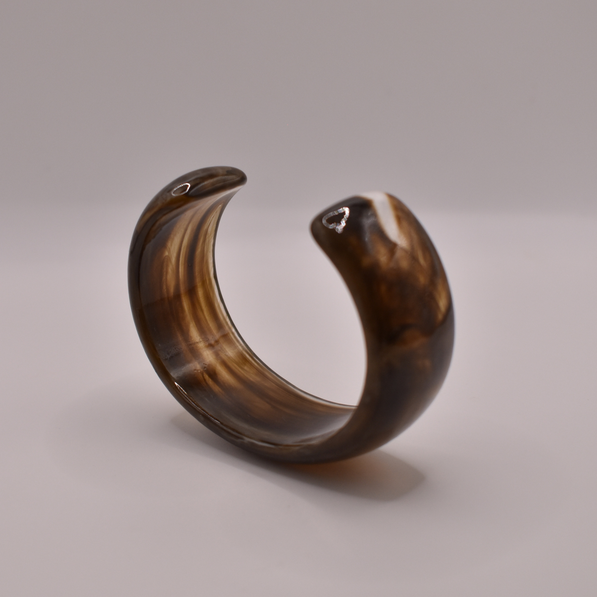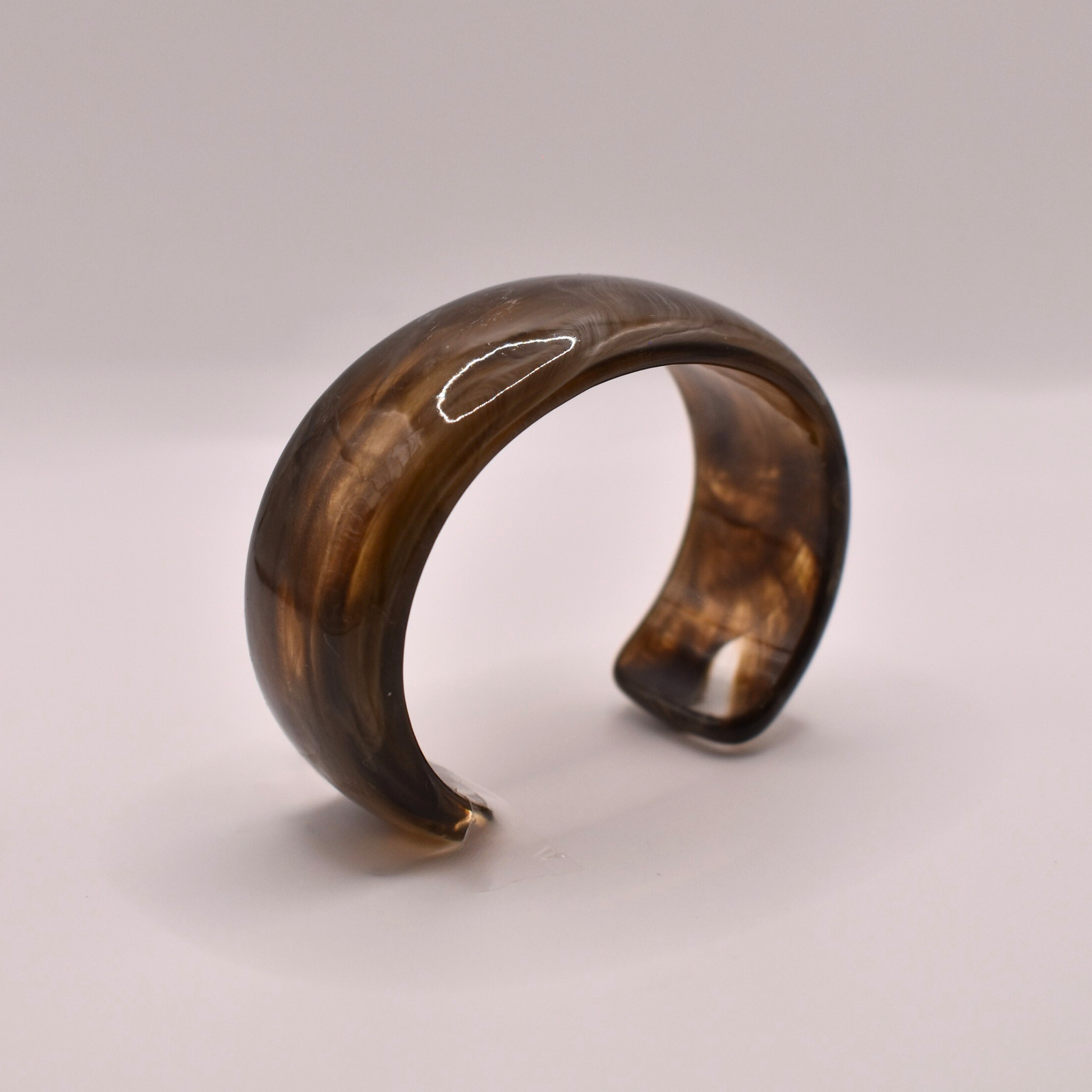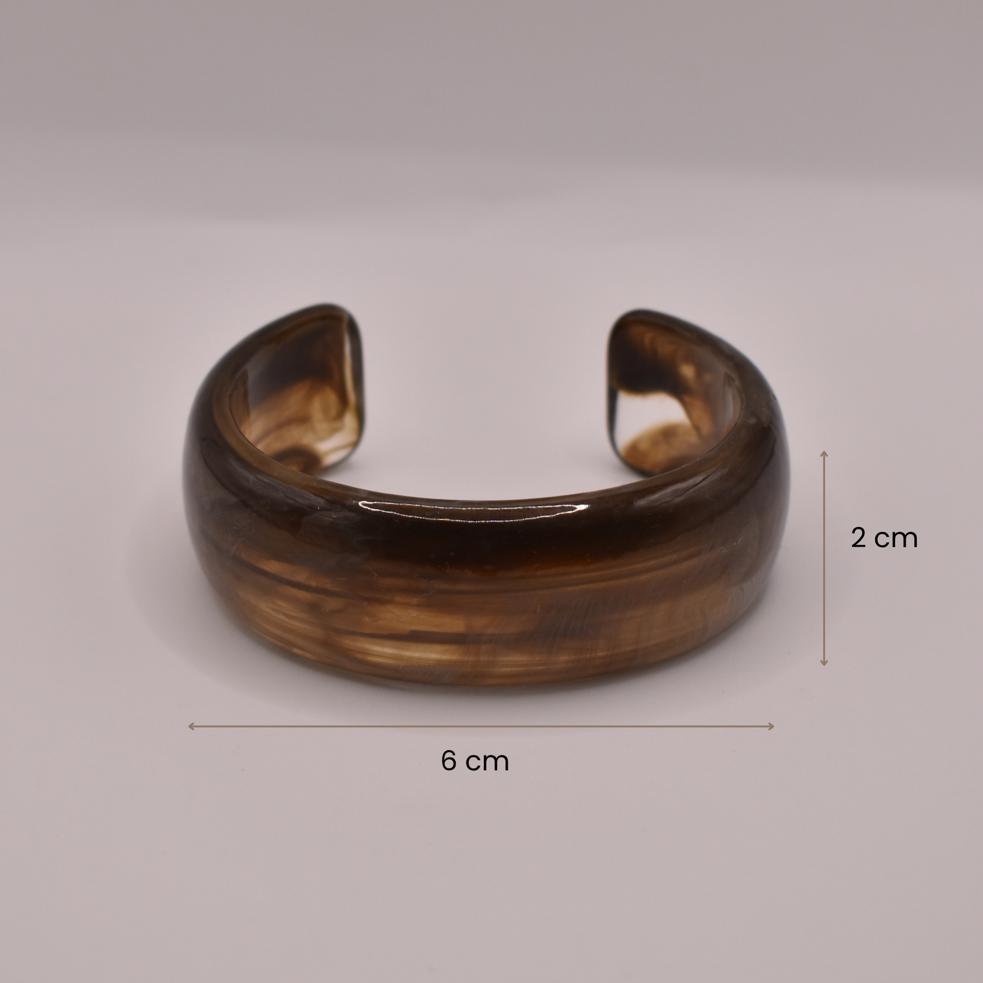 La pulsera Cyrene destaca por su acabado translúcido en tono ahumado y su forma curvada. Un diseño contemporáneo y versátil que aporta elegancia natural a cualquier look.