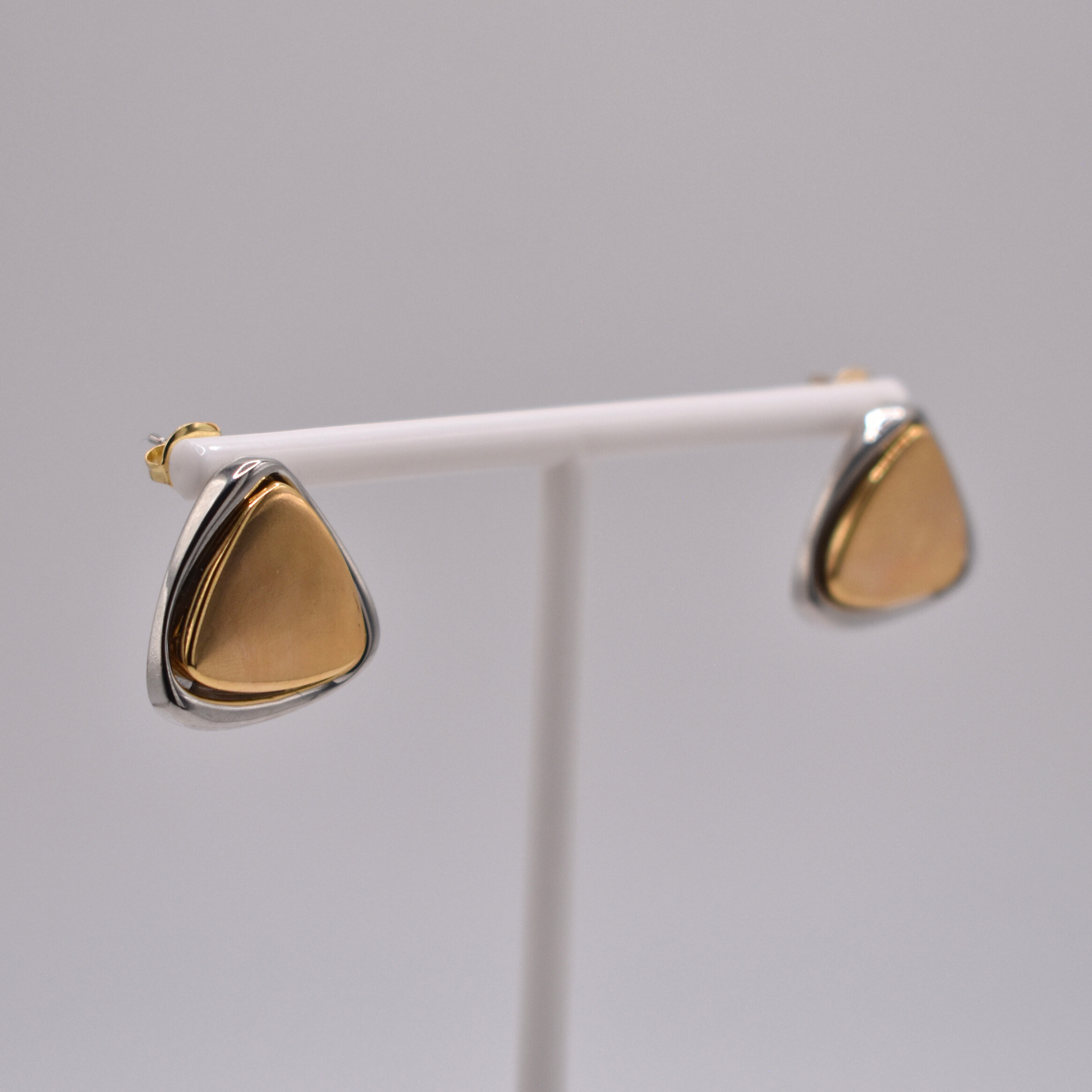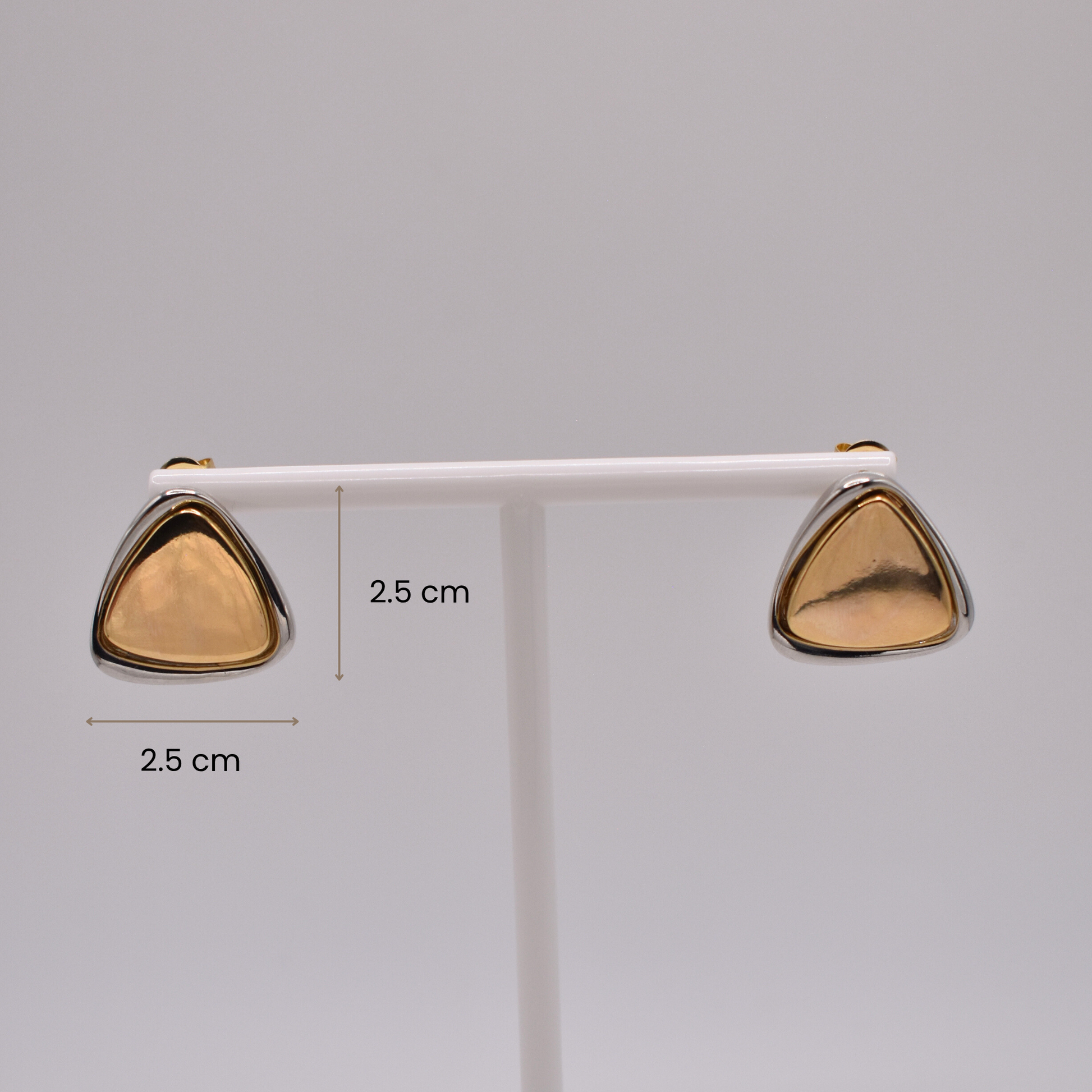 Los aretes Dalia presentan un diseño triangular dorado con borde plateado, aportando un contraste elegante y original.