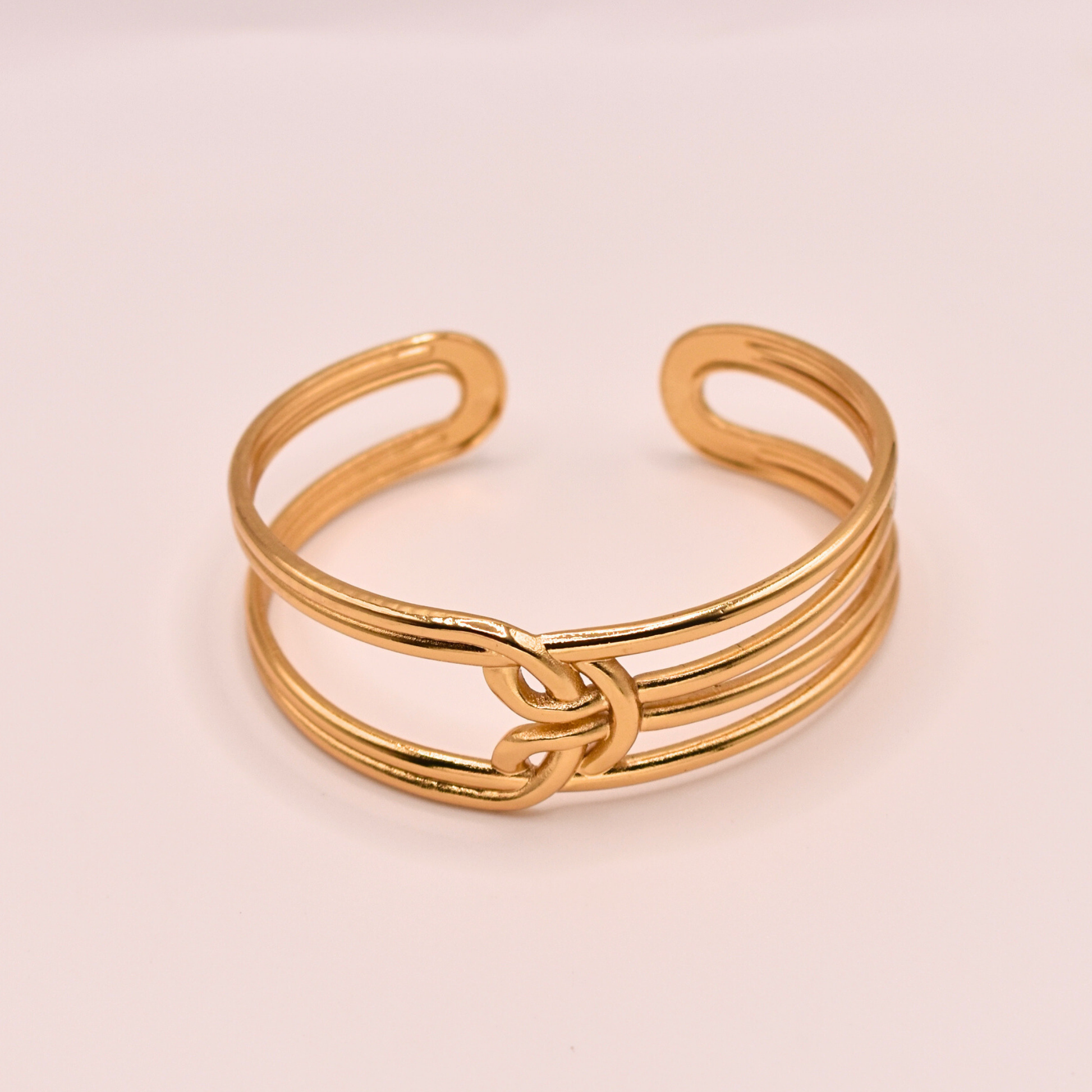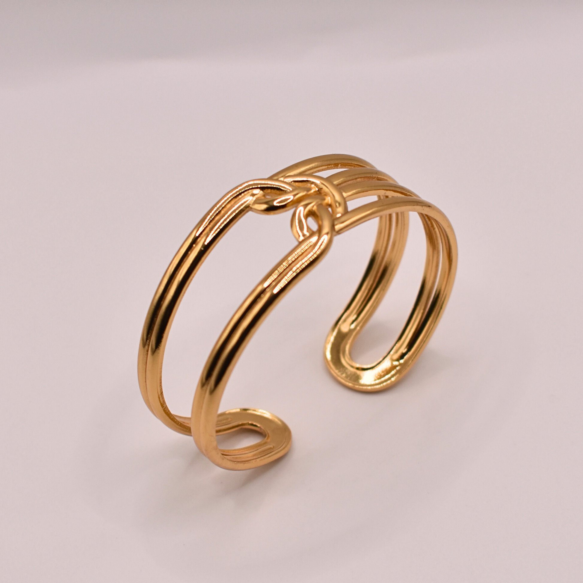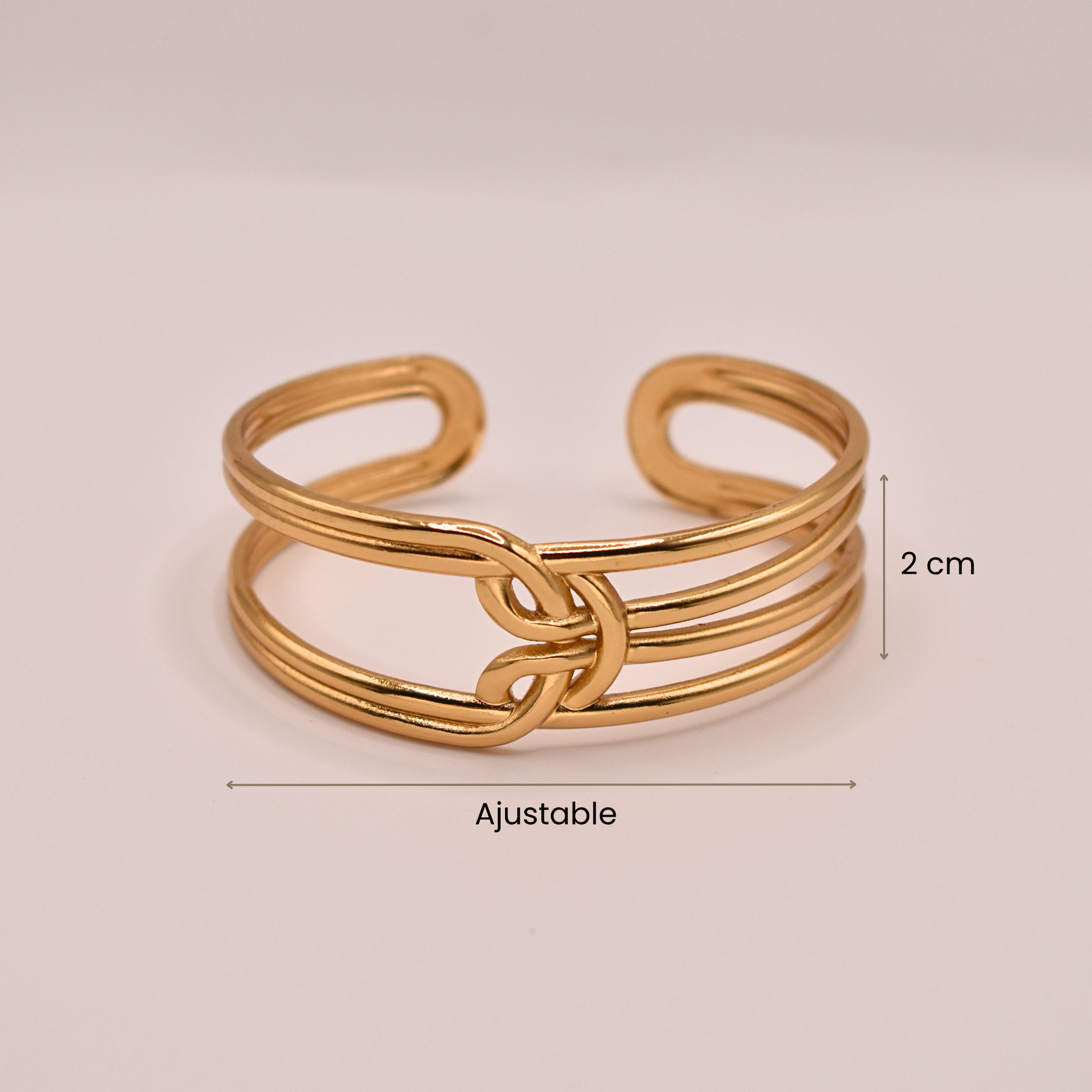 Diseñada con líneas abiertas y un detalle central entrelazado, la pulsera Egan refleja modernidad y estilo. Su acabado dorado pulido la convierte en un must-have para looks sofisticados.