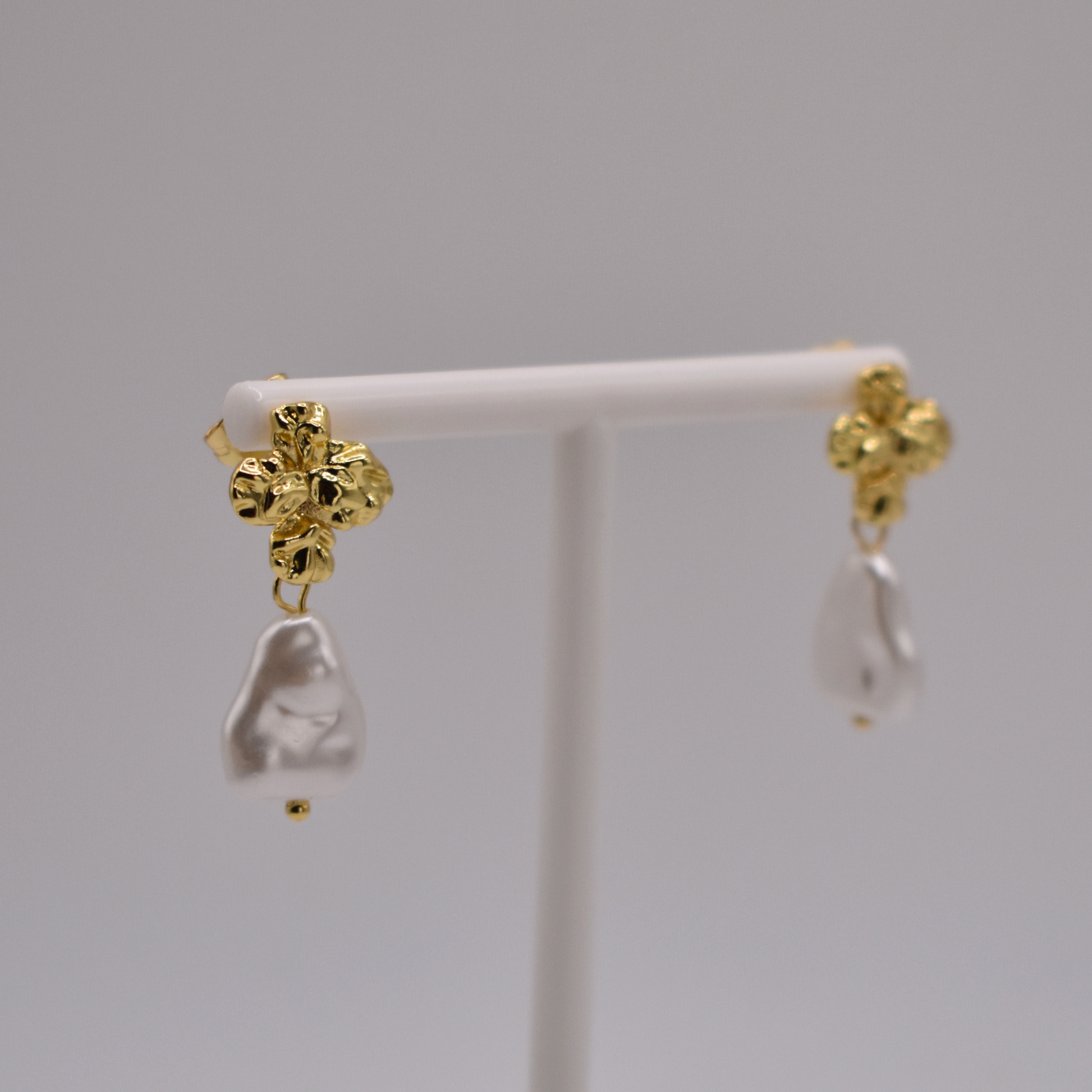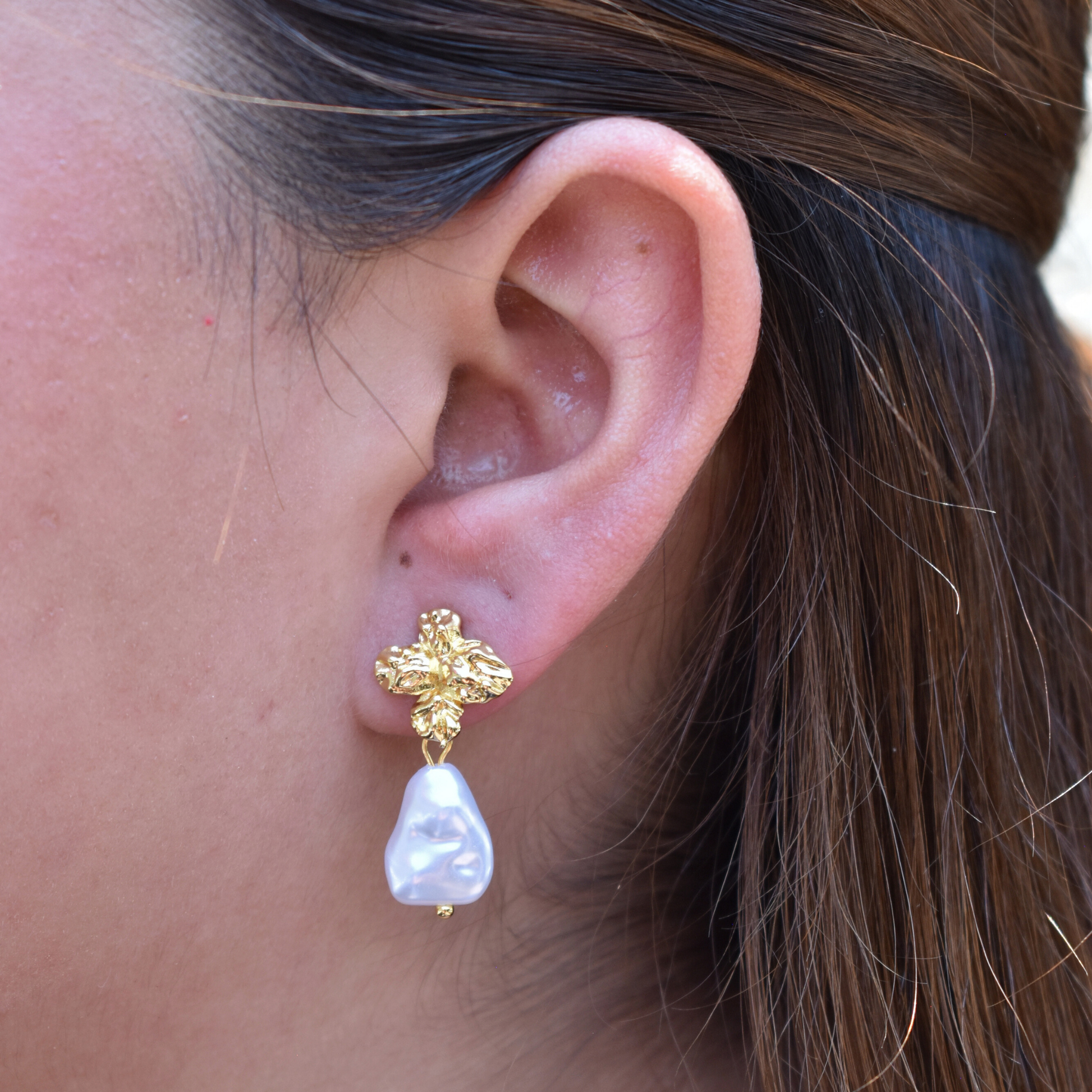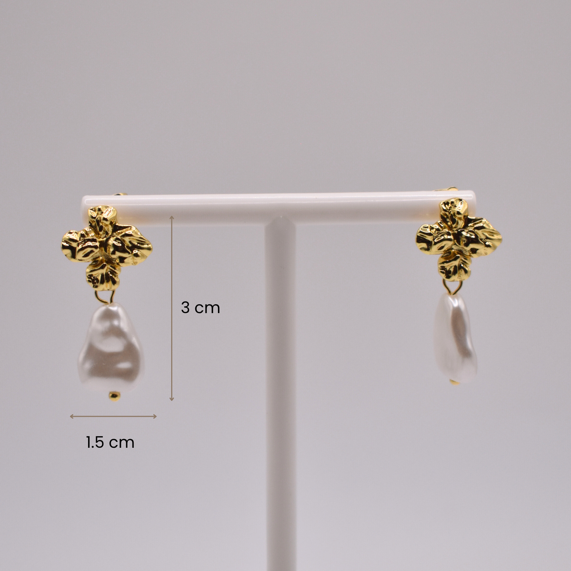 Los aretes Elián combinan un diseño de cruz dorada con un toque de perla, perfectos para un look elegante y sofisticado.