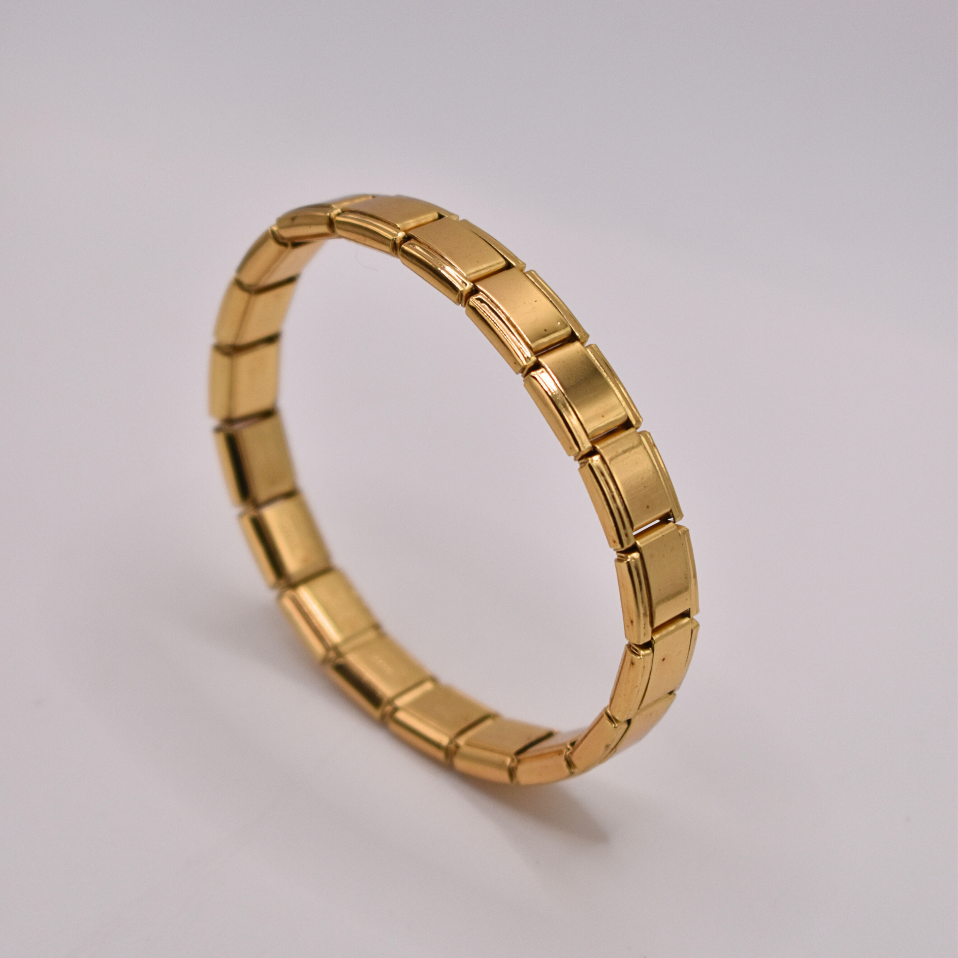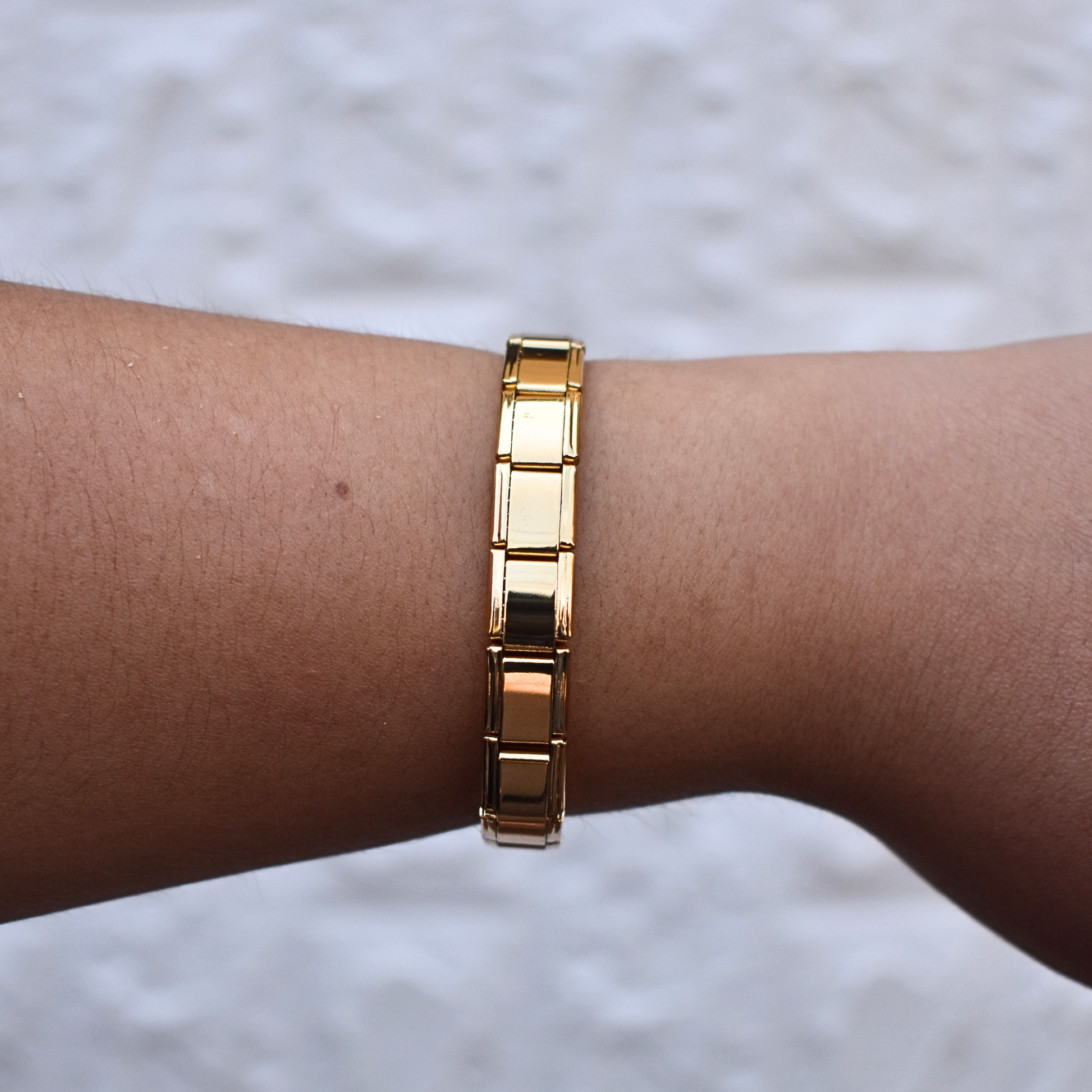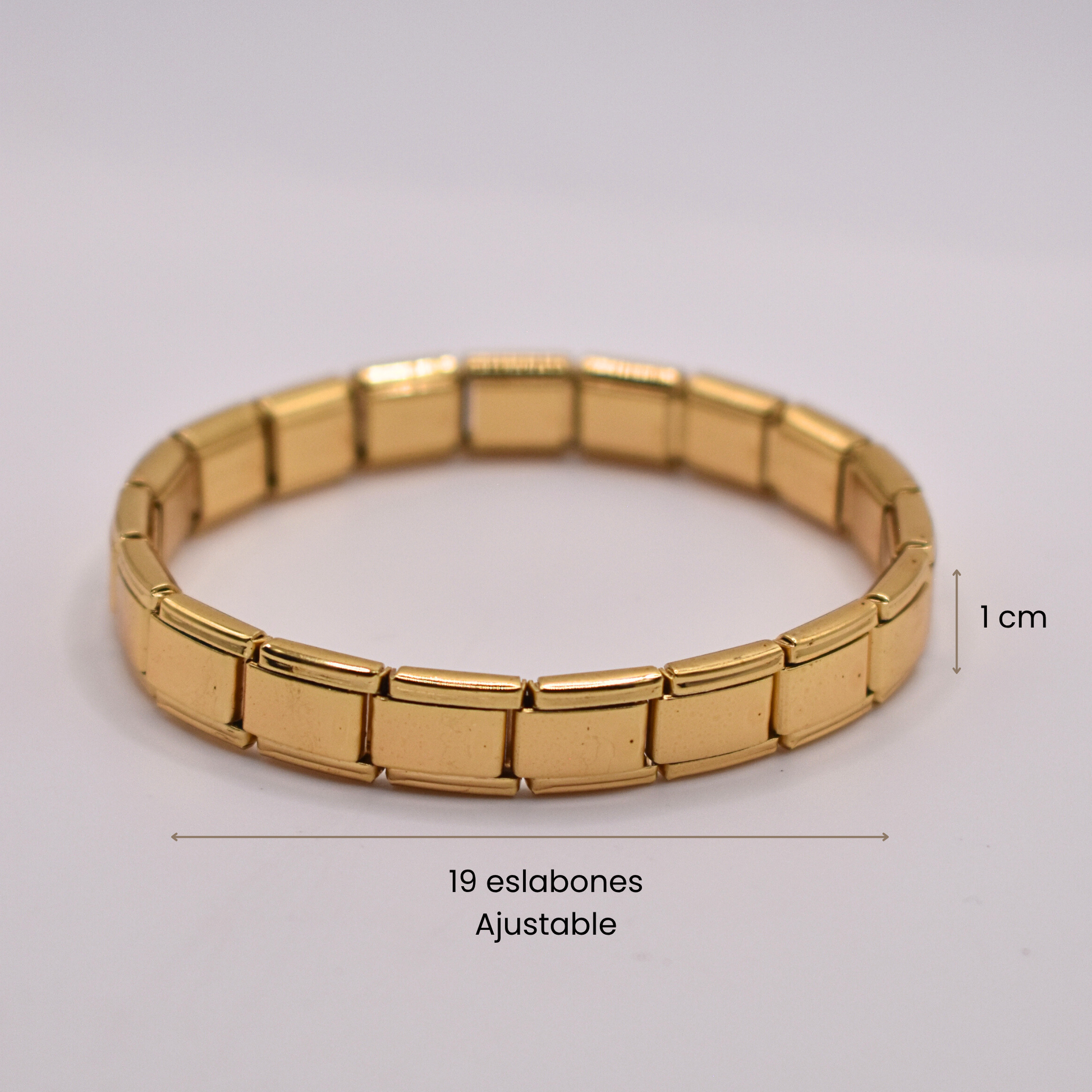 La pulsera italiana Elora en dorado cuenta con 19 eslabones ajustables, perfecta para personalizar y combinar con charms.