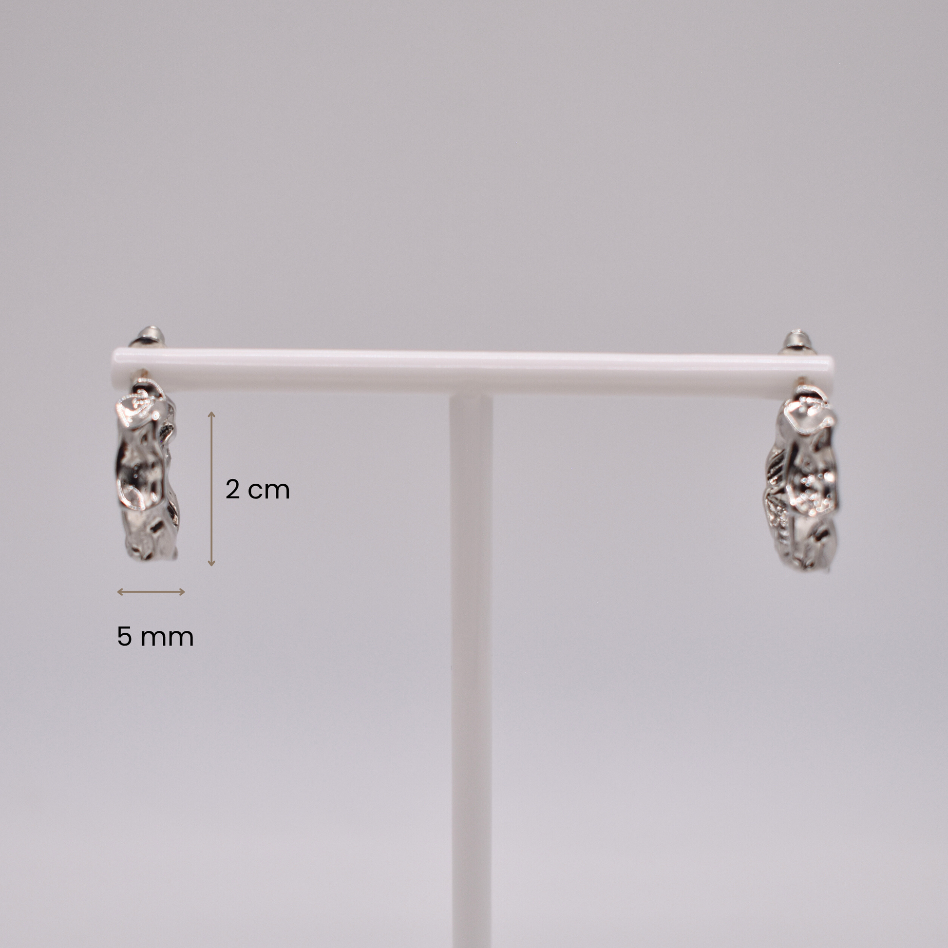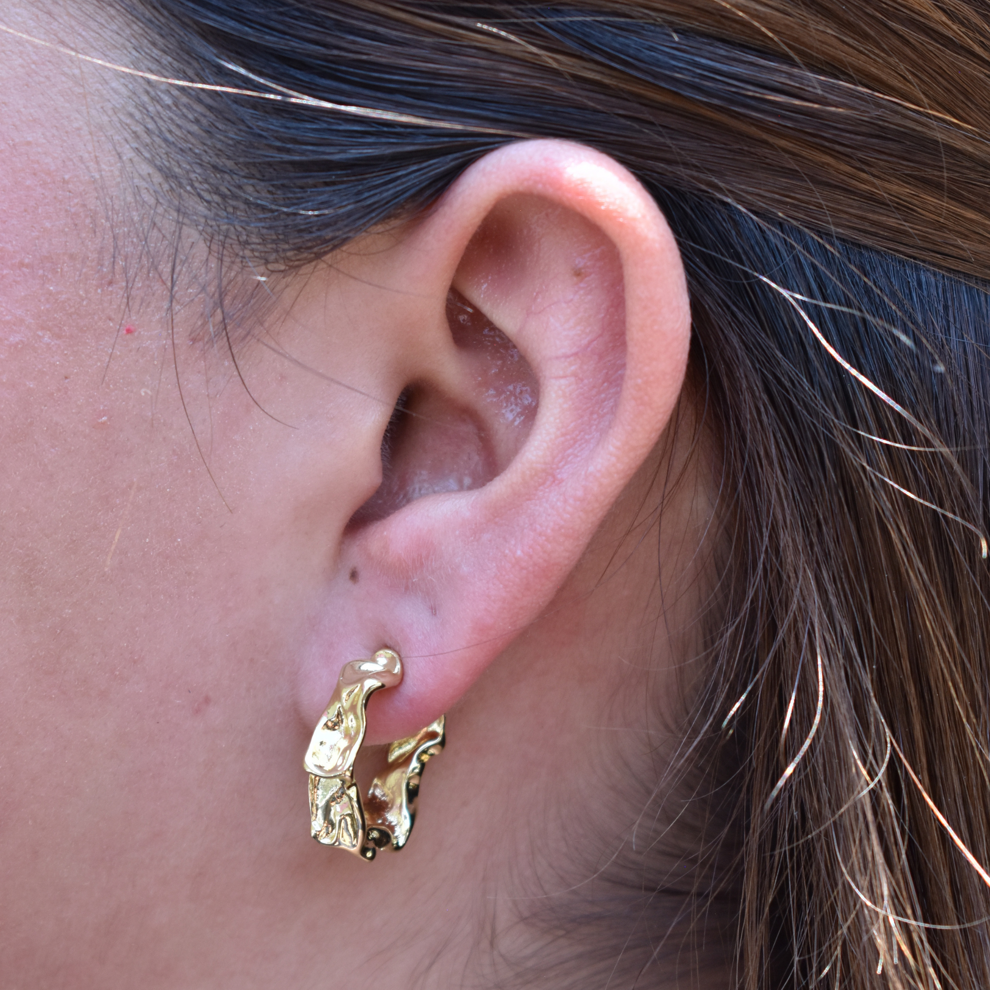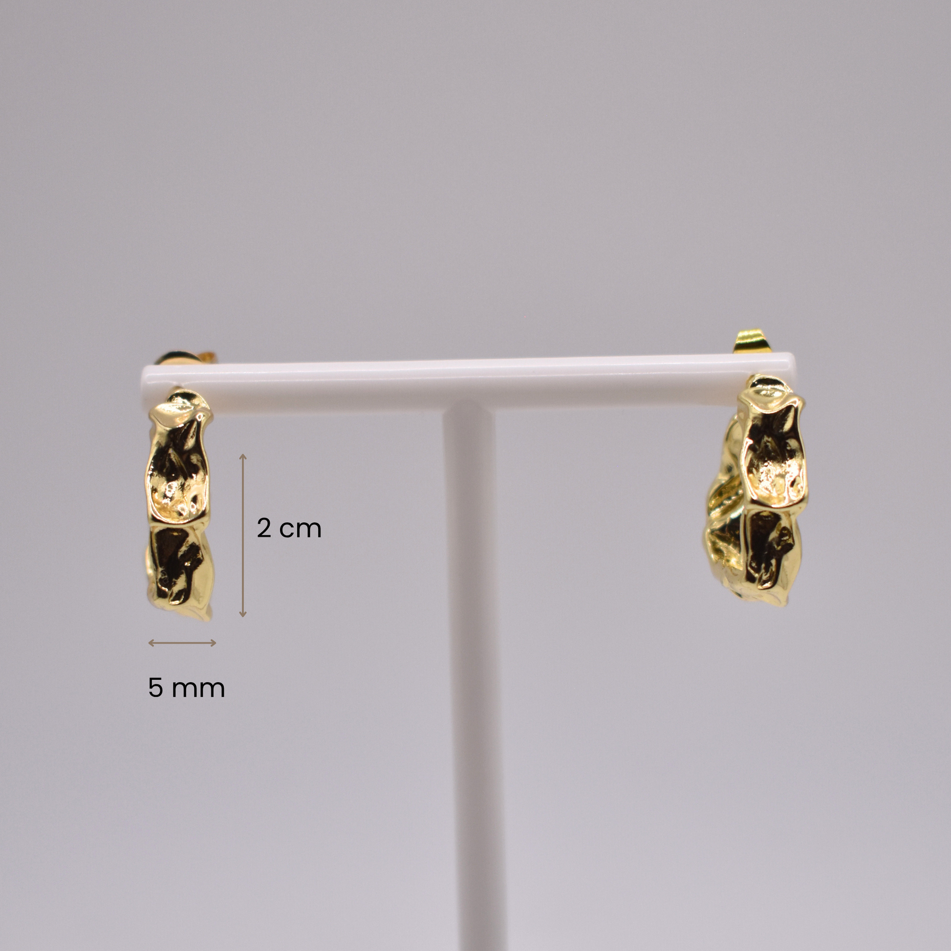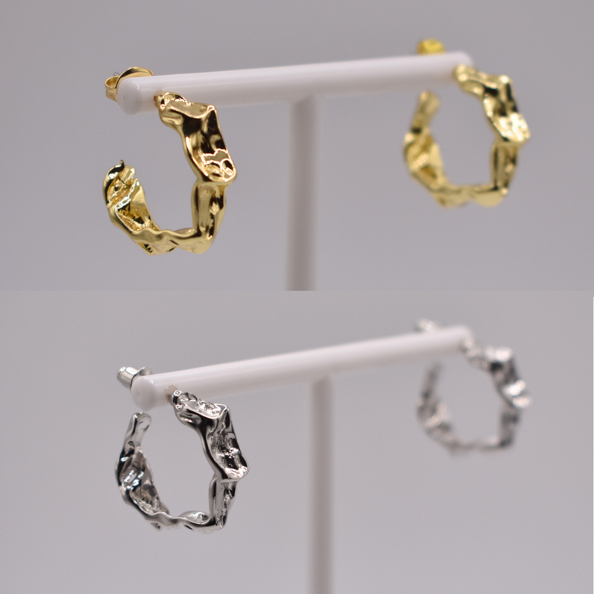 Los aretes Eris están disponibles en dorado o plateado, con diseño de arracada y acabado tipo aplastado. Ideales para un look moderno y elegante.