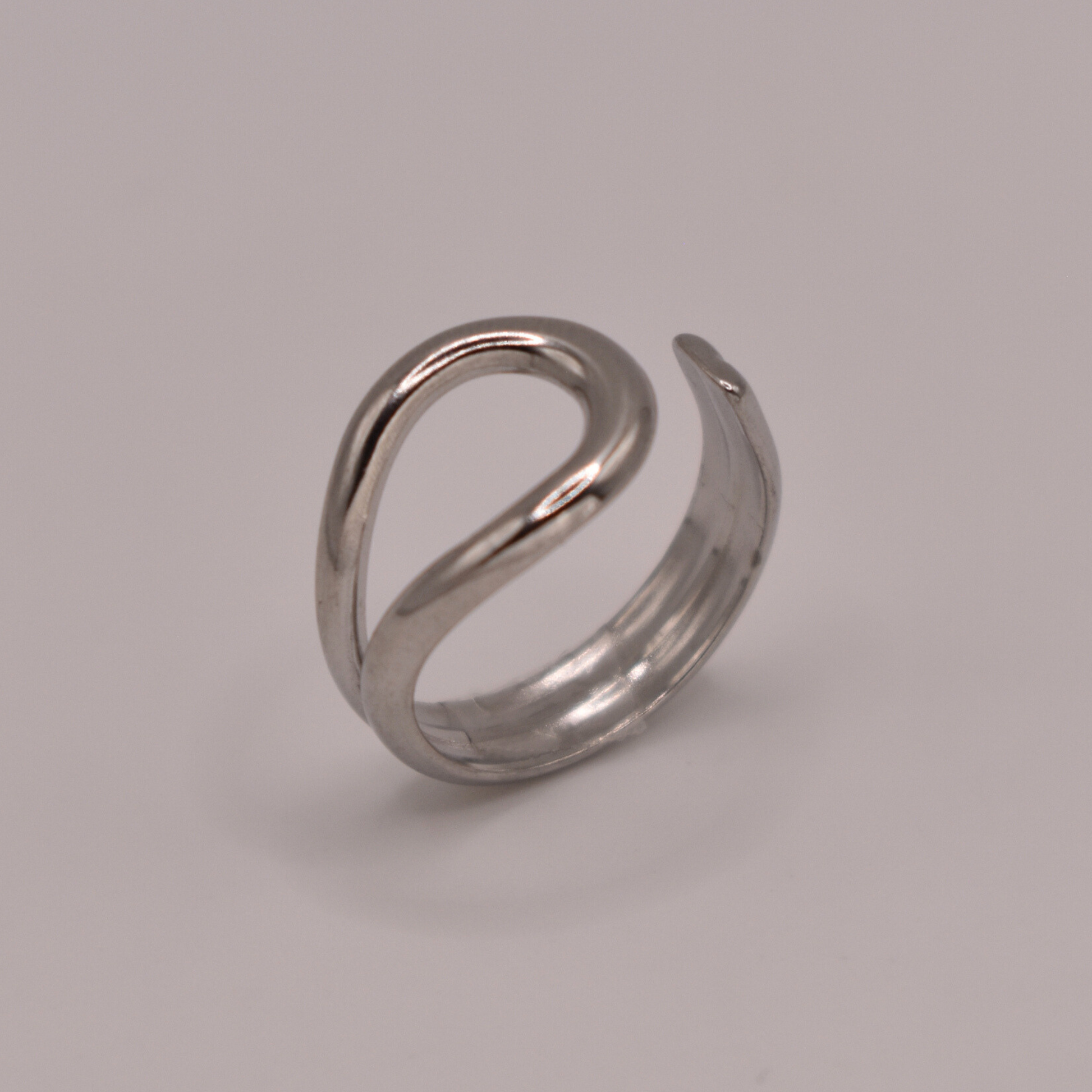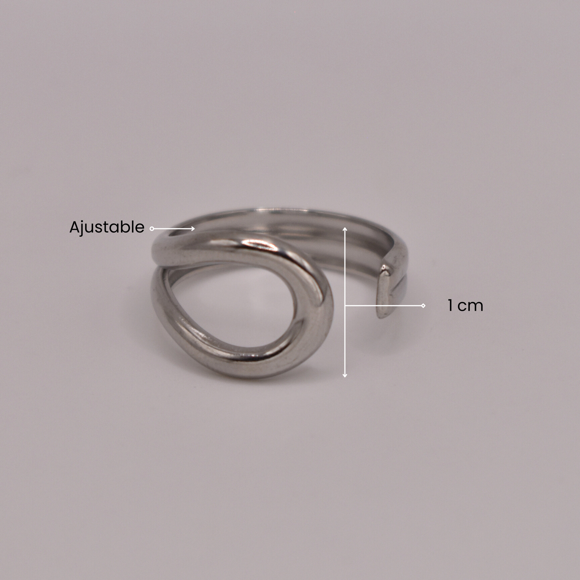 Eset es un anillo plateado con mitad ovalado y la otra mitad curvada hacia el óvalo, un diseño asimétrico y sofisticado.
