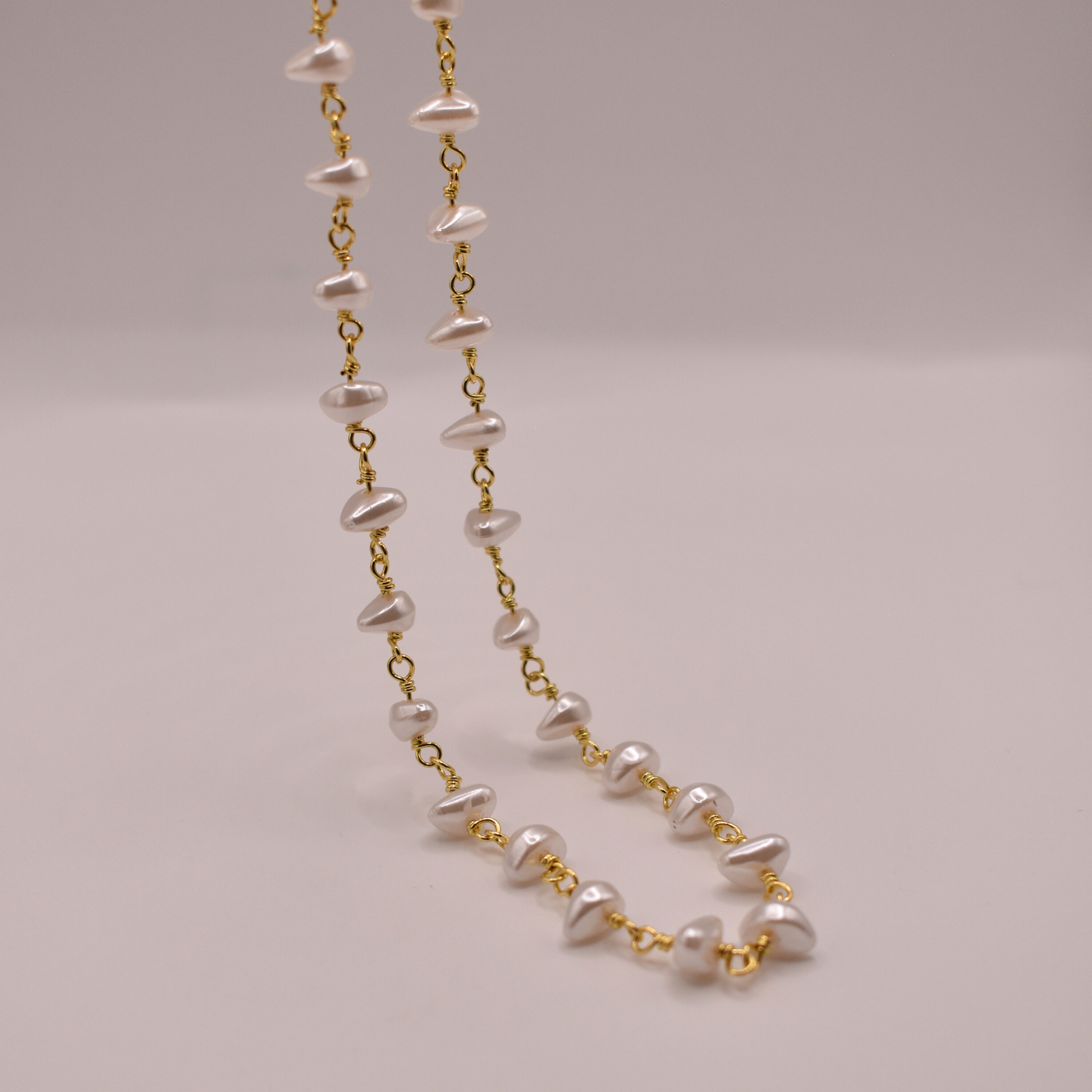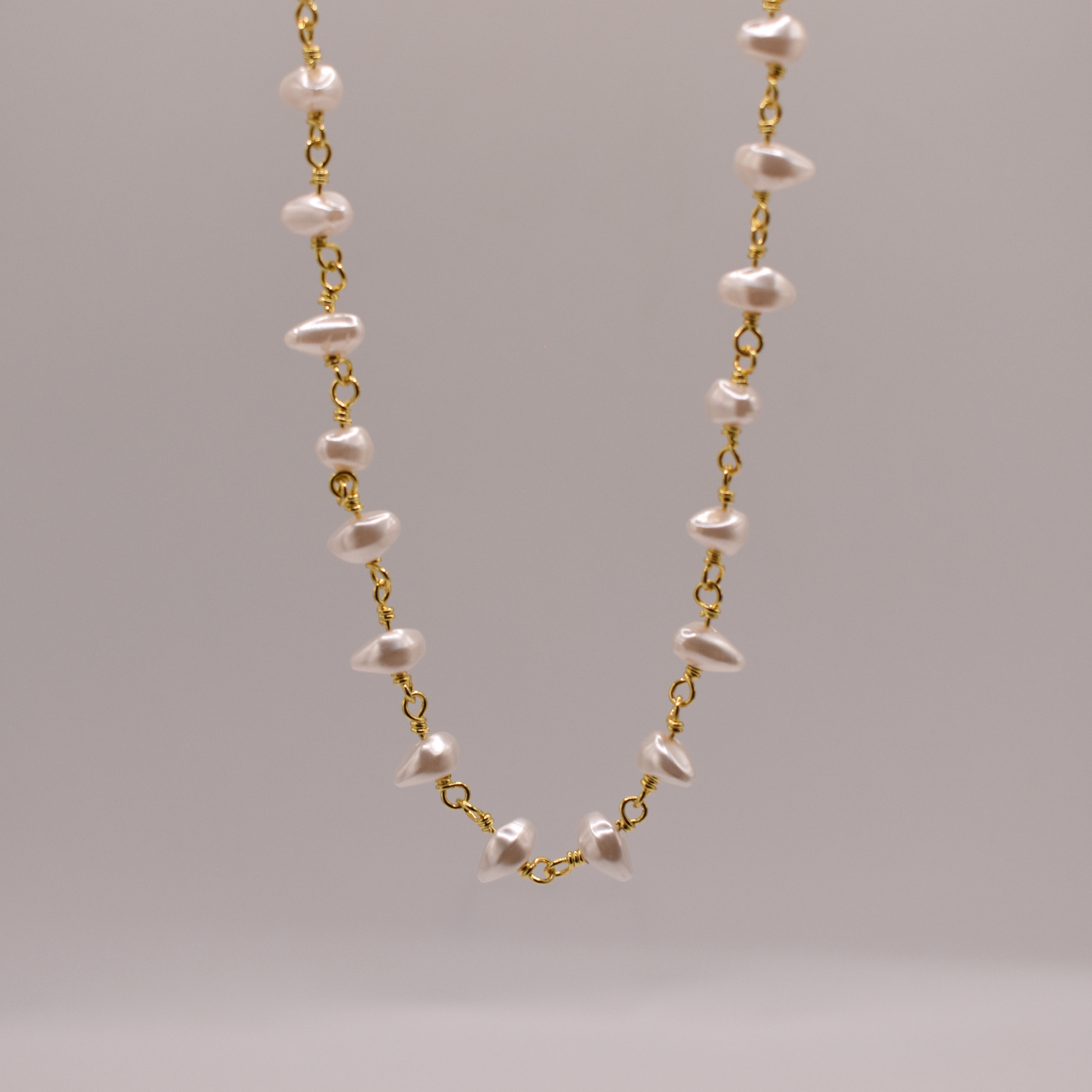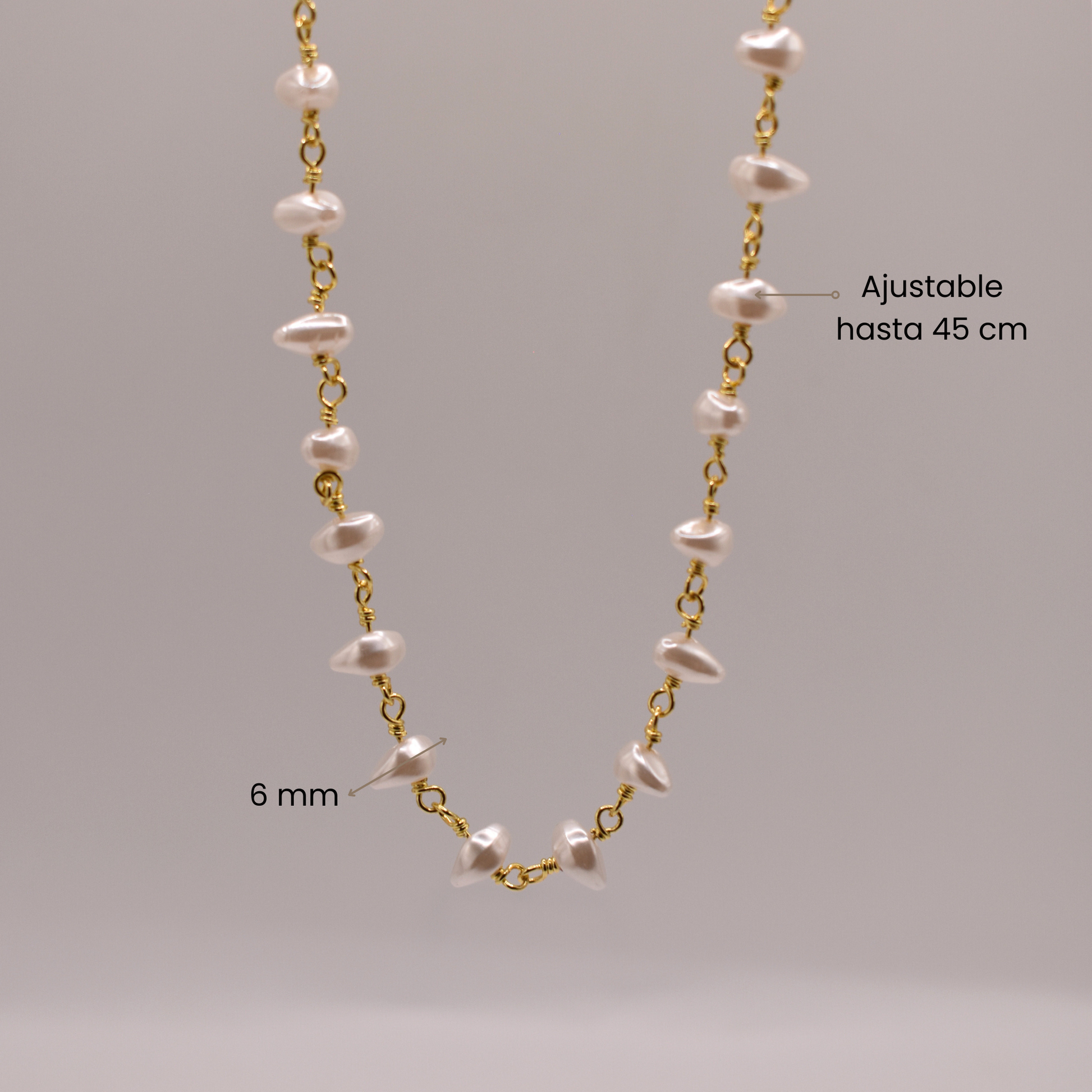 Hathor es un collar delicado con patrón de perlitas con picos, eslabones pequeños y perlas alternados, ideal para un estilo sutil y femenino con cadena ajustable para combinaciones variadas.