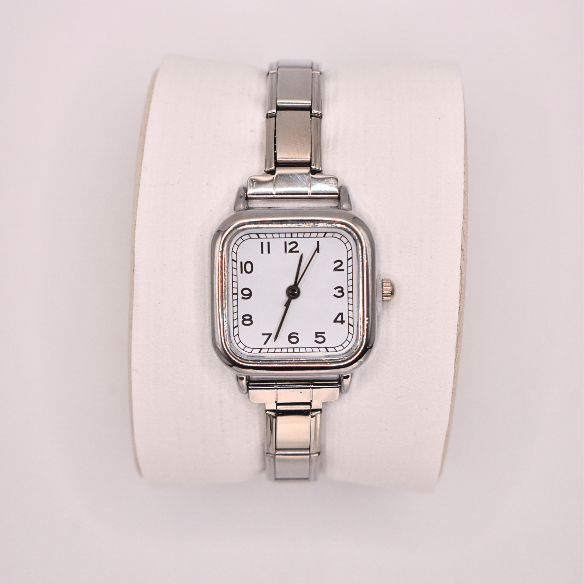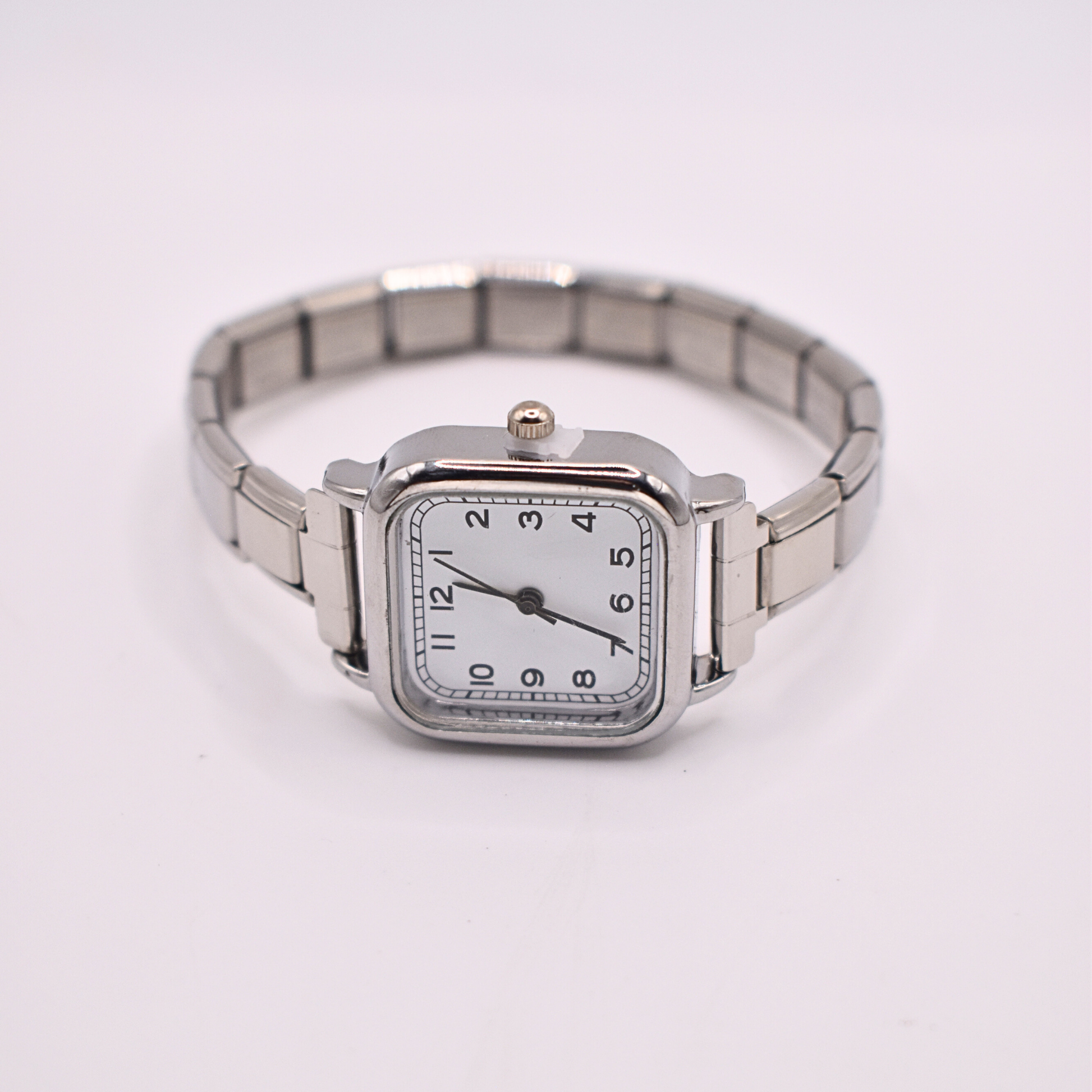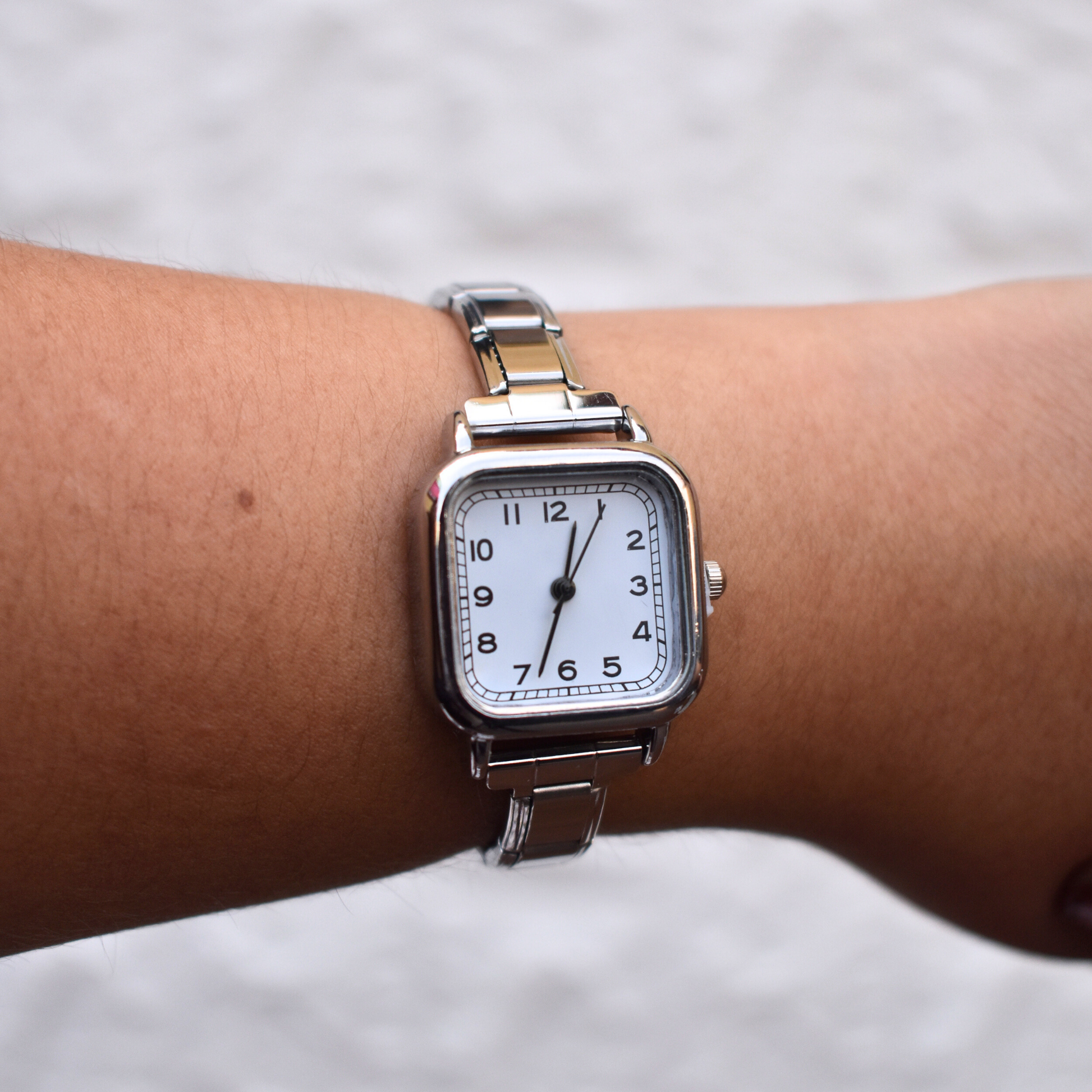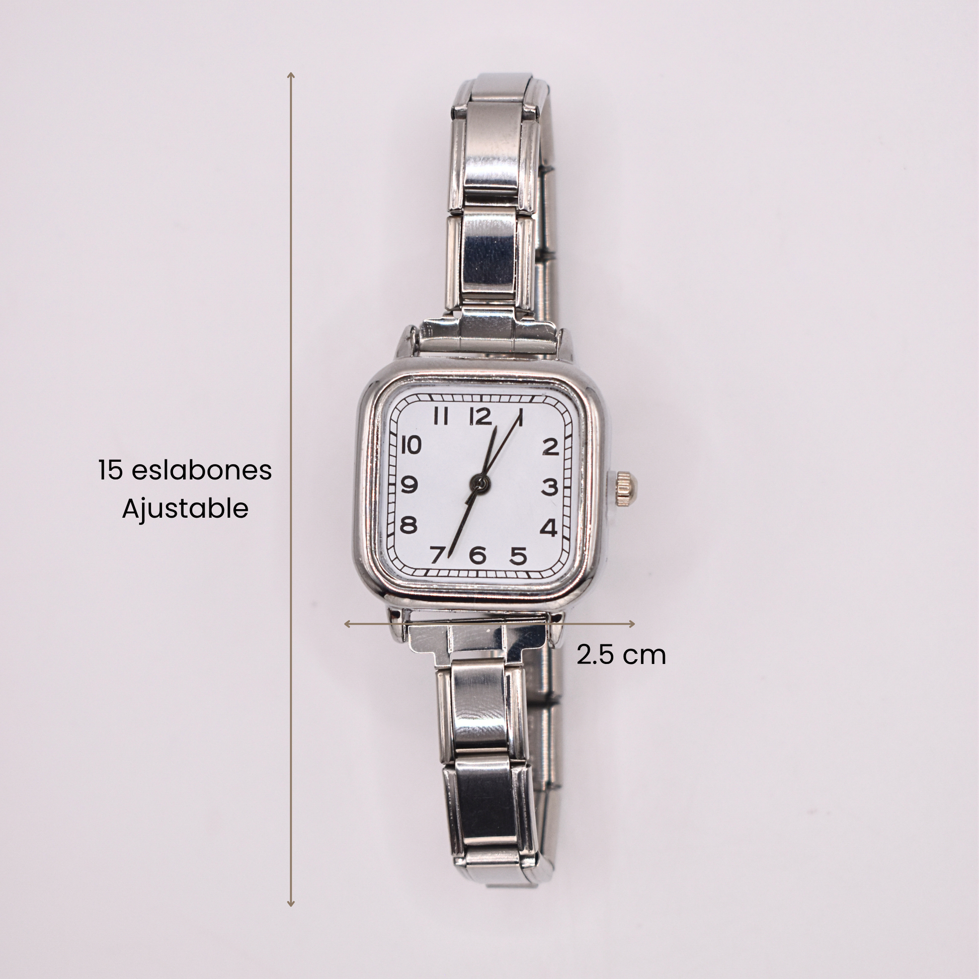 El reloj Helios de brazalete italiano destaca por su carátula cuadrada con números arábigos y un diseño elegante de eslabones ajustables. Perfecto para elevar cualquier look.