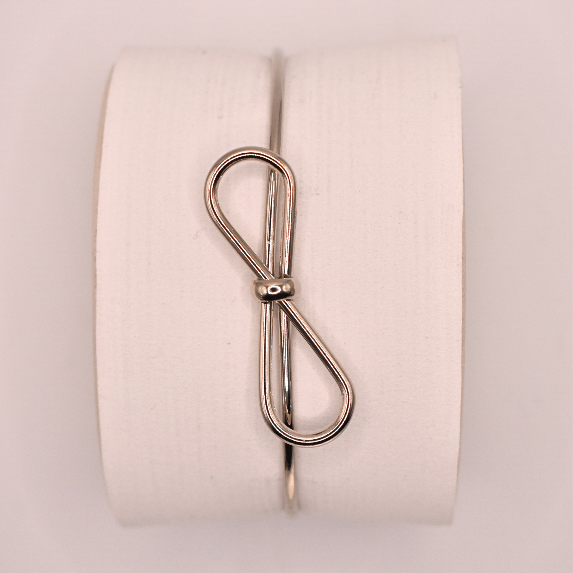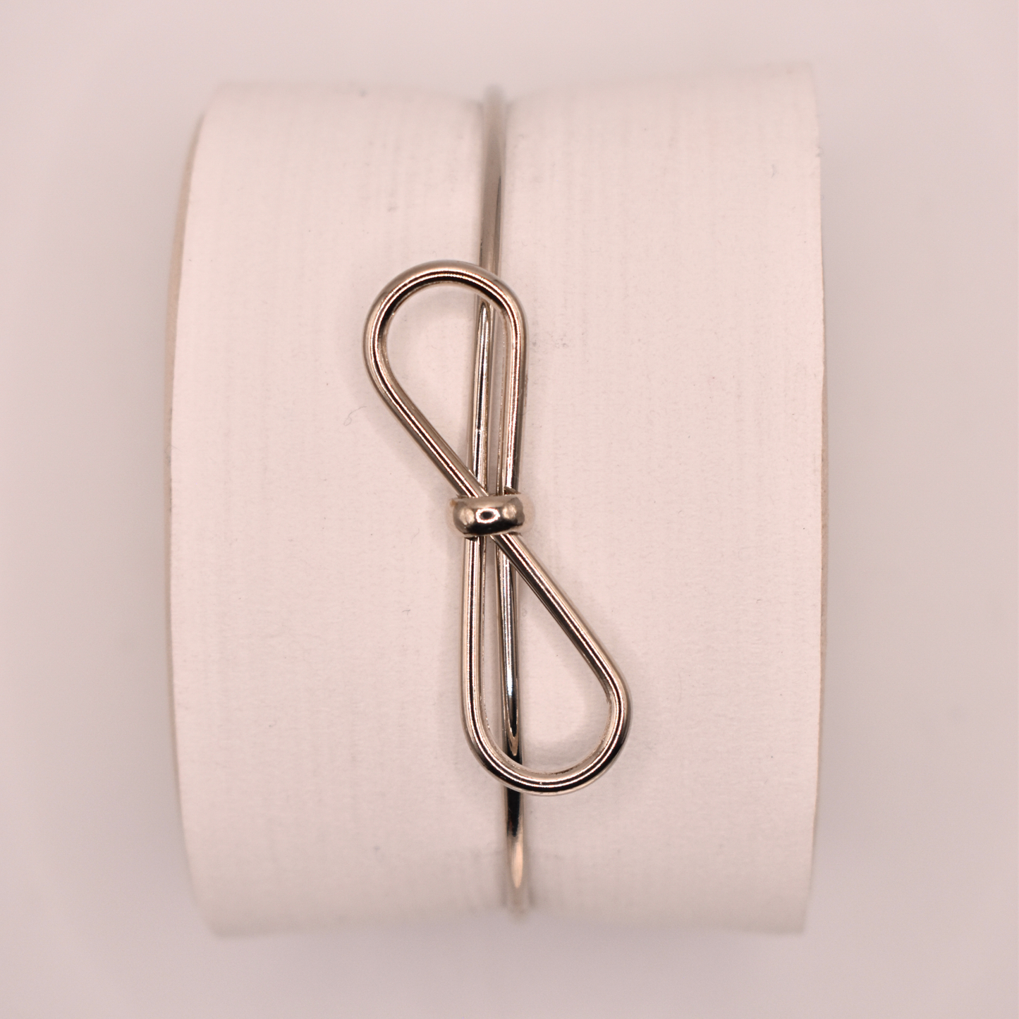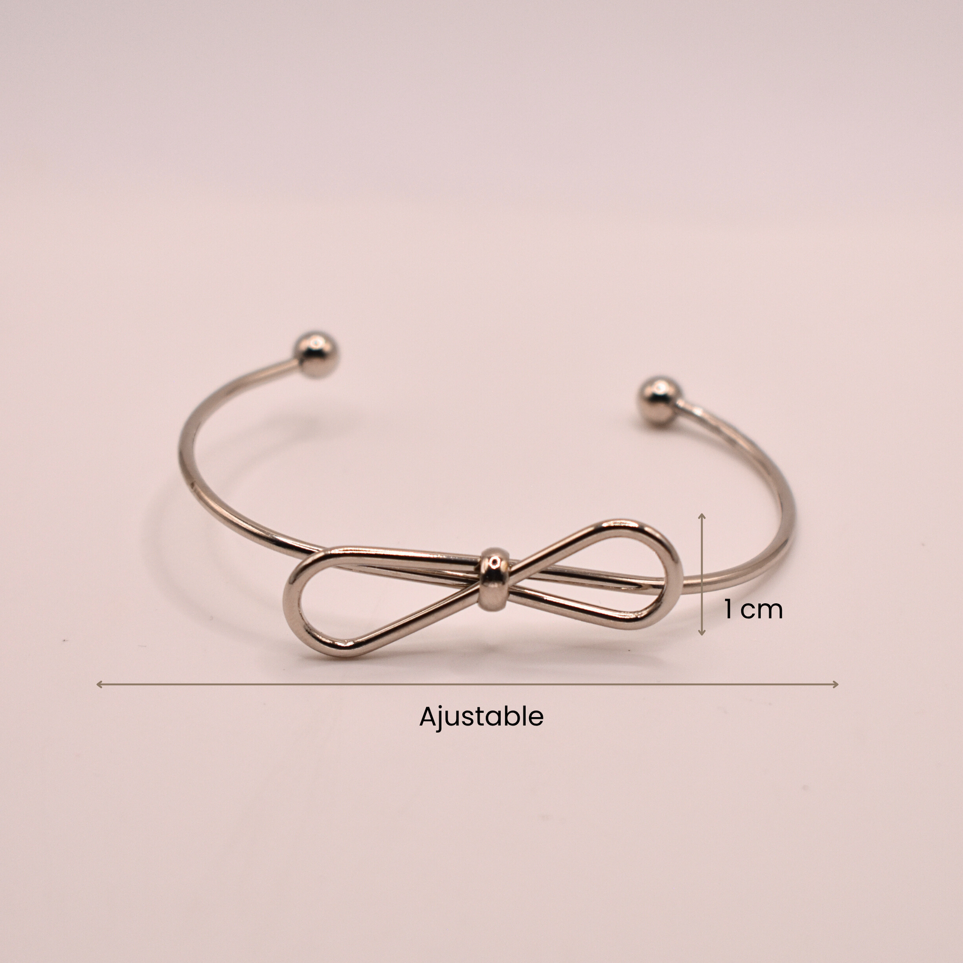 Destaca con la pulsera Hera, un diseño ajustable con dije de moño en tono plateado, ideal para un look delicado y femenino.