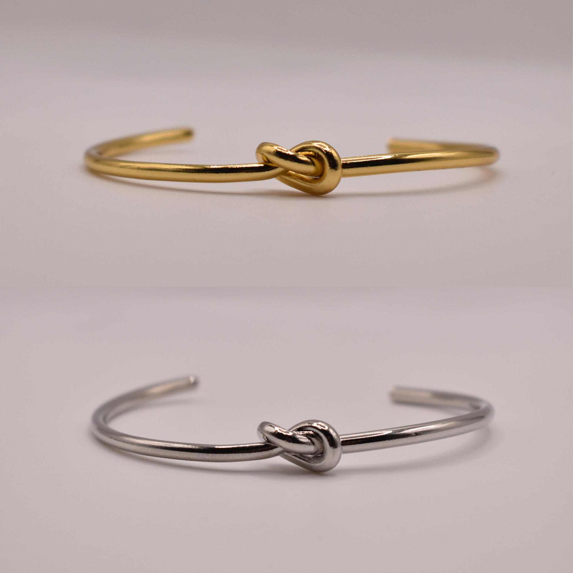 Disponible en dorado o plateado, la pulsera Kaen presenta un diseño de nudo central que simboliza unión y fuerza. Un accesorio delicado pero con carácter, ideal para uso diario.
