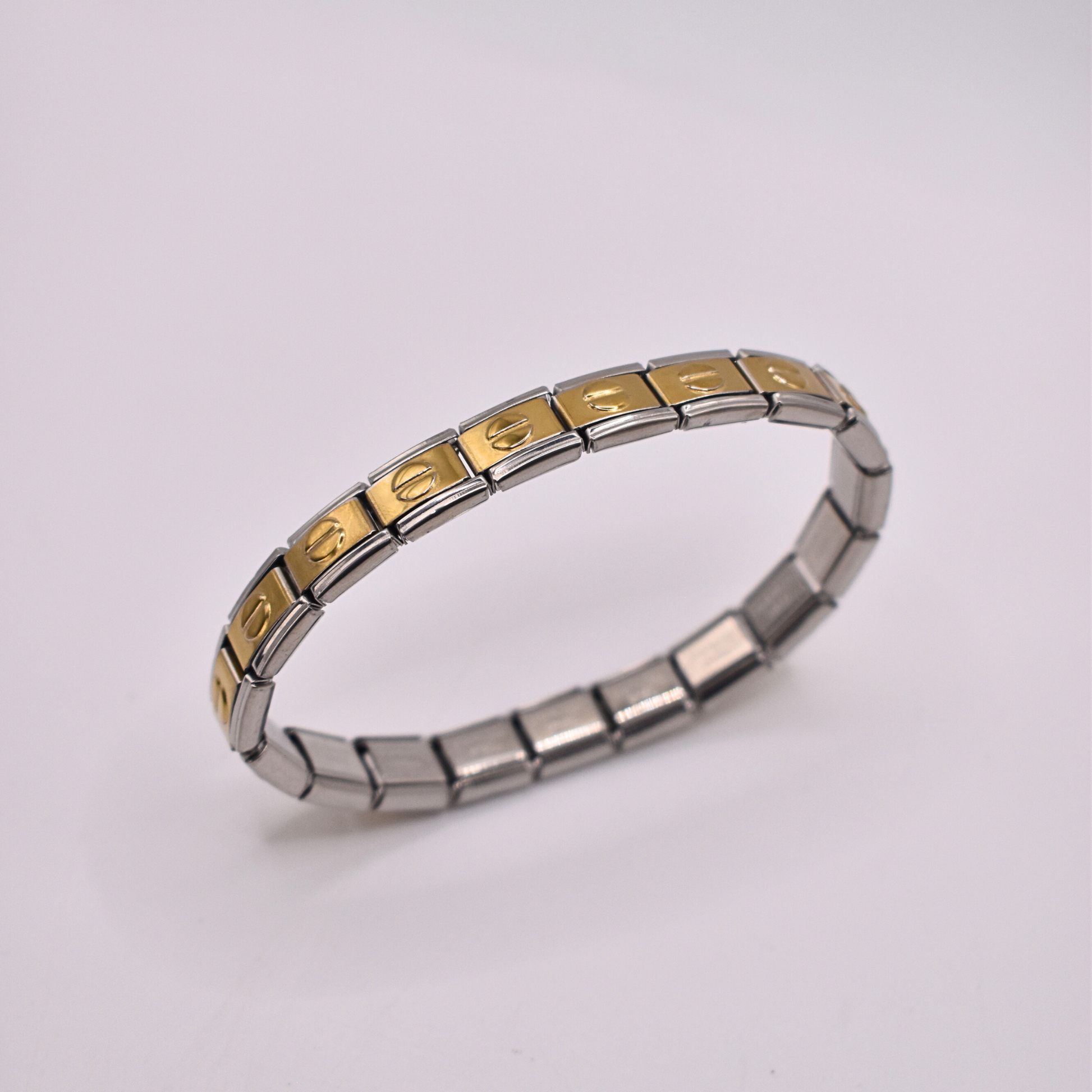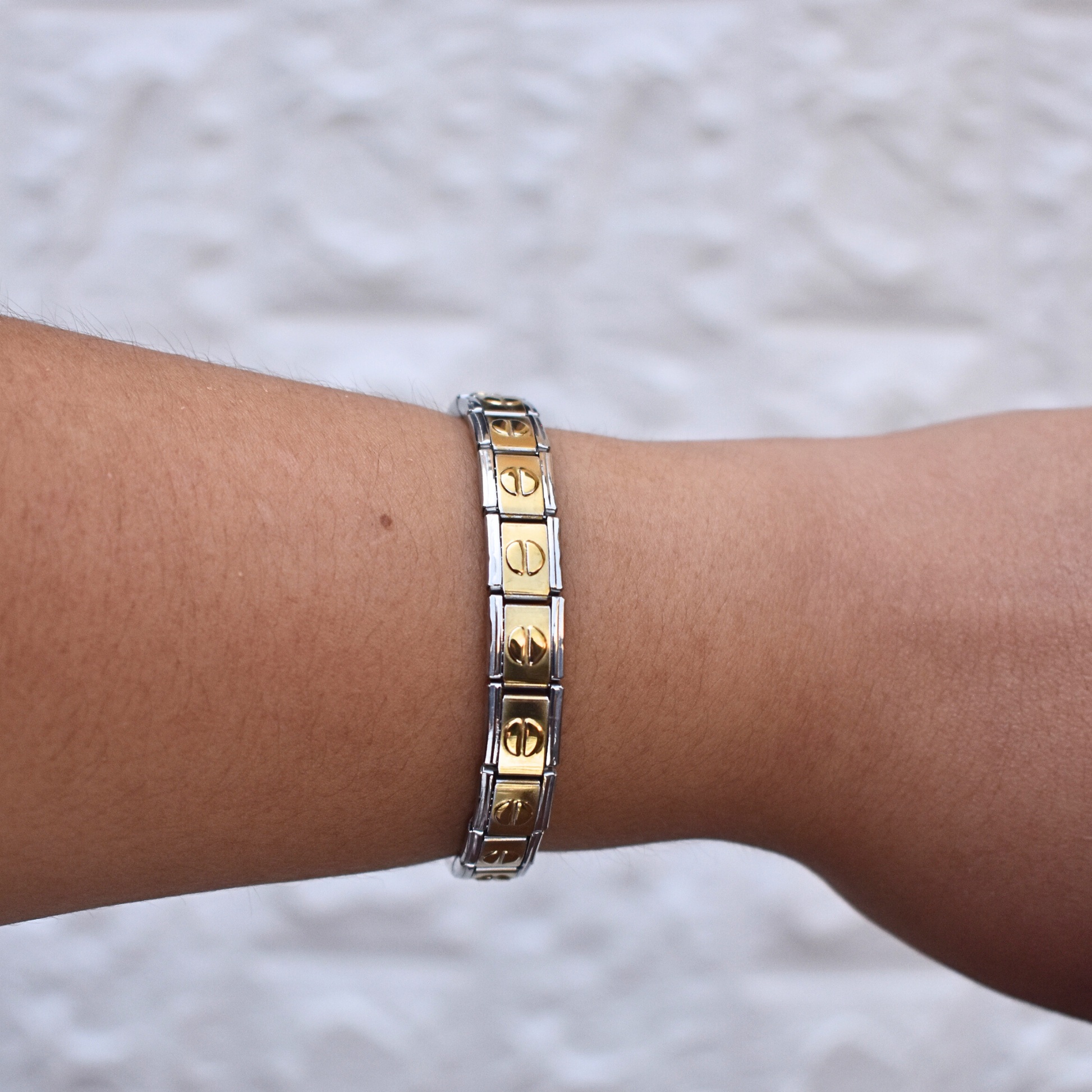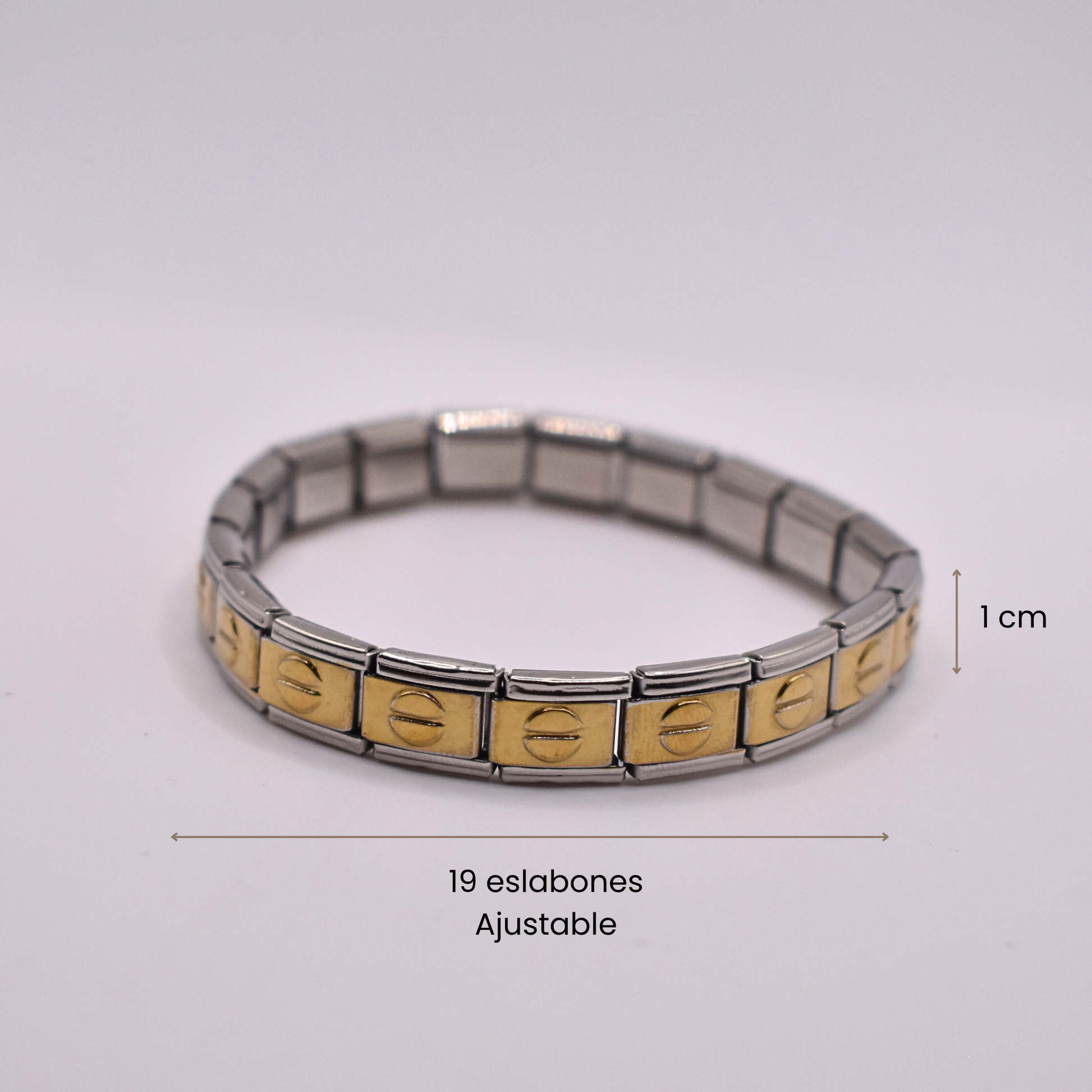 Luce un estilo único con el brazalete italiano Keyla, en dorado con borde plateado y un elegante detalle circular al centro. Ajustable a la medida que prefieras.