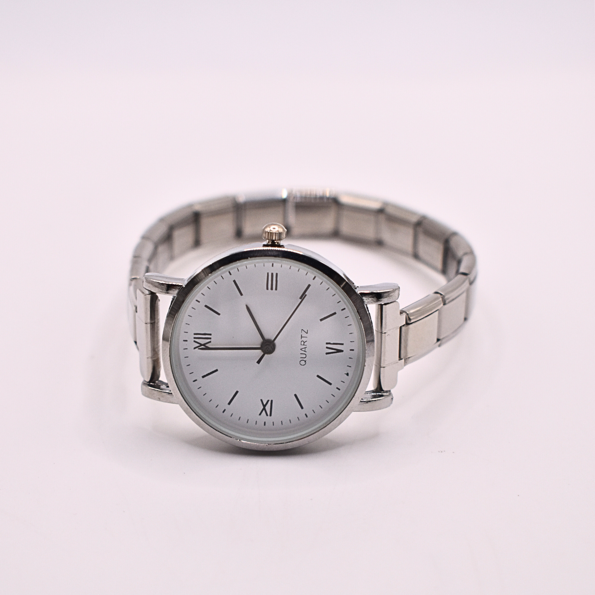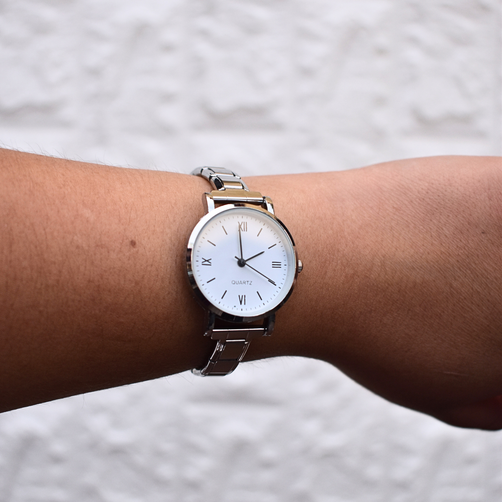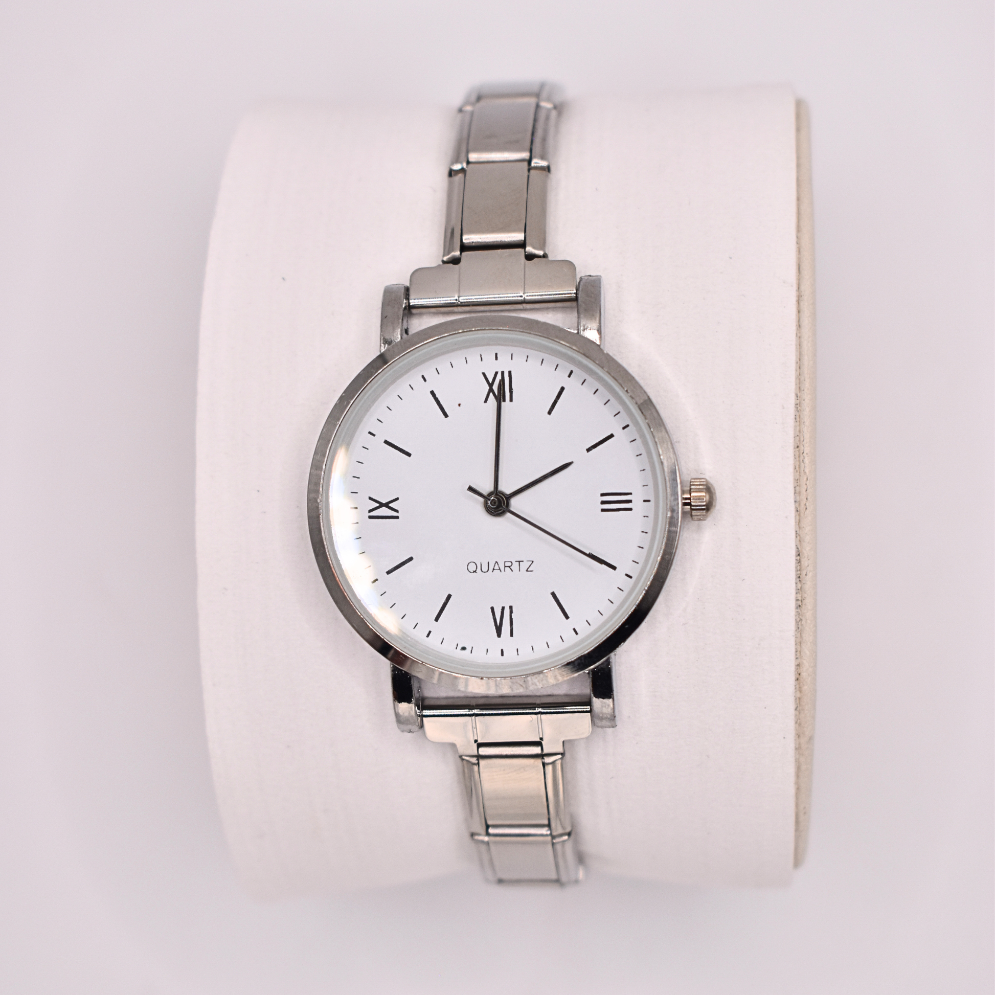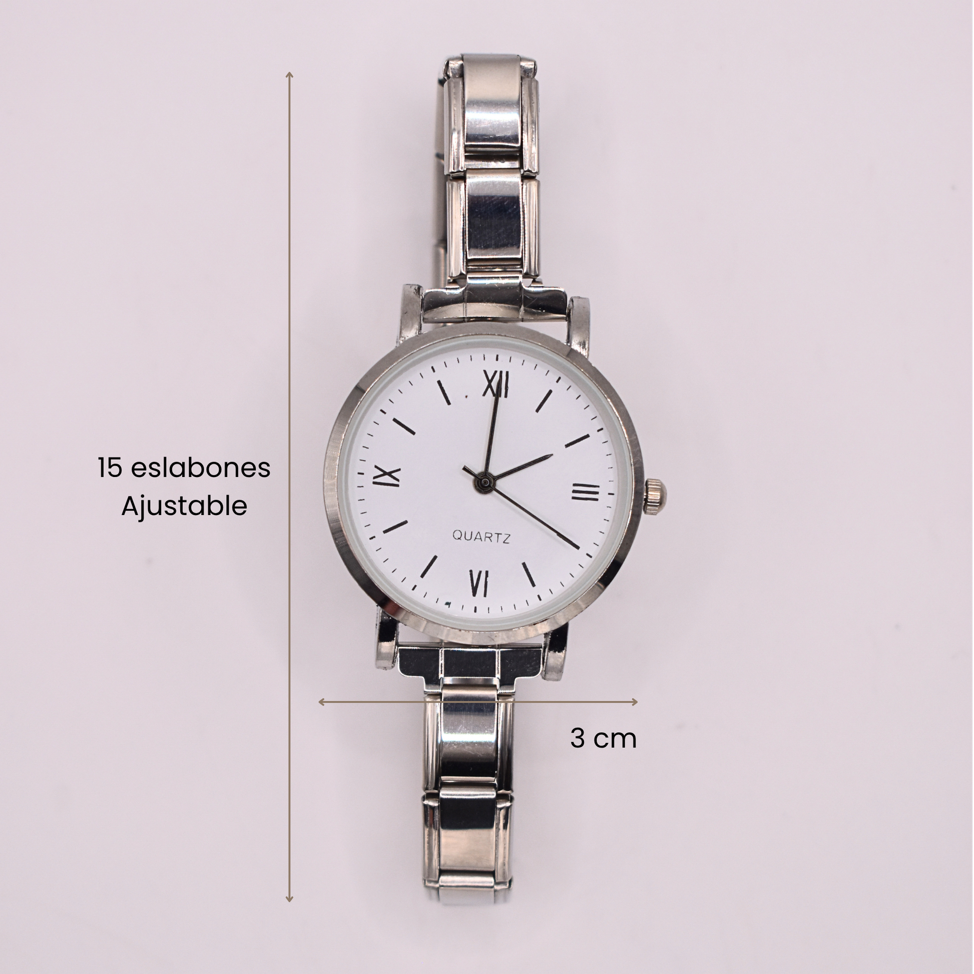 El reloj italiano Lulus combina una carátula circular con números romanos y eslabones personalizables, creando un accesorio clásico y atemporal.