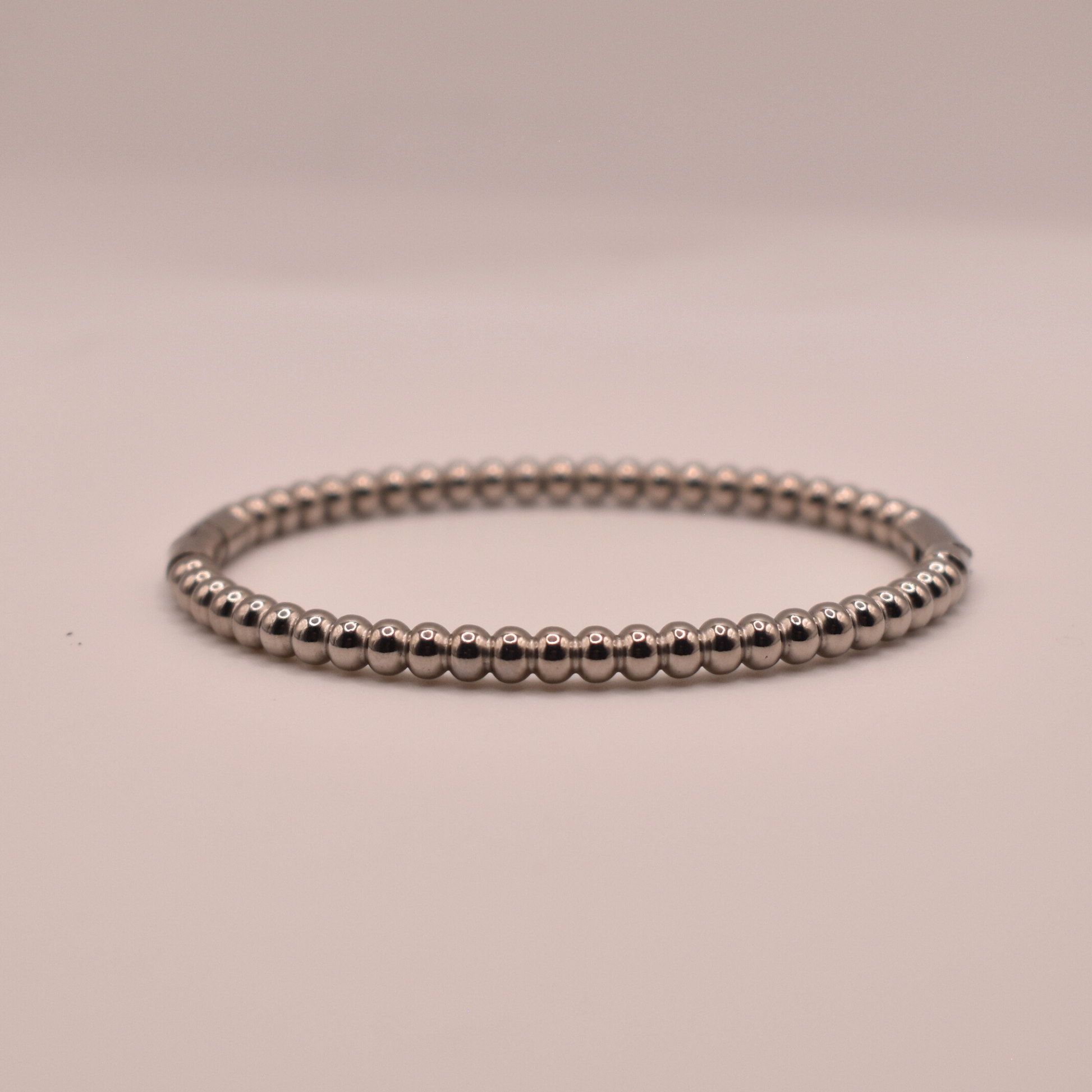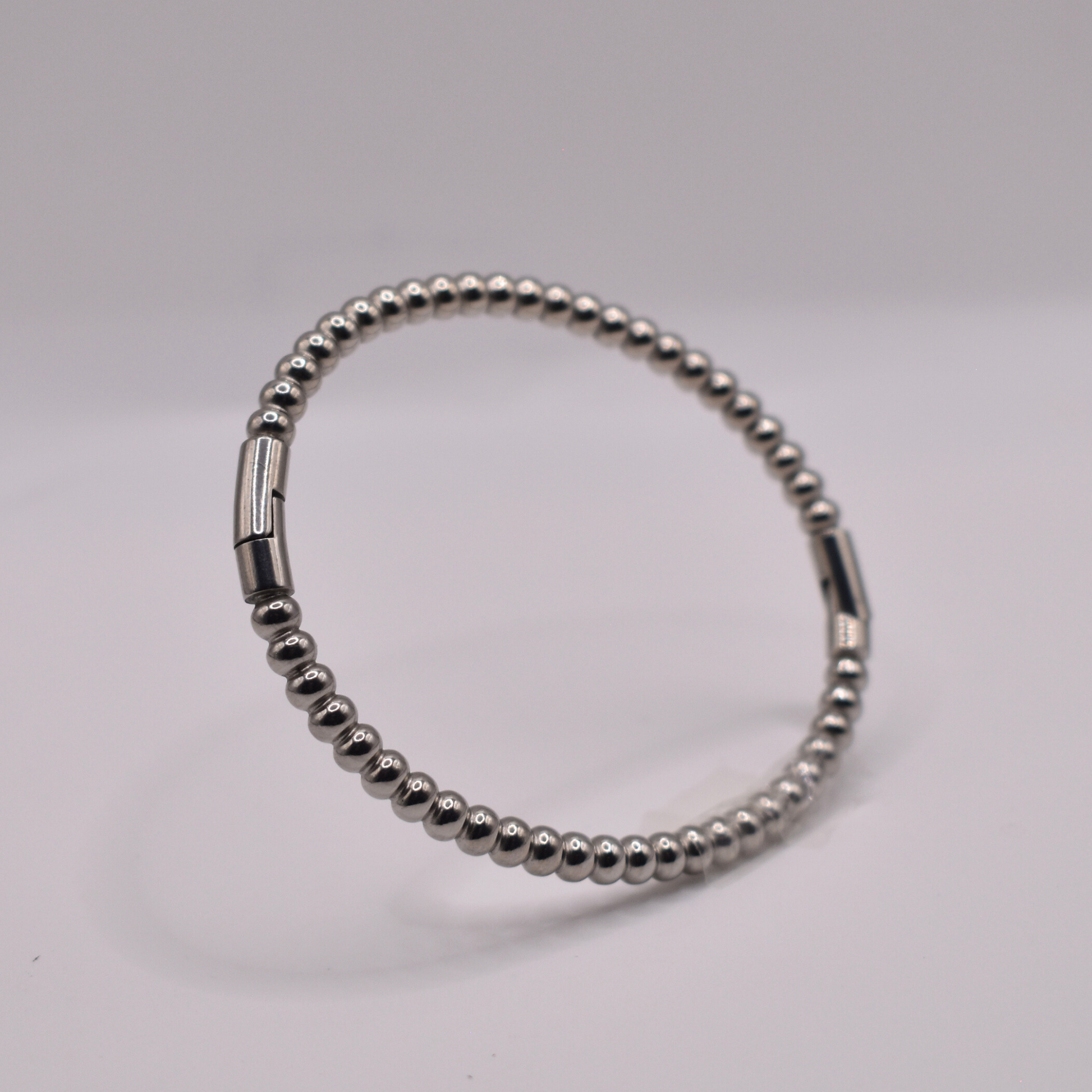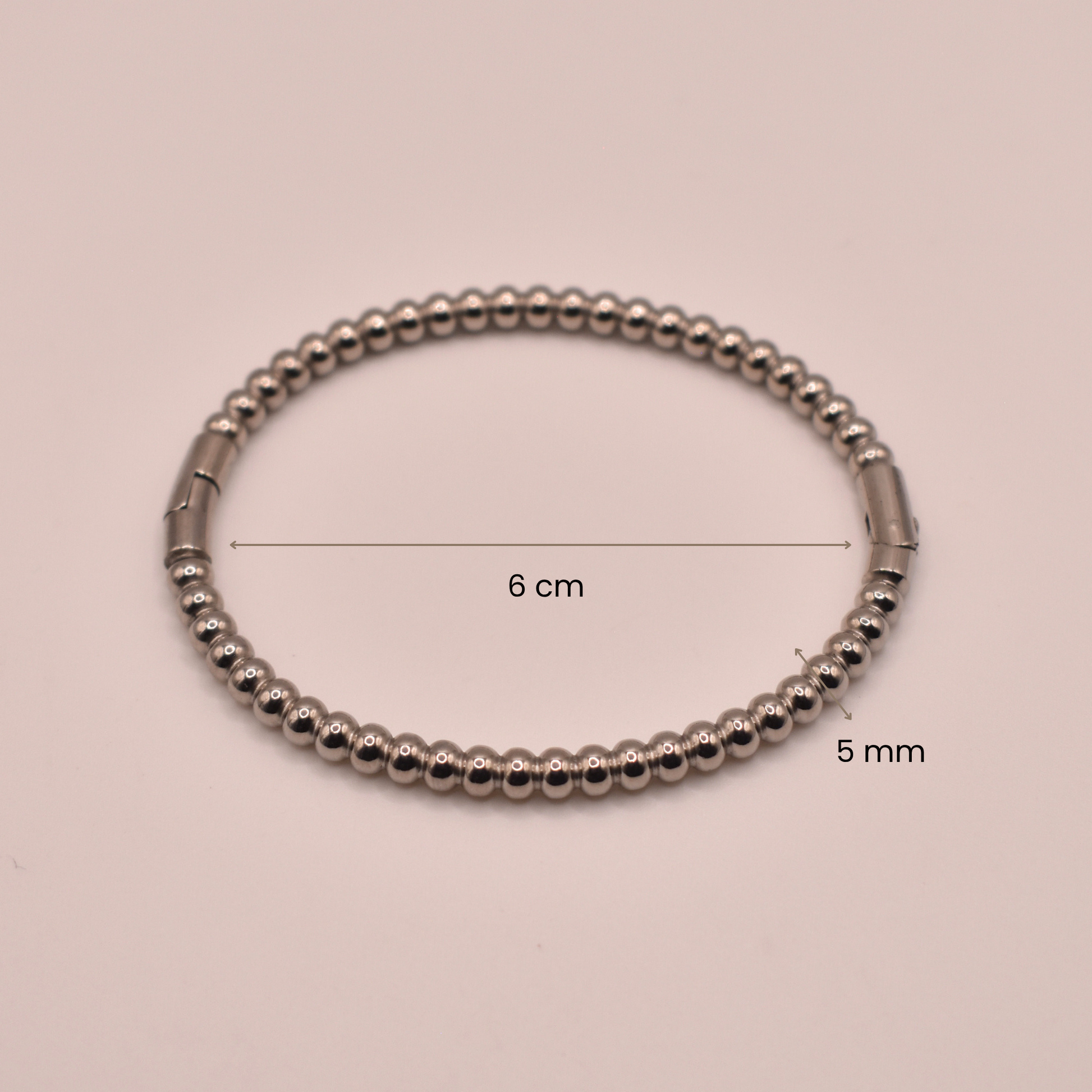 Inspirada en el diseño italiano, la pulsera Lumeri presenta esferas metálicas plateadas con cierre magnético. Su acabado brillante aporta un toque moderno y versátil que combina con todo.