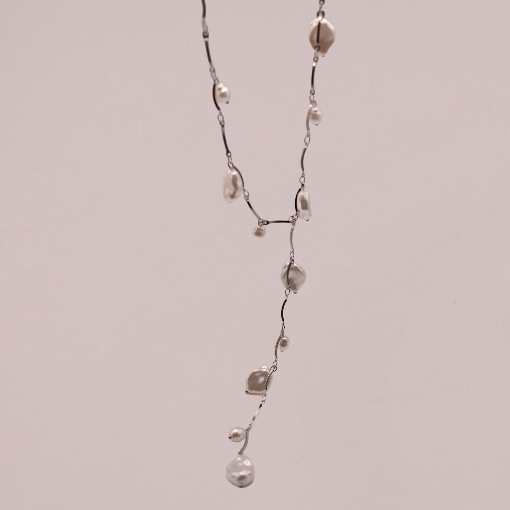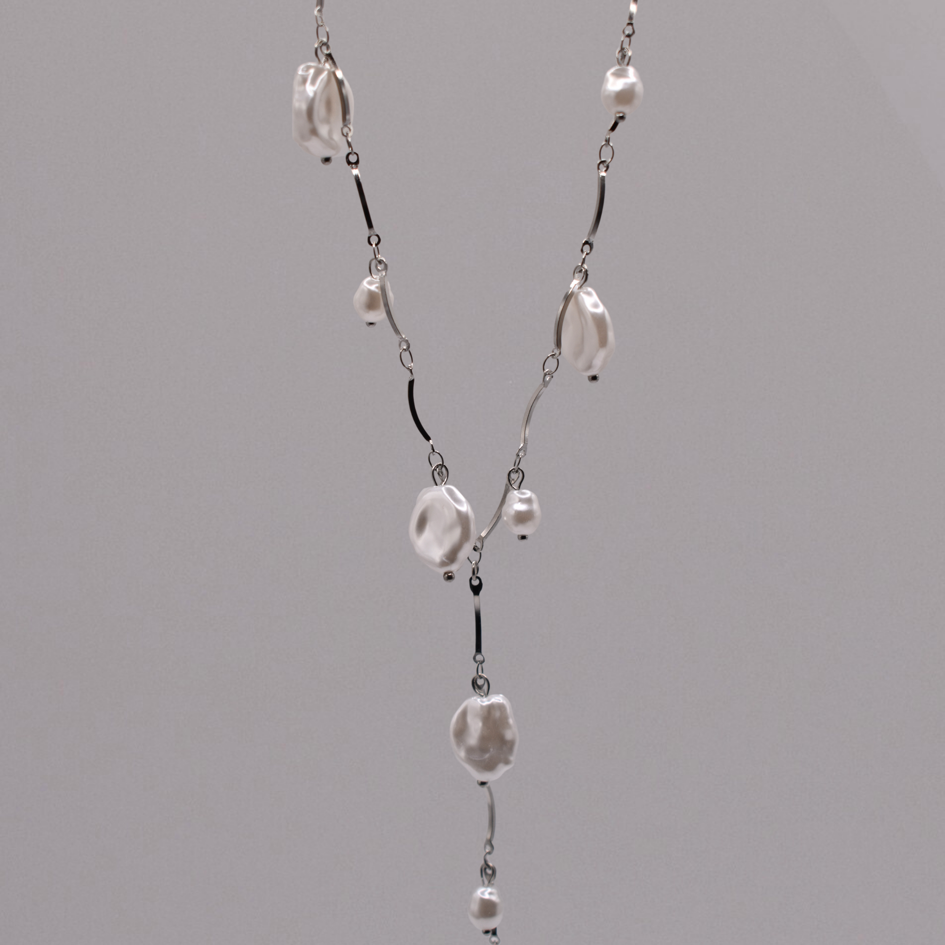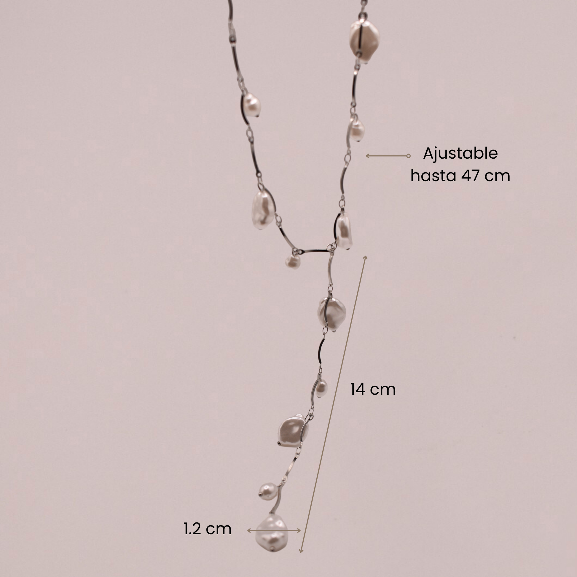 La cadena Meri es un collar de acero inoxidable con estructura lineal plateada que combina simulación de perlas en distintos tamaños, perfecta para looks modernos y layering.