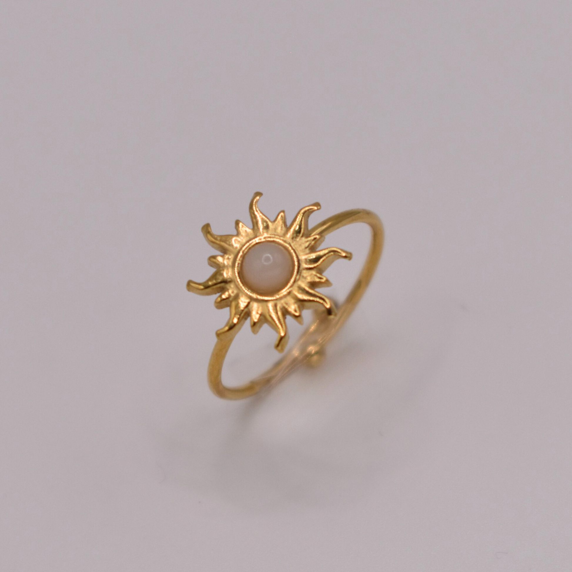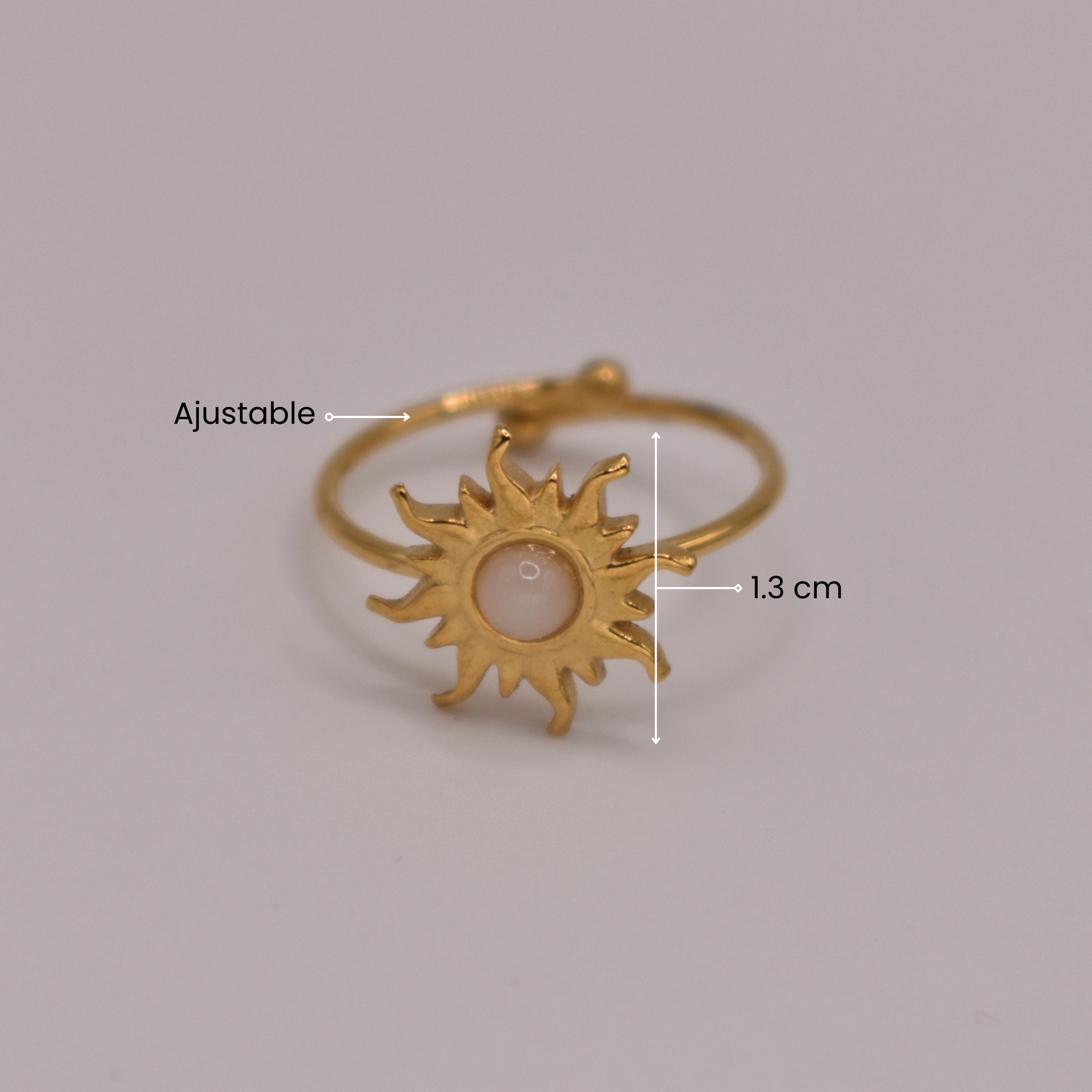 Nefra luce un diseño de sol con un centro blanco brillante, una joya que irradia luz y calma con un estilo delicado.