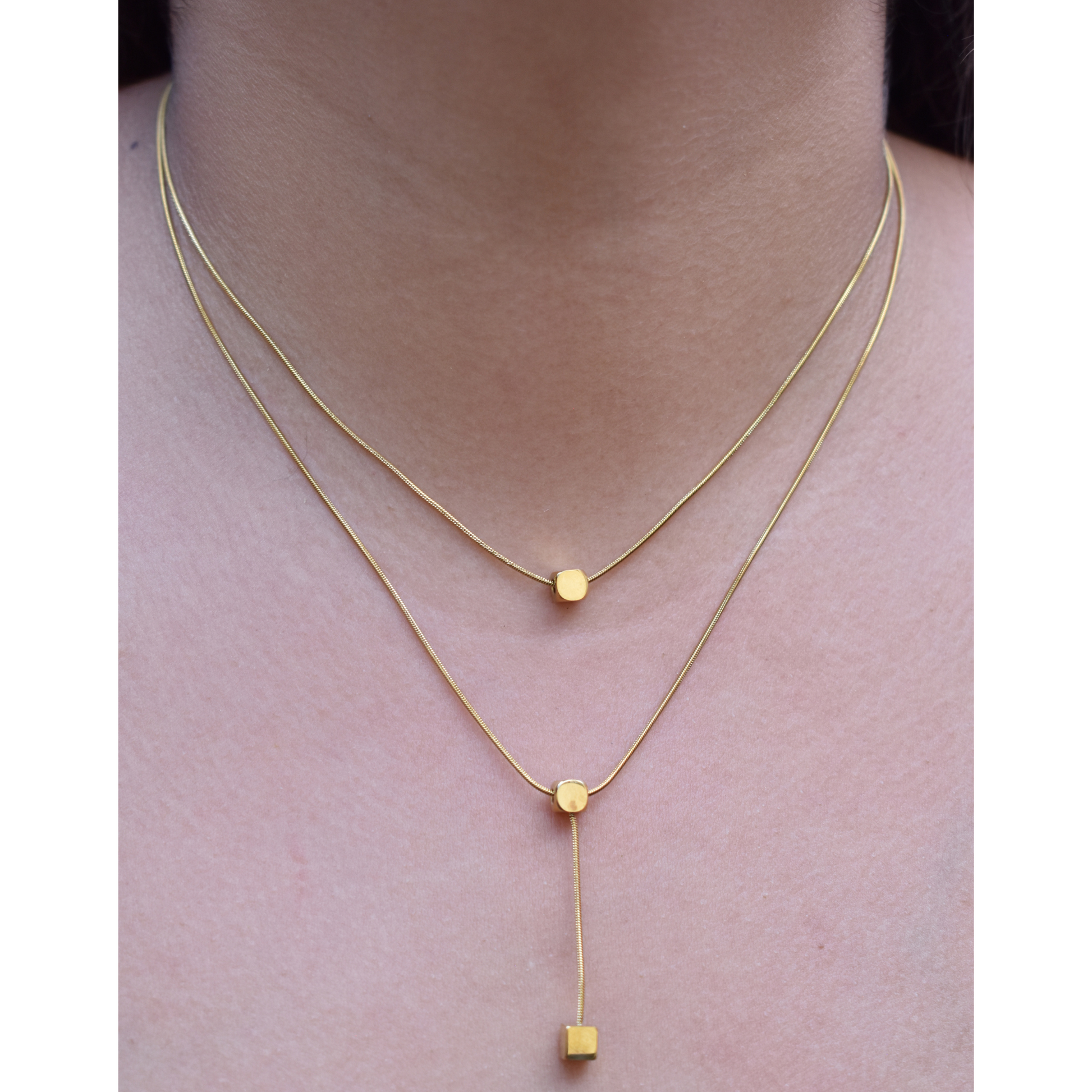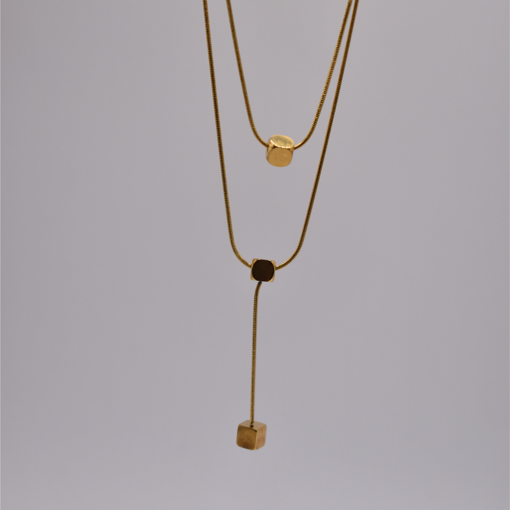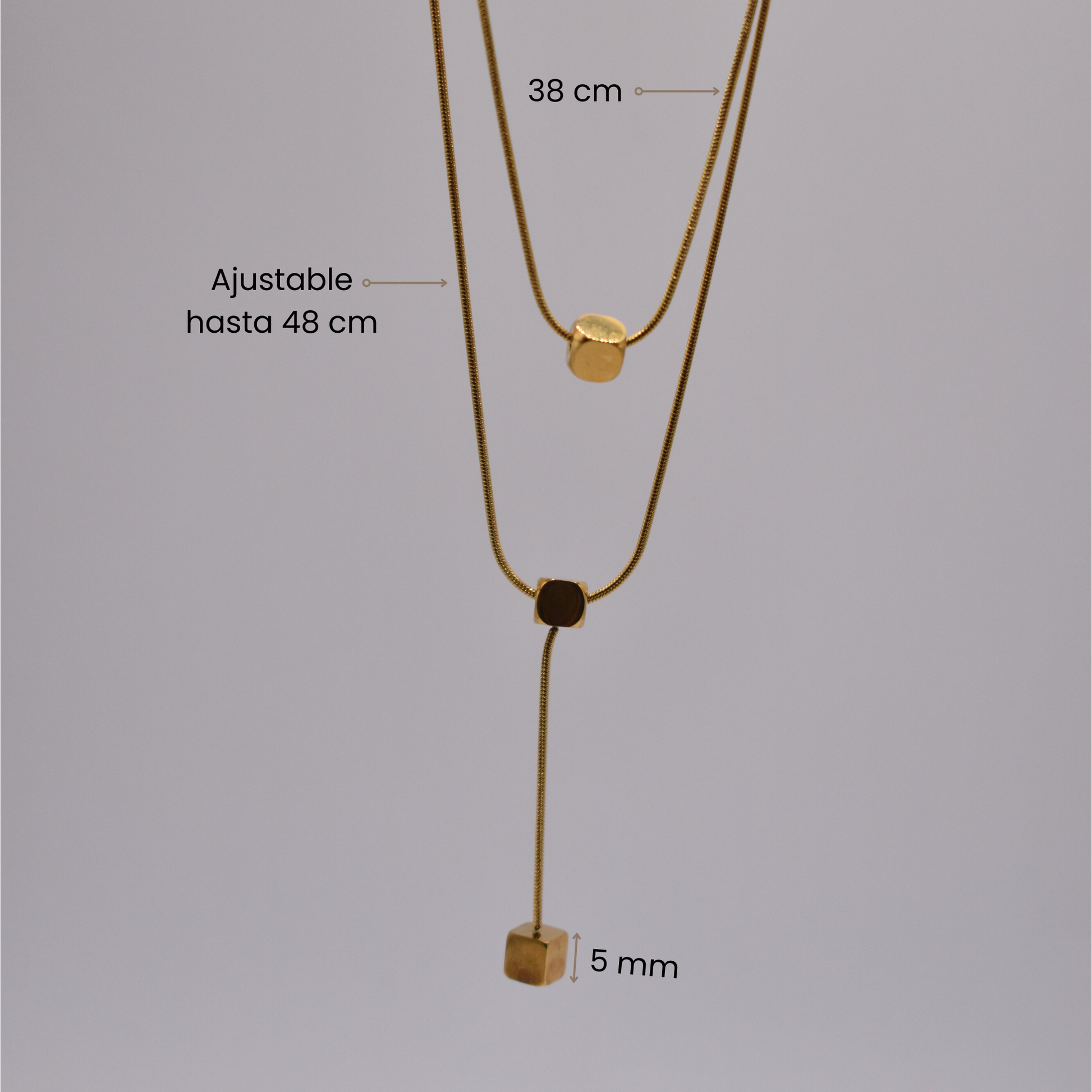 Collar doble con tres cubos (mate y pulido), Nereida es el ideal para layering con volúmenes geométricos modernos.