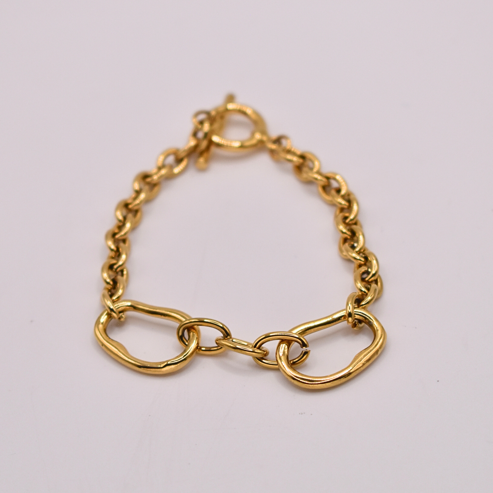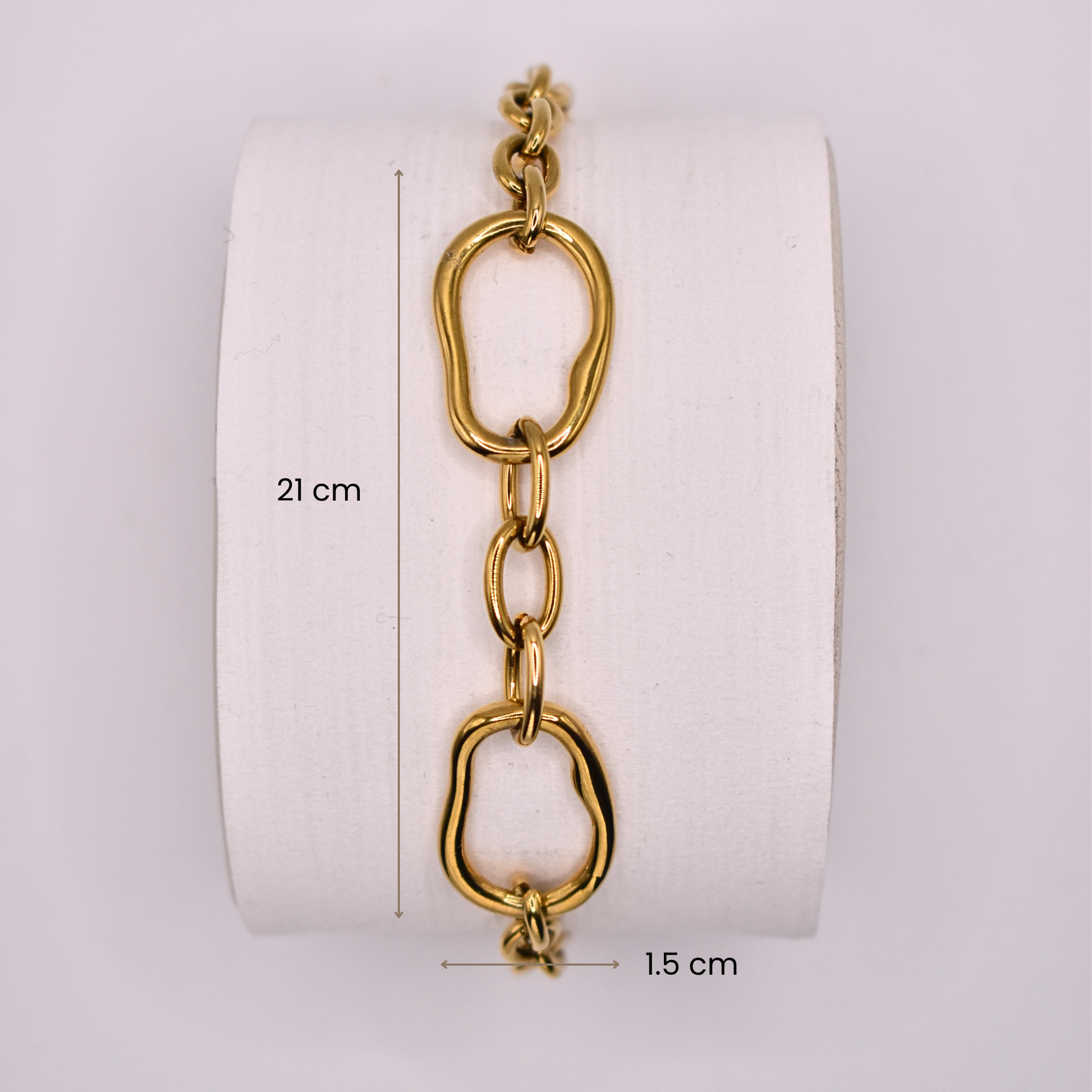 La pulsera chunky Pamela en dorado presenta círculos irregulares que aportan un toque artístico y moderno a tu outfit.