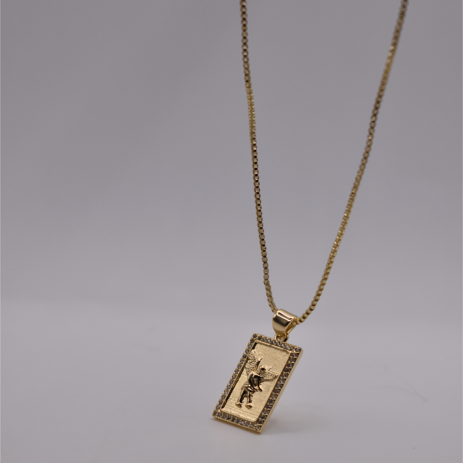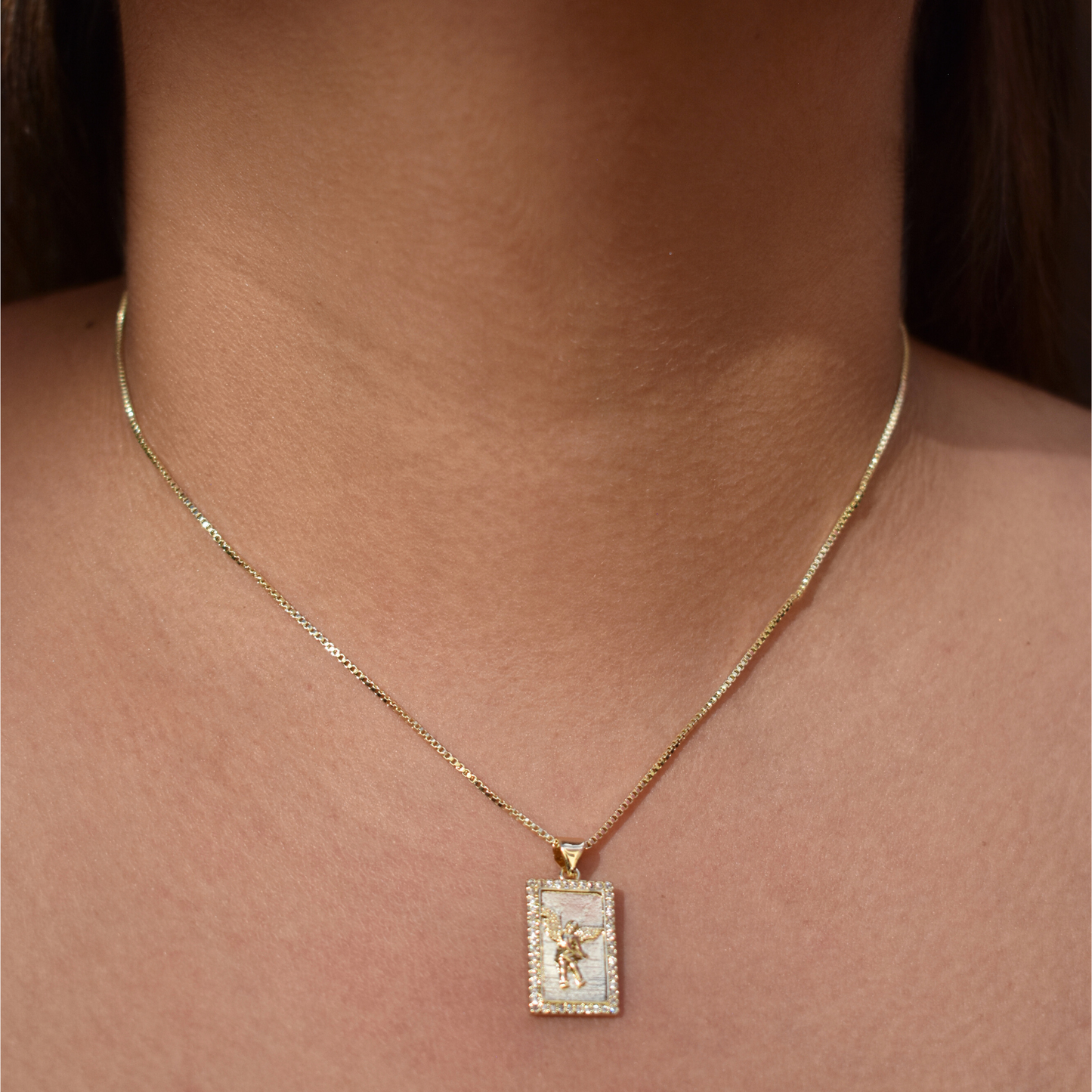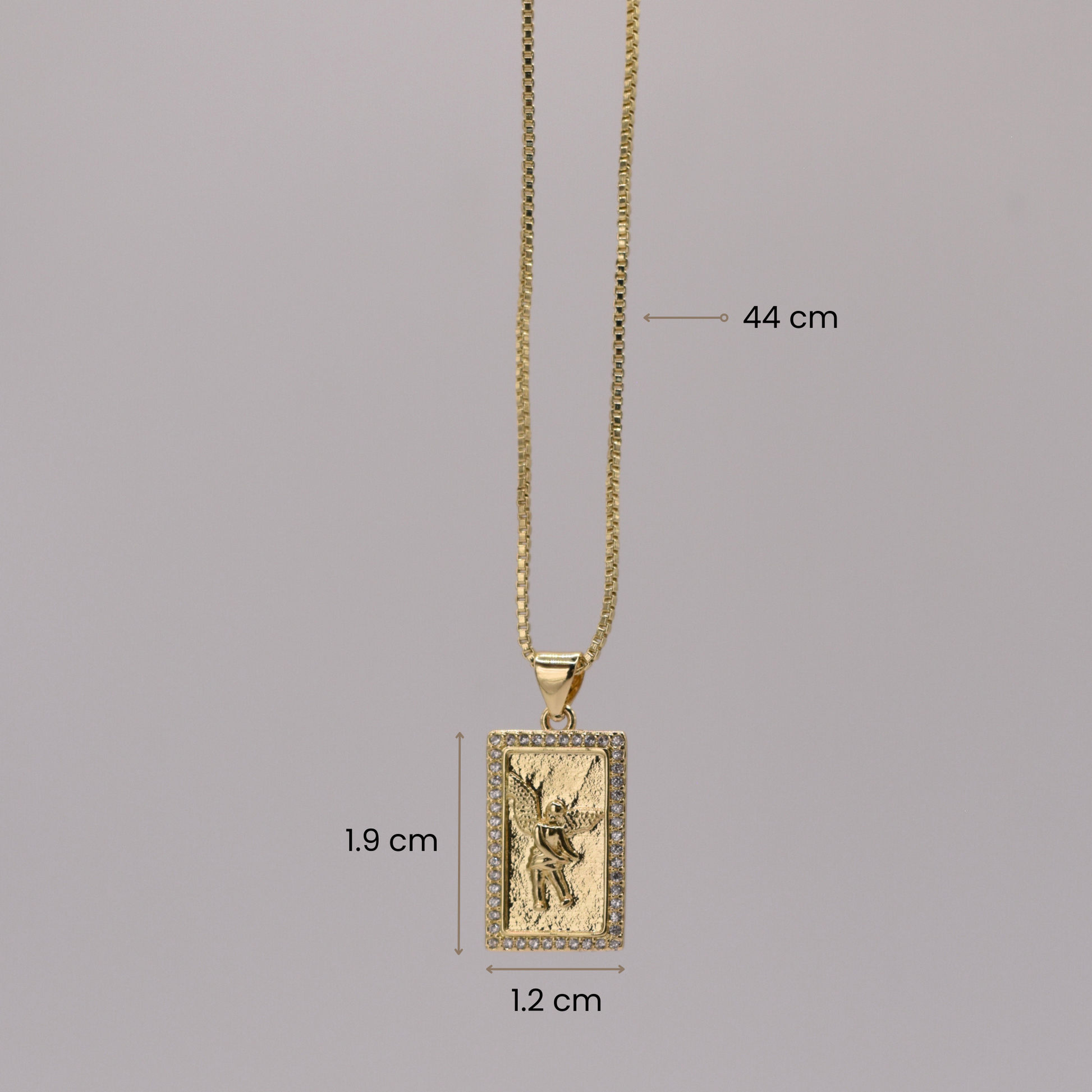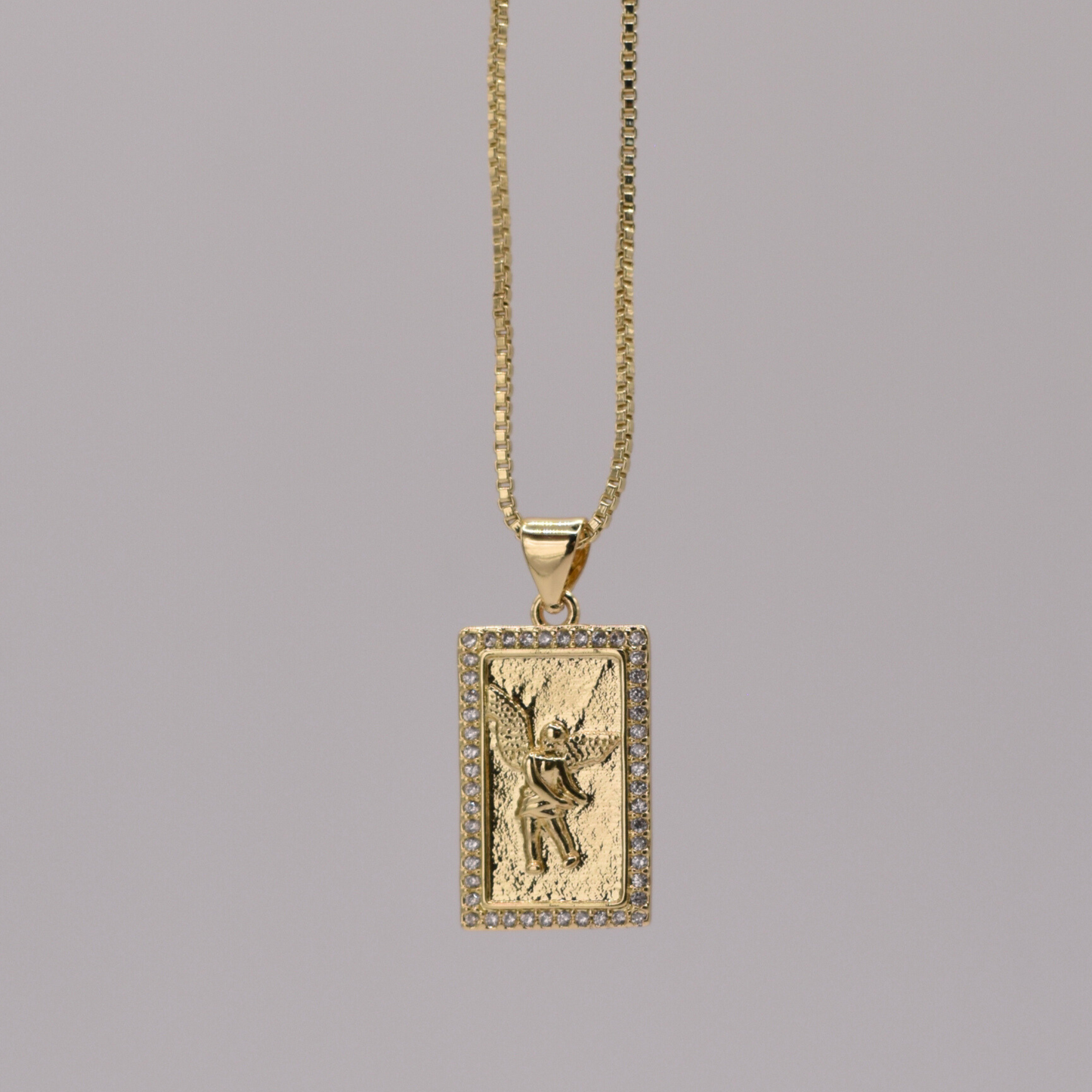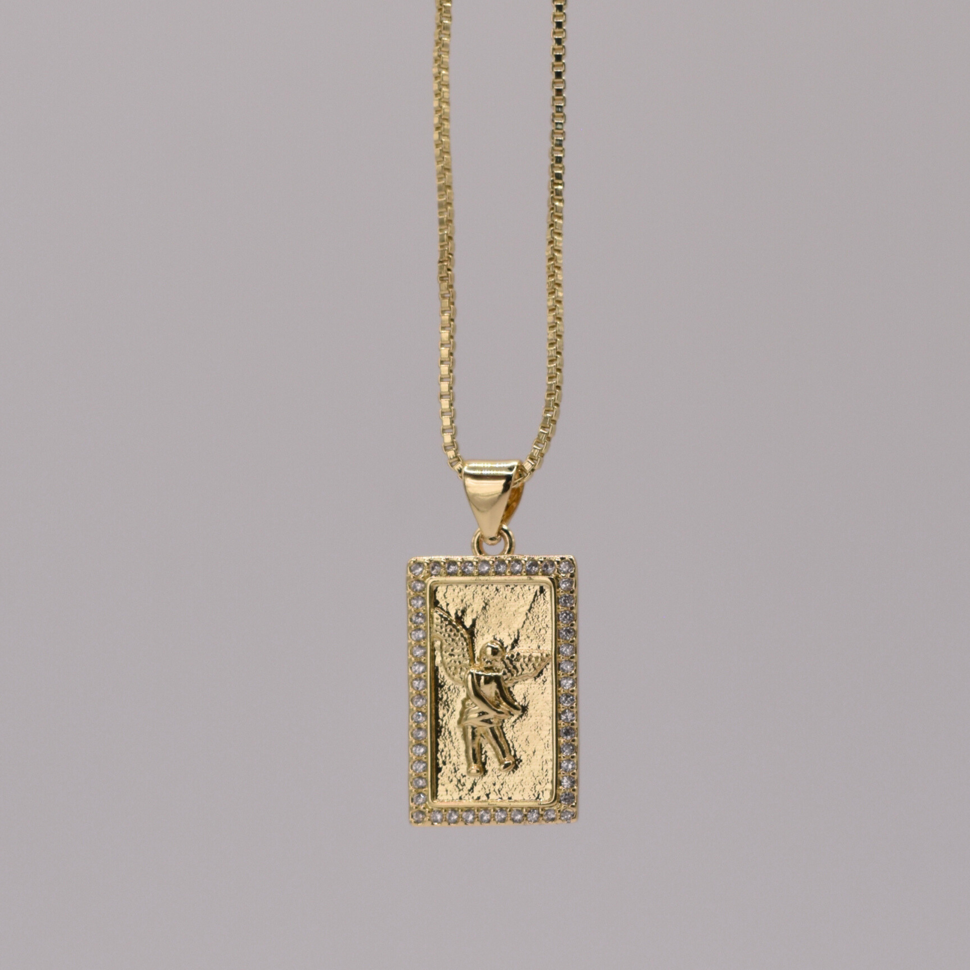 Collar con dije de placa con arcángel y brillos, Proteo tiene un enfoque espiritual integrado en looks stacked de tendencia bold.