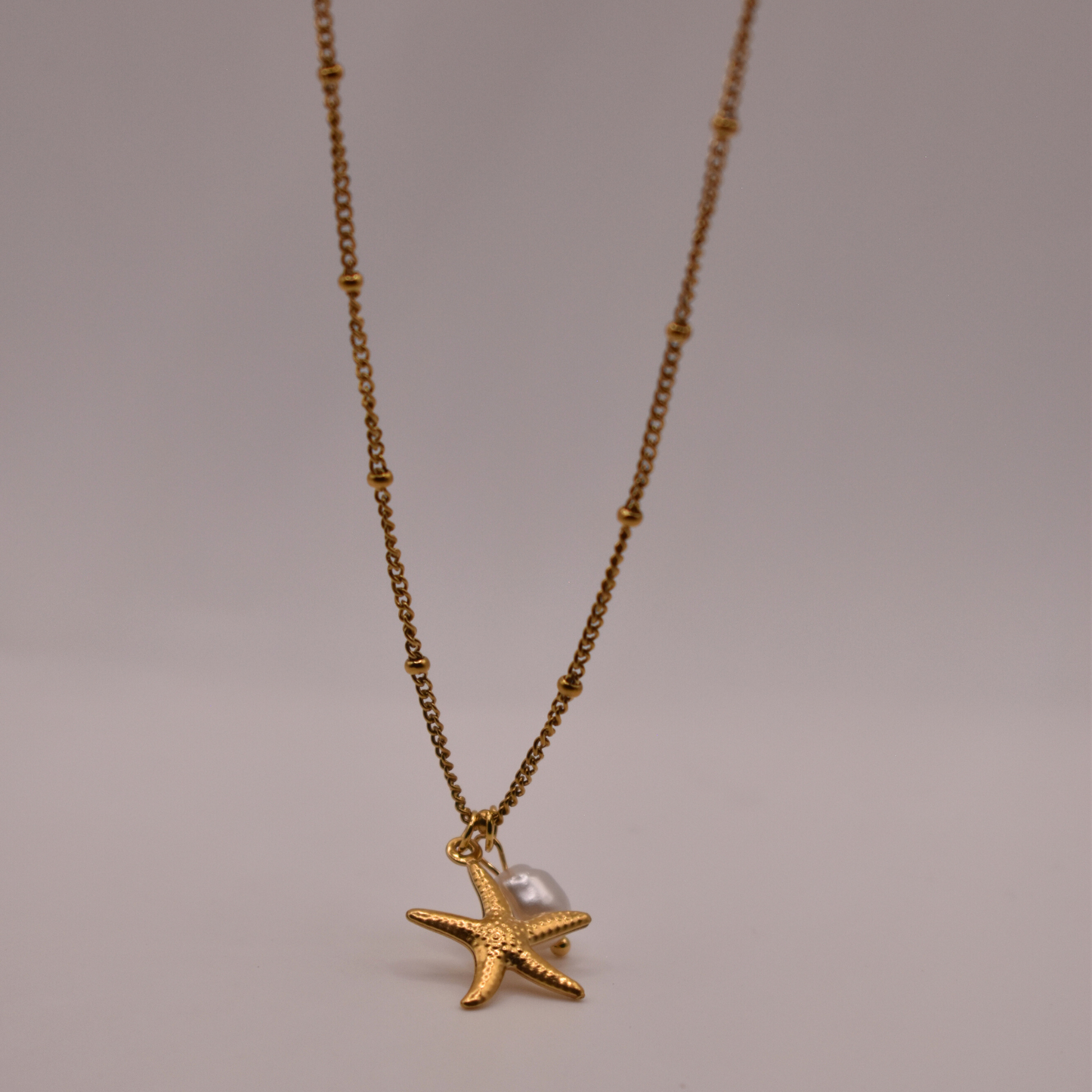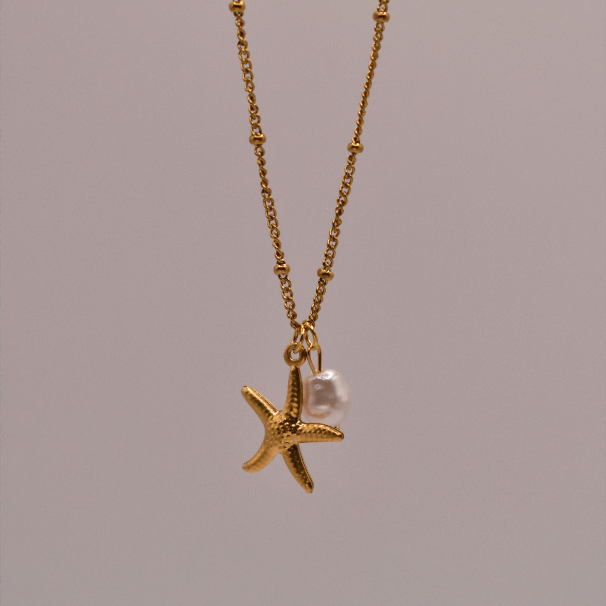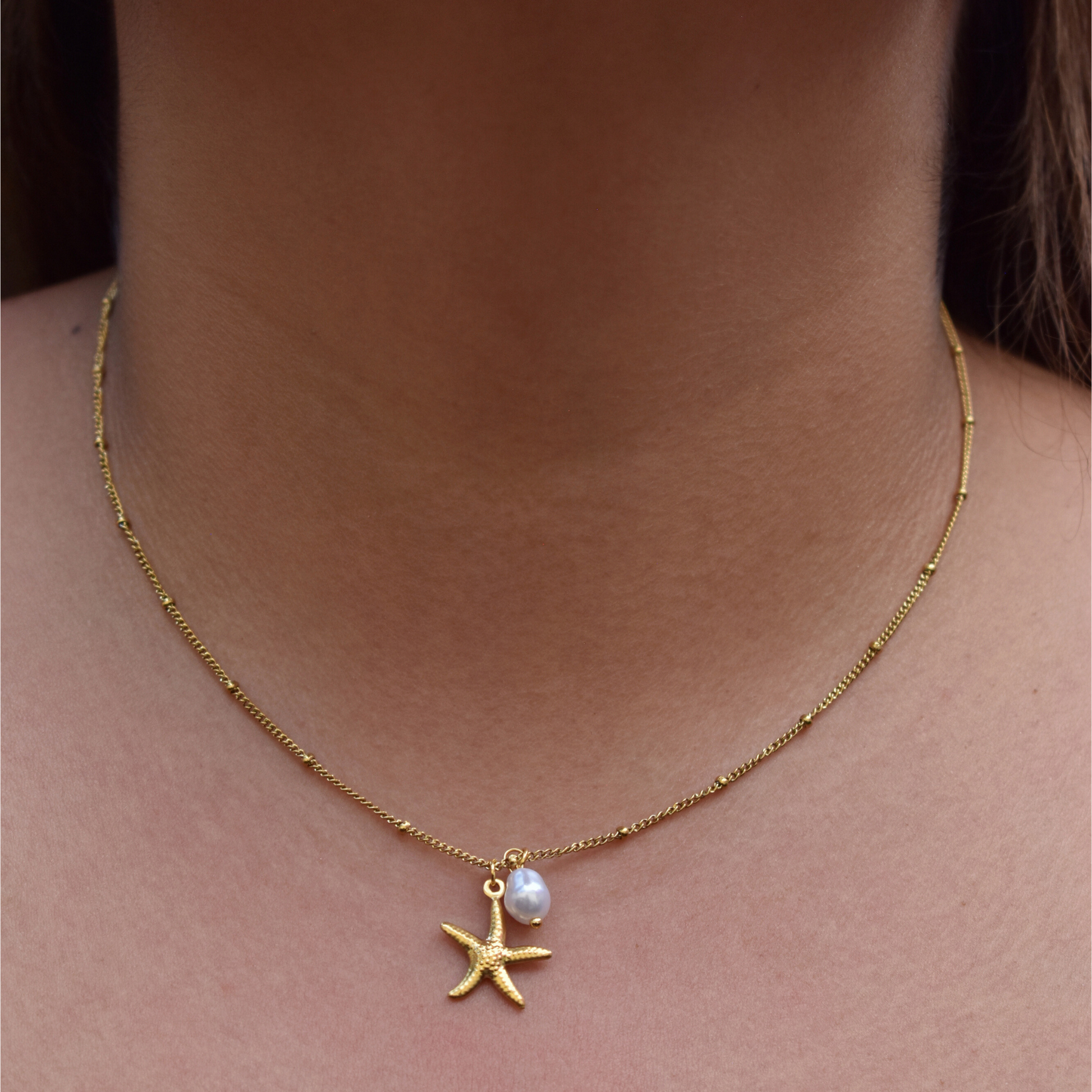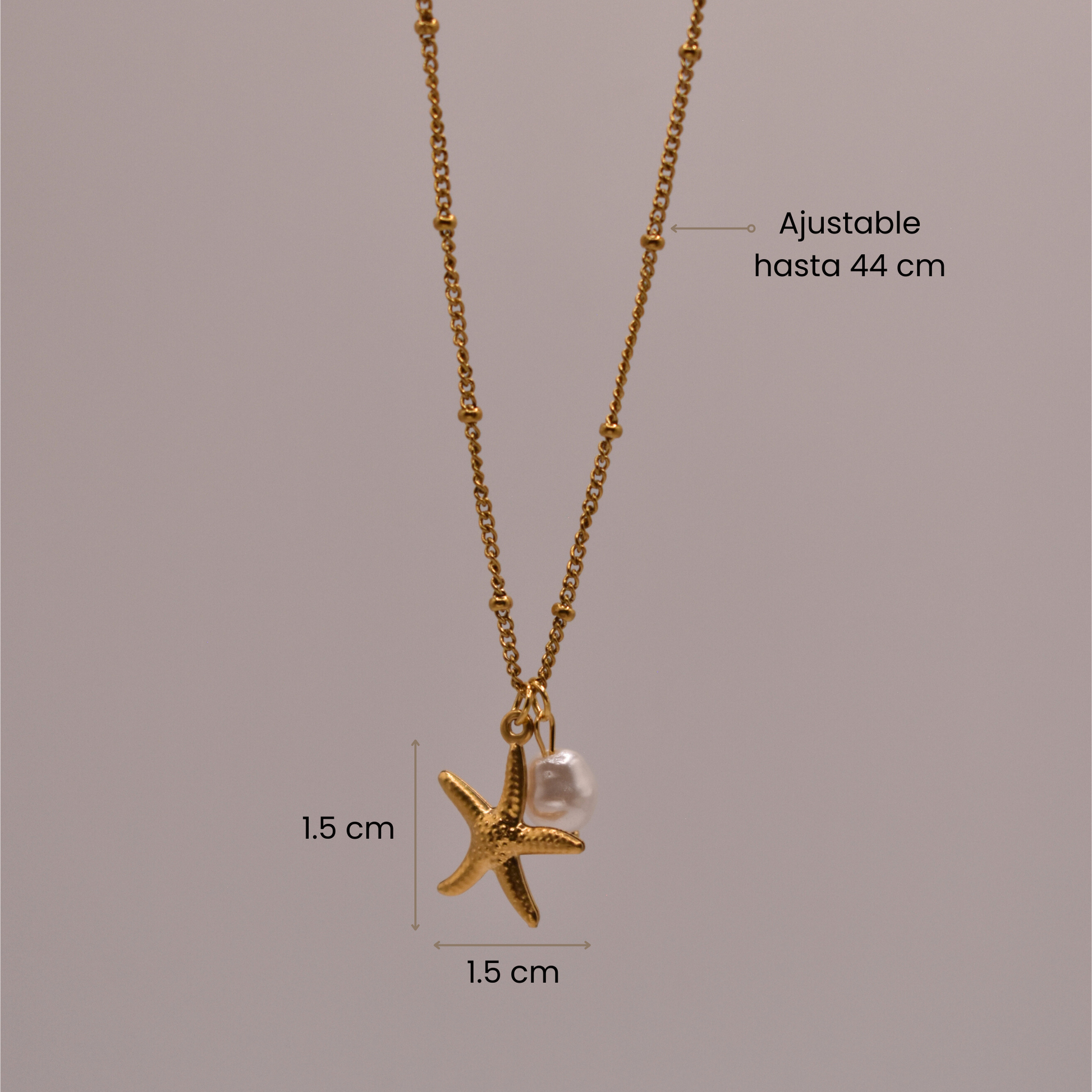 Dije de estrella de mar con perla, esencia marina y elegante, Unut combina bien con cadenas planas y esferas.