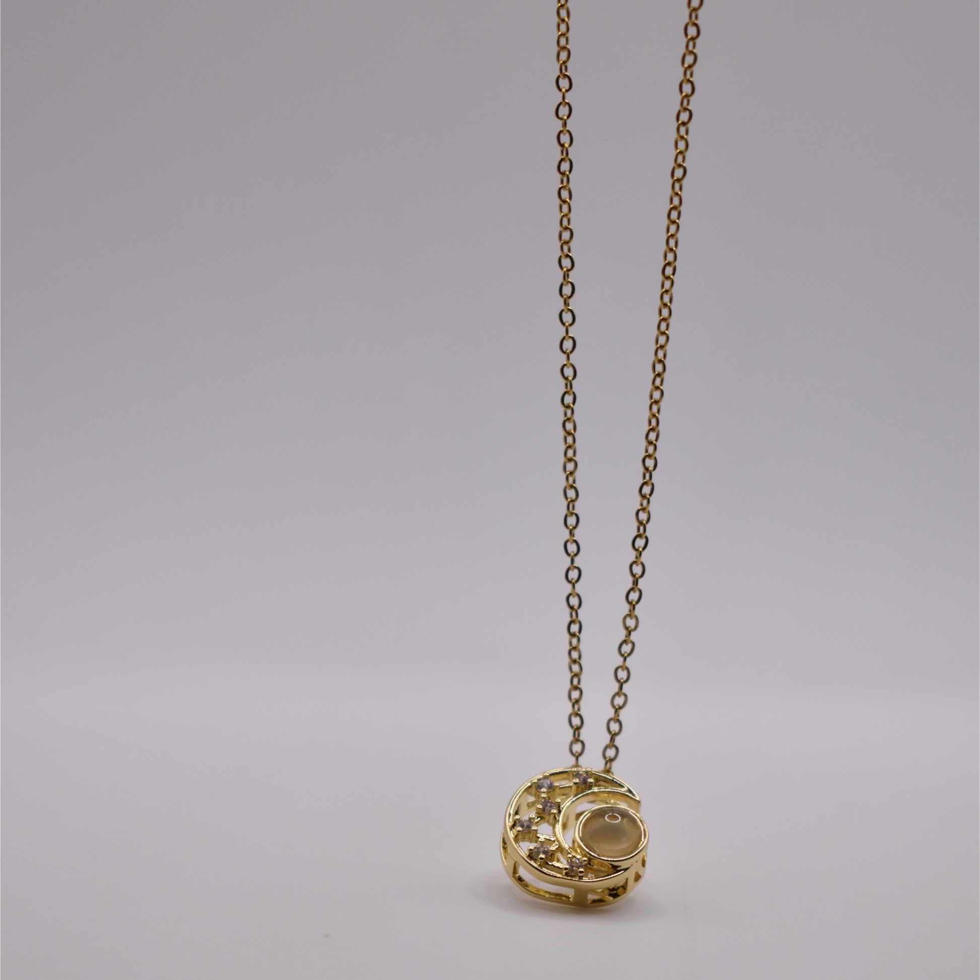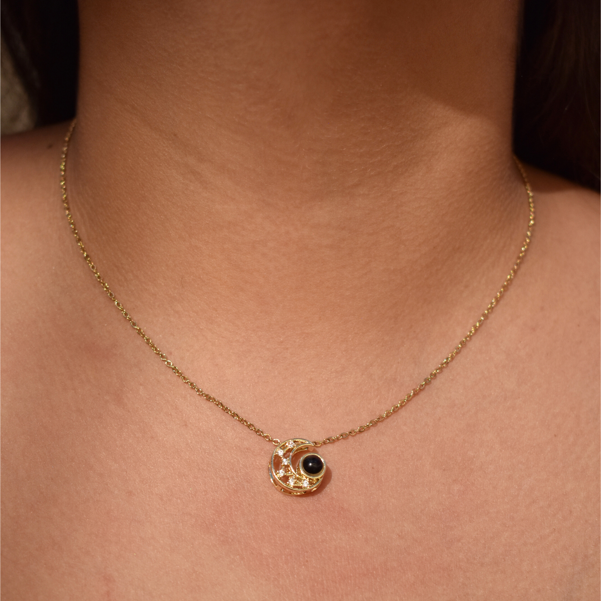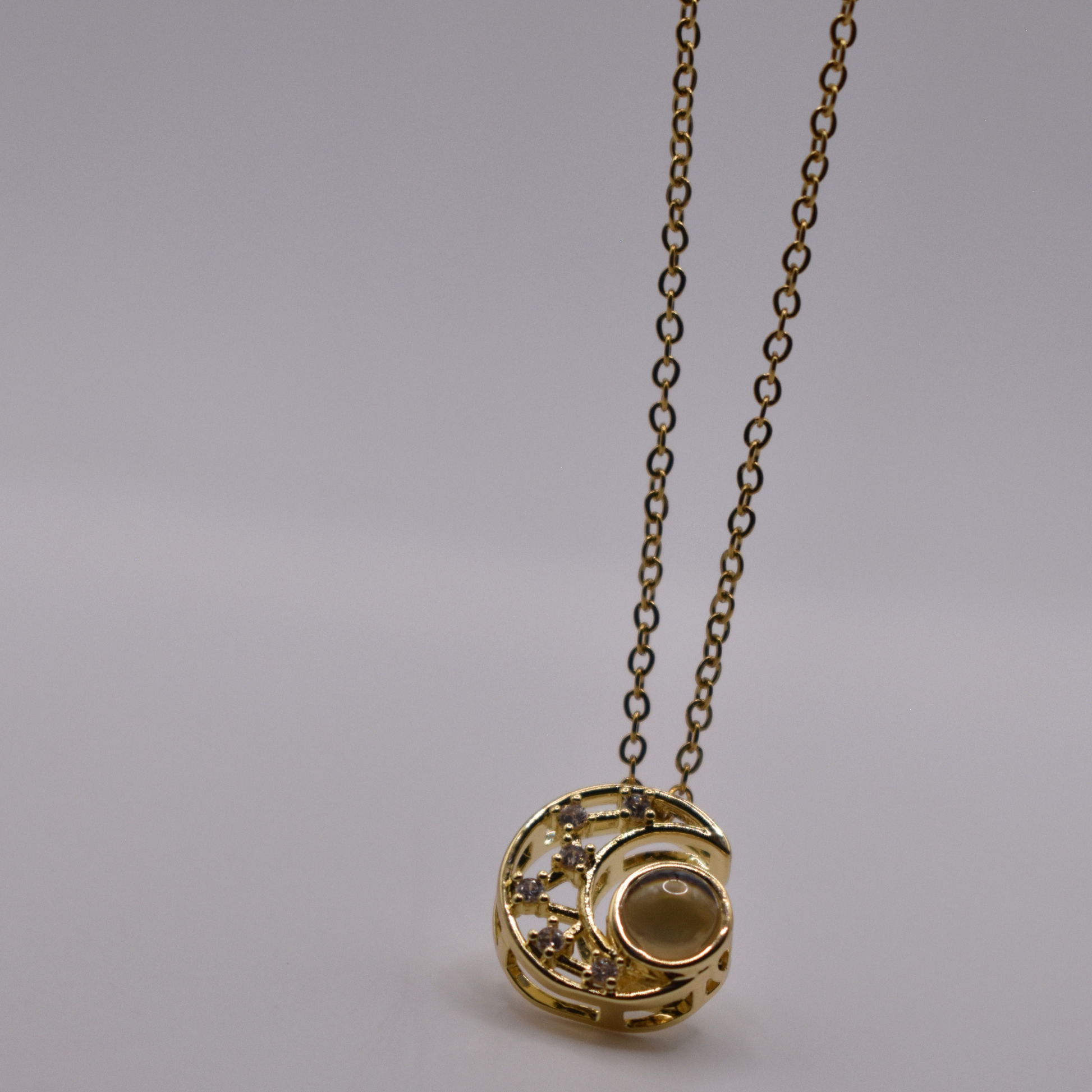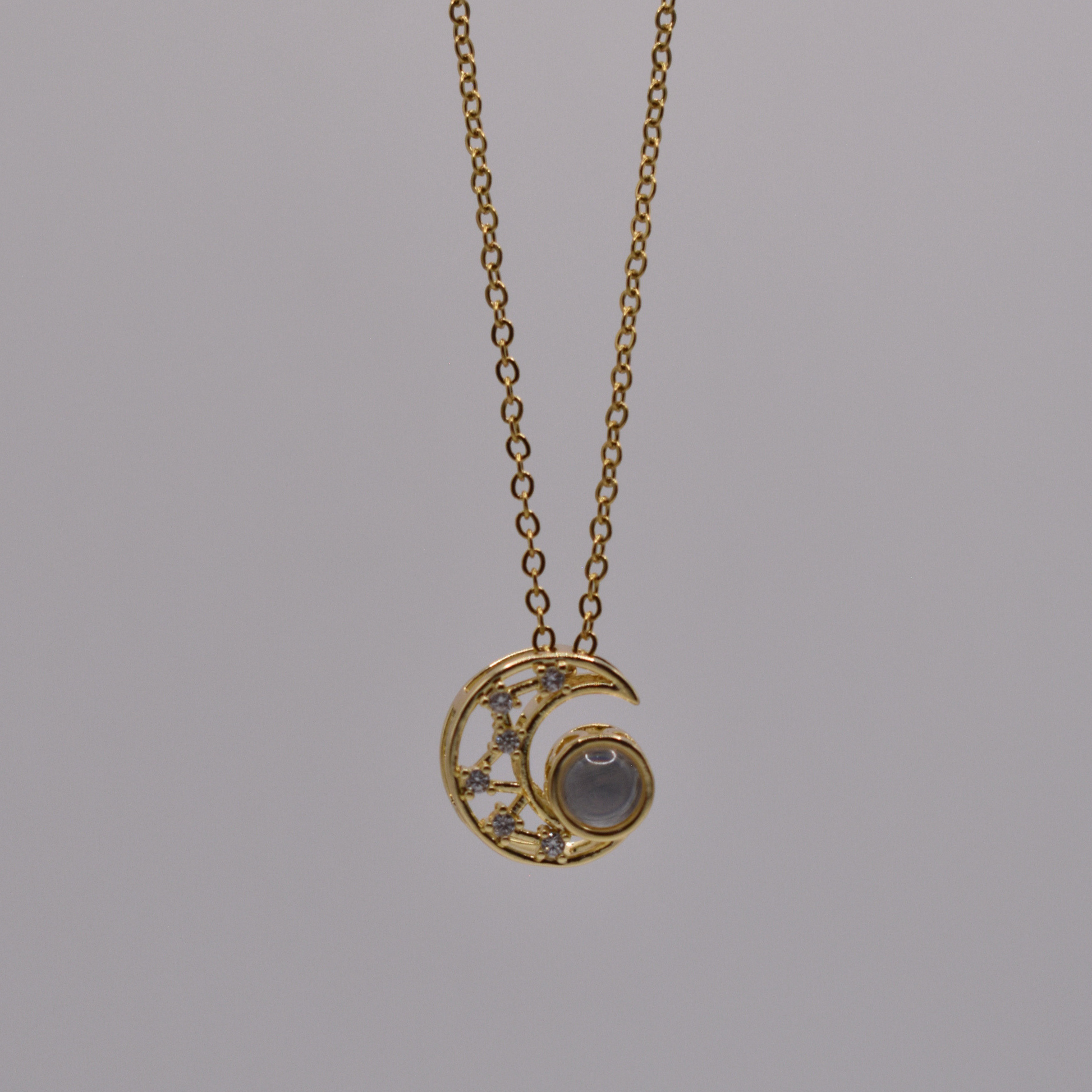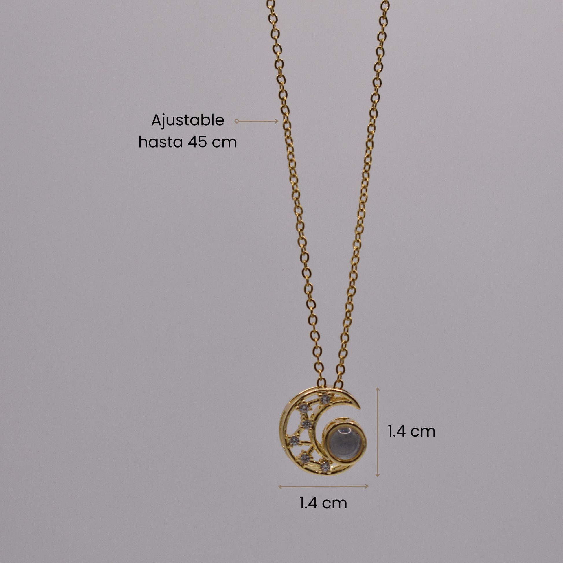Zoé collar con dije de luna con círculo donde puedes ver "te amo" en varios idiomas, toque personalizado y especial.